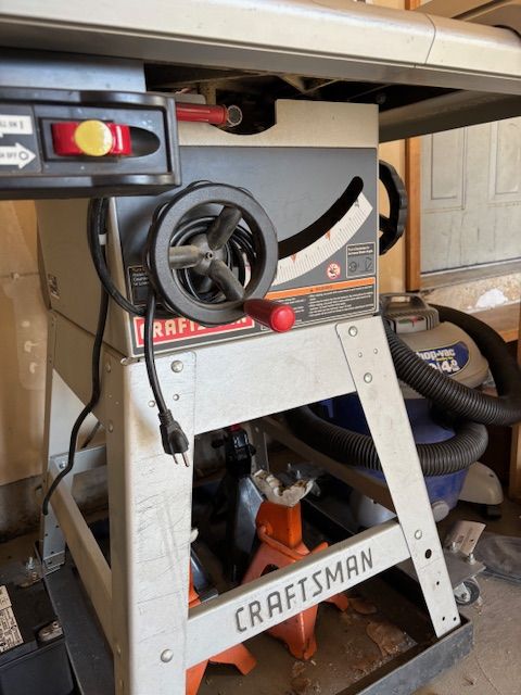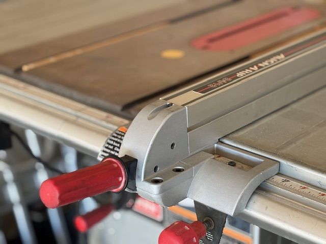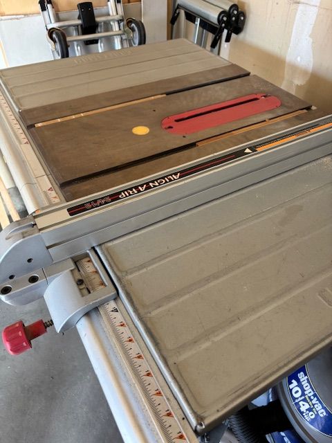 Venmo10 in contractor saw with mobile base. 24 in cut to the right of the blade, 12 in to the left.