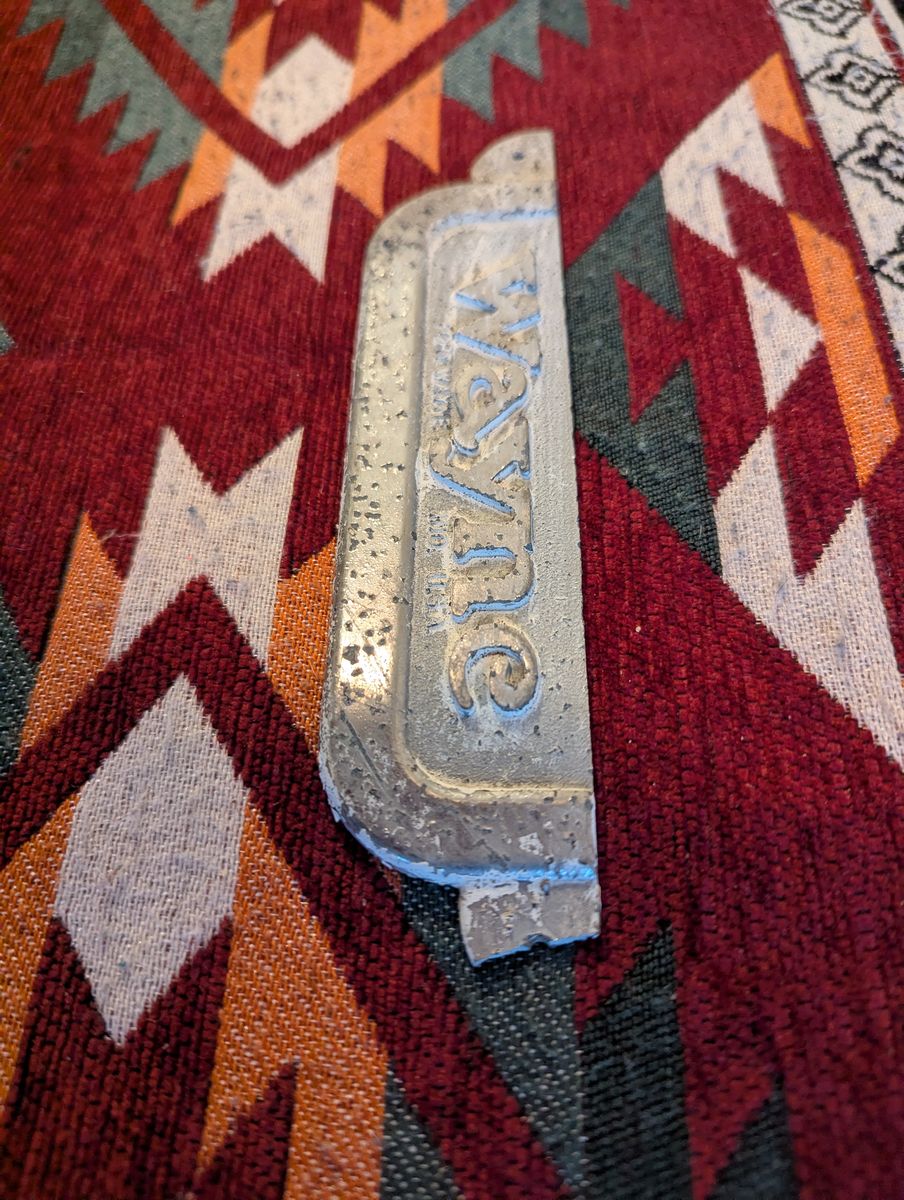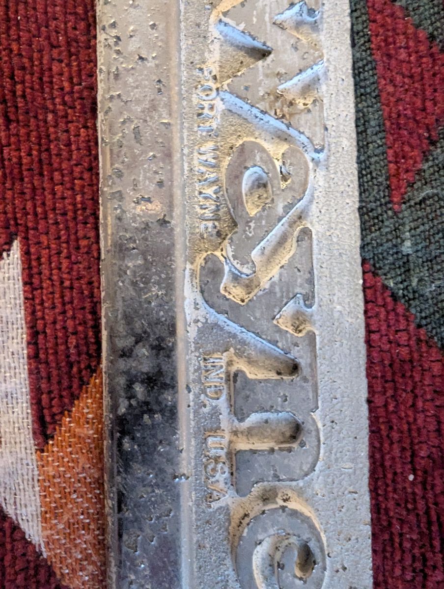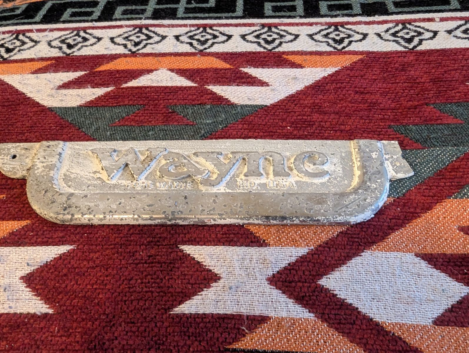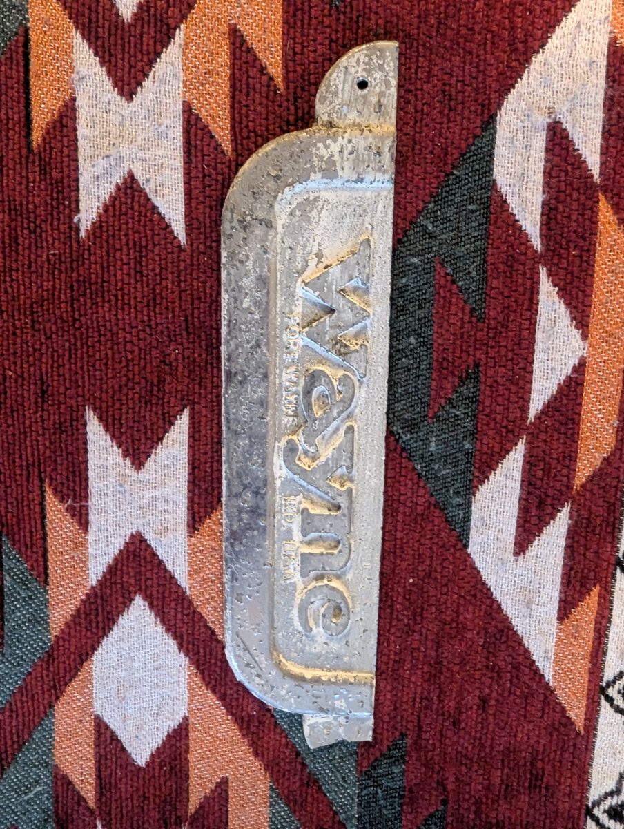 GooglePayCast metal Wayne badge with good age and patina. Solid display piece. Missing half of one wing.