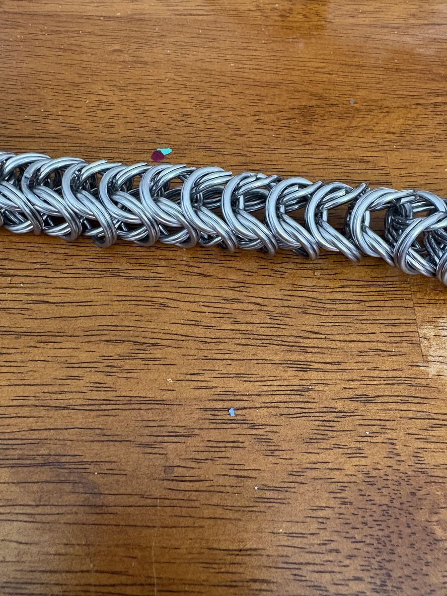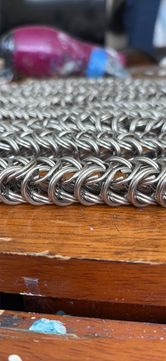 This is a fully handmade, 9-foot steel chain constructed from approximately 2,000+ interlinked half-inch split rings in a dense, reinforced chainmail weave. Built entirely by hand, this piece is extremely strong, flexible, and evenly tensioned throughout.