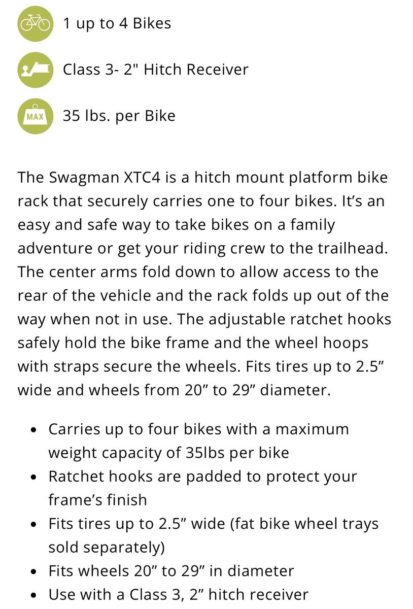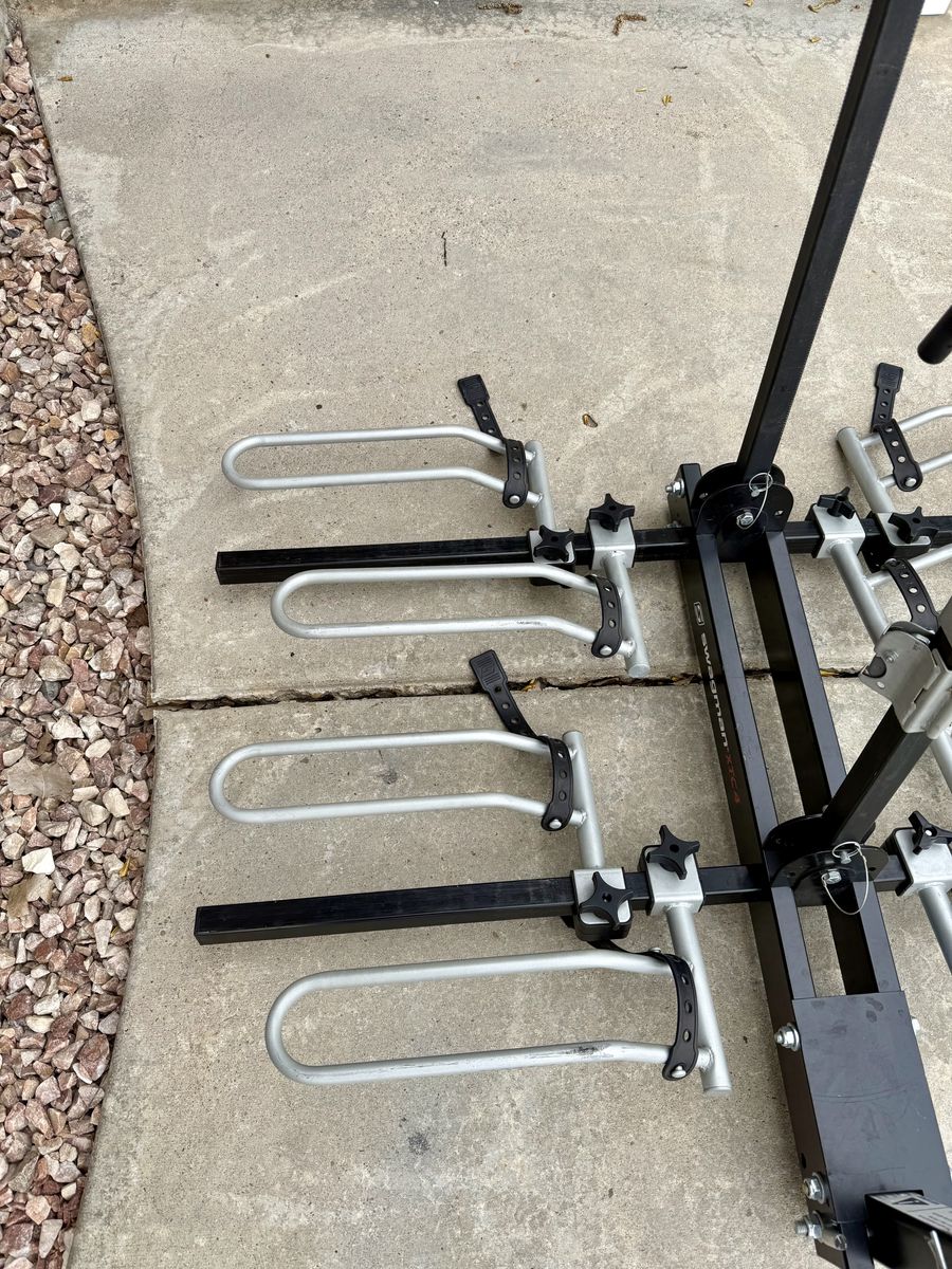 Like new condition. Everything works like it should. Holds up to 4 bikes. Up to 35 lbs per bike. Fits up to 2.5” wide tires. Fits wheels 20”-29”.