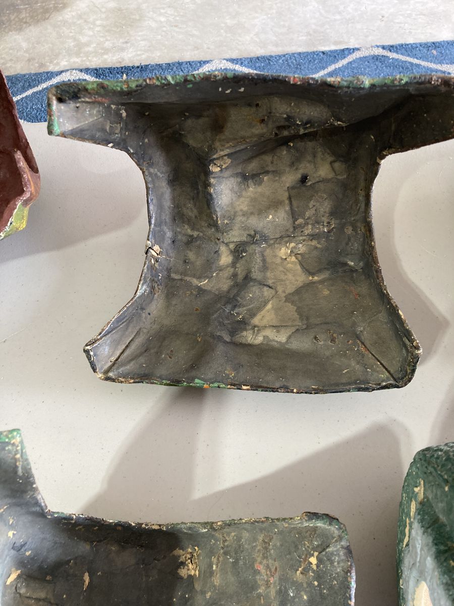 The two large made by Lionel and are made of sheet metal model number 120-L. The others are made of paper-mache or some paper composite. All I believe to be prewar pre 1930’s era a few of them well over a hundred years old. All with the exception of the large pressed molded one appear to be hand painted and all could use a cleaning and or restoration.