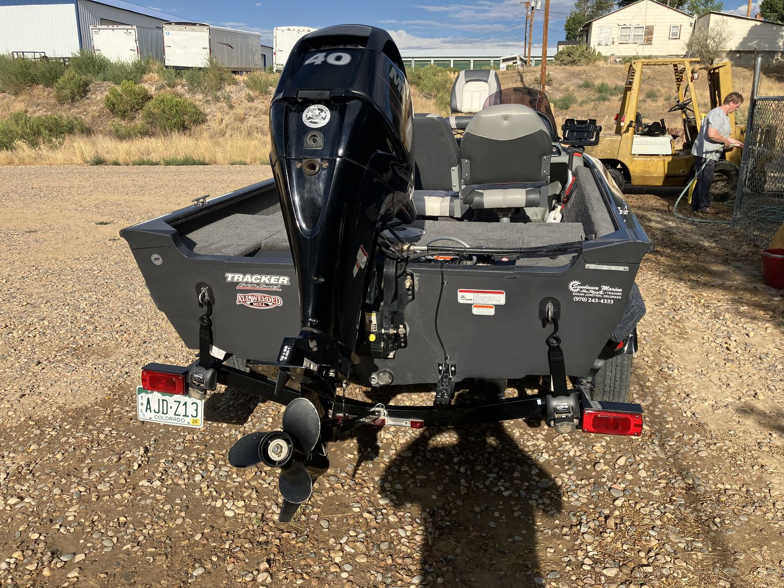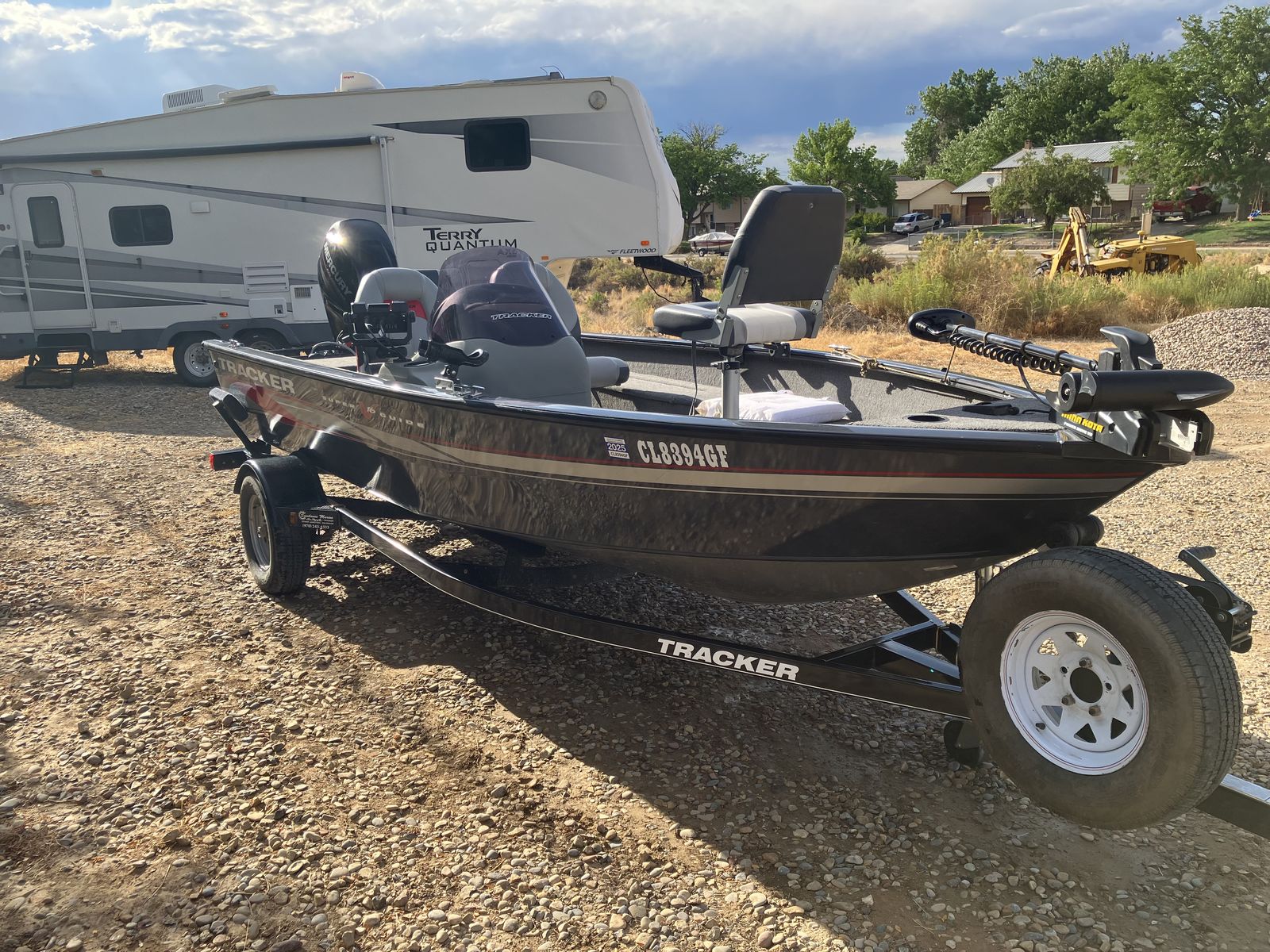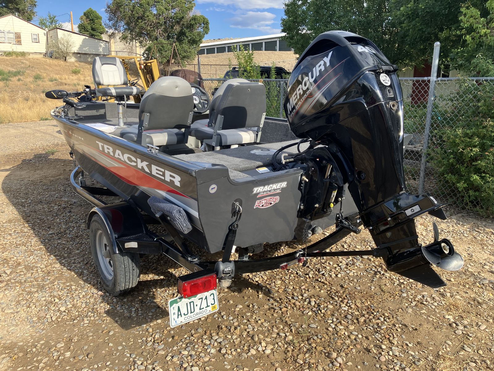 If this boat was not out on the lake fishing then it was in the garage. The original trailer scrubbed tires off in a couple thousand miles. The axle was replaced with a larger, cambered axle and new tires. The 40 horse 4-stroke Mercury outboard has probably less than 200 hours. The boat and motor are in excellent condition (like new). I weigh 235 and my wife weighs (???) and the boat did great with just the two of us. We invited another couple and it felt like too much. So we bought a larger Tracker with larger motor. Comes with electric trolling motor on the front with foot control, fish finder, manual down rigger that has never been installed.