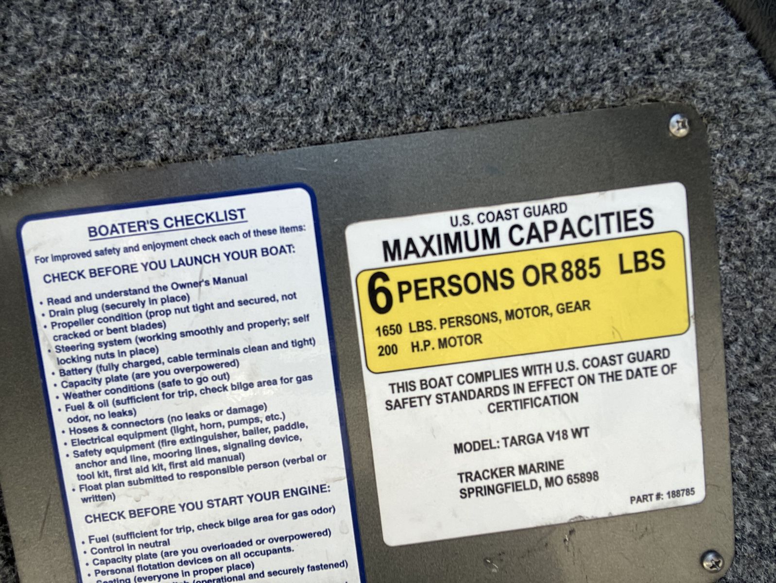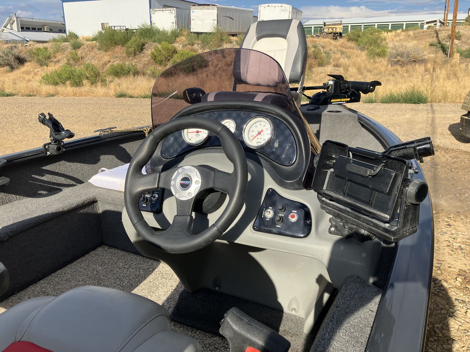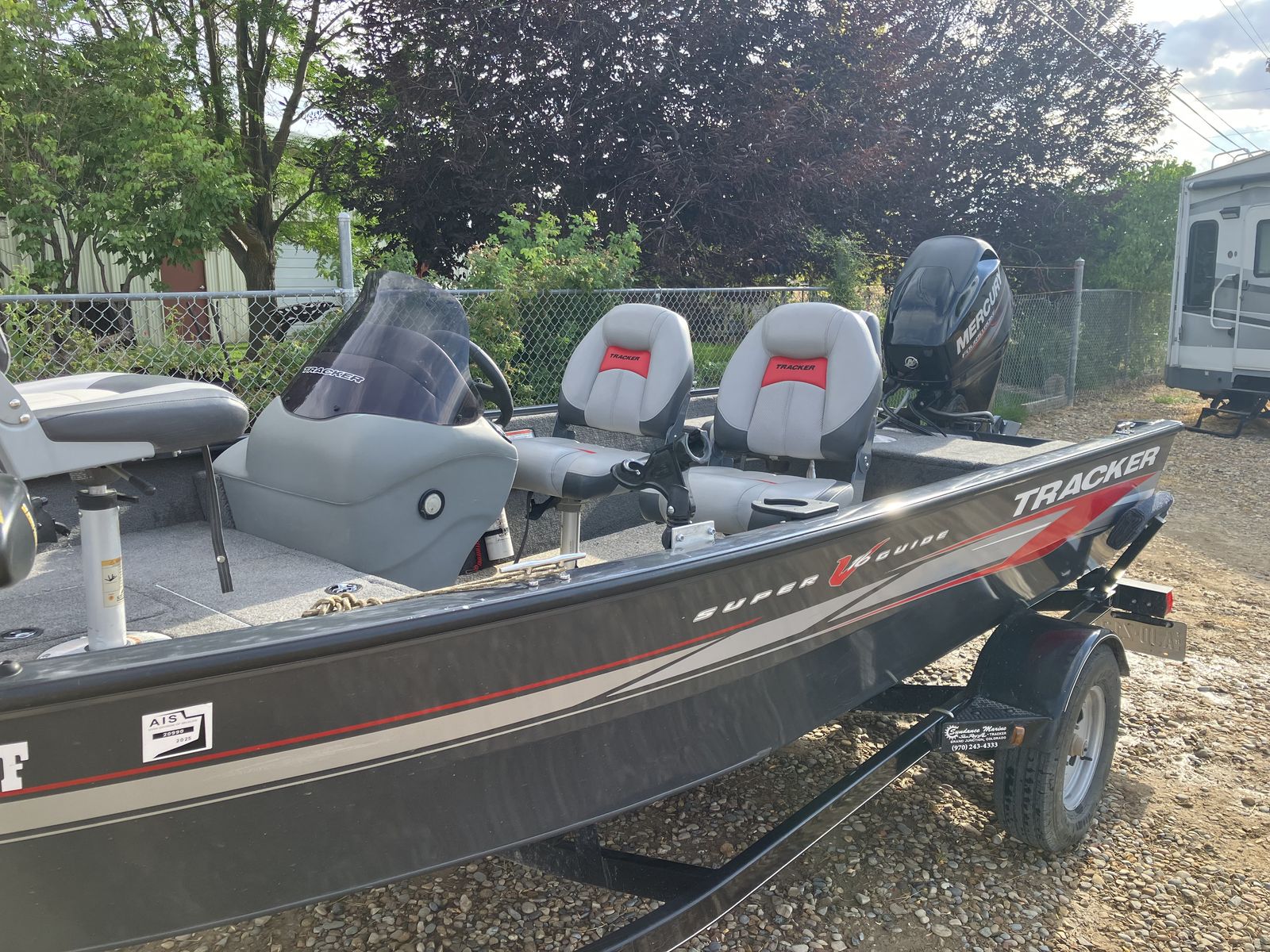 If this boat was not out on the lake fishing then it was in the garage. The original trailer scrubbed tires off in a couple thousand miles. The axle was replaced with a larger, cambered axle and new tires. The 40 horse 4-stroke Mercury outboard has probably less than 200 hours. The boat and motor are in excellent condition (like new). I weigh 235 and my wife weighs (???) and the boat did great with just the two of us. We invited another couple and it felt like too much. So we bought a larger Tracker with larger motor. Comes with electric trolling motor on the front with foot control, fish finder, manual down rigger that has never been installed.