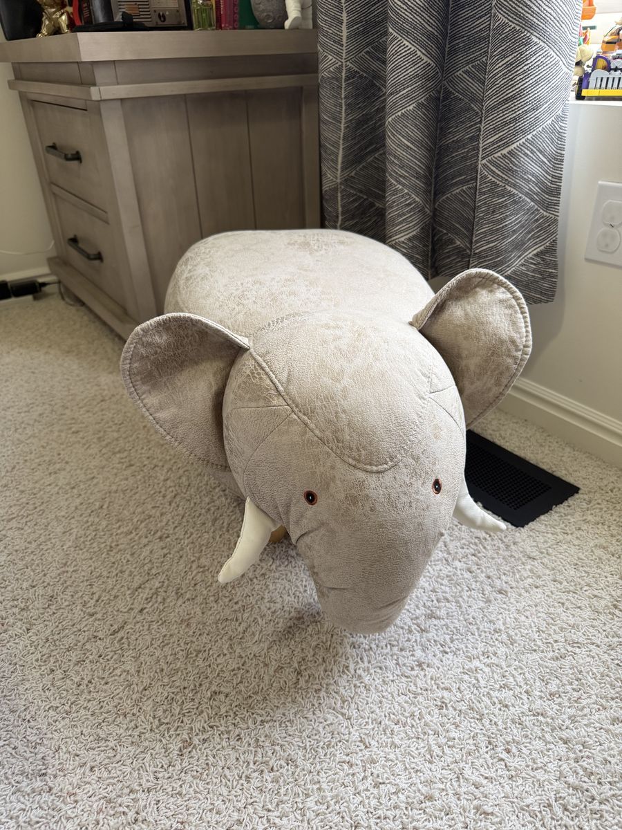 Add some fun to your space with this delightful and unique elephant shaped ottoman. Made to be long lasting and multi-functional. It is made with thick shape-holding padding and quality stitching technology to ensure your animal ottoman will remain comfortable and intact through regular usage. Perfect for Nursery Room or kids Room. GREAT CONDITION
