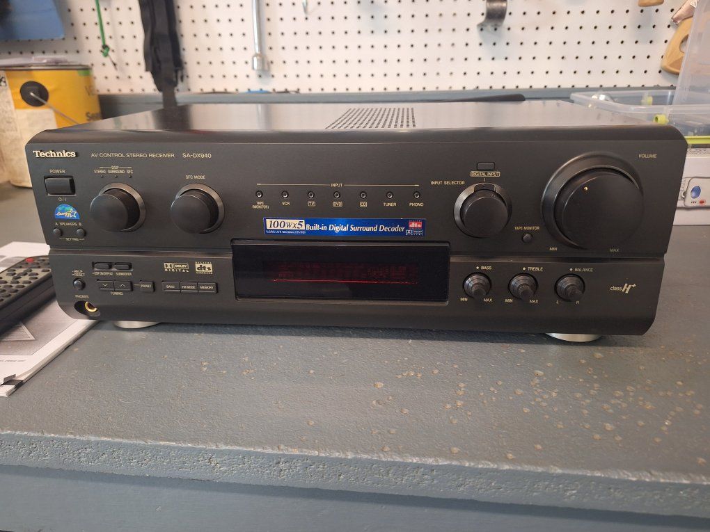 The Technics SA-DX940 AV Control Stereo Receiver, 100Wx5 Digital Surround Decoder is a powerful 5.1 channel amplifier with DTS surround sound support delivering 100 W of power per channel. This sleek black receiver, manufactured during the 1990's, offers a variety of features, including AM/FM radio capabilities and both digital and analog inputs with 6 outputs and 5 inputs, this Technic receiver provides flexibility for connecting multiple audio devices. The included original remote and original booklet make a versatile choice for enhancing your home audio experience.