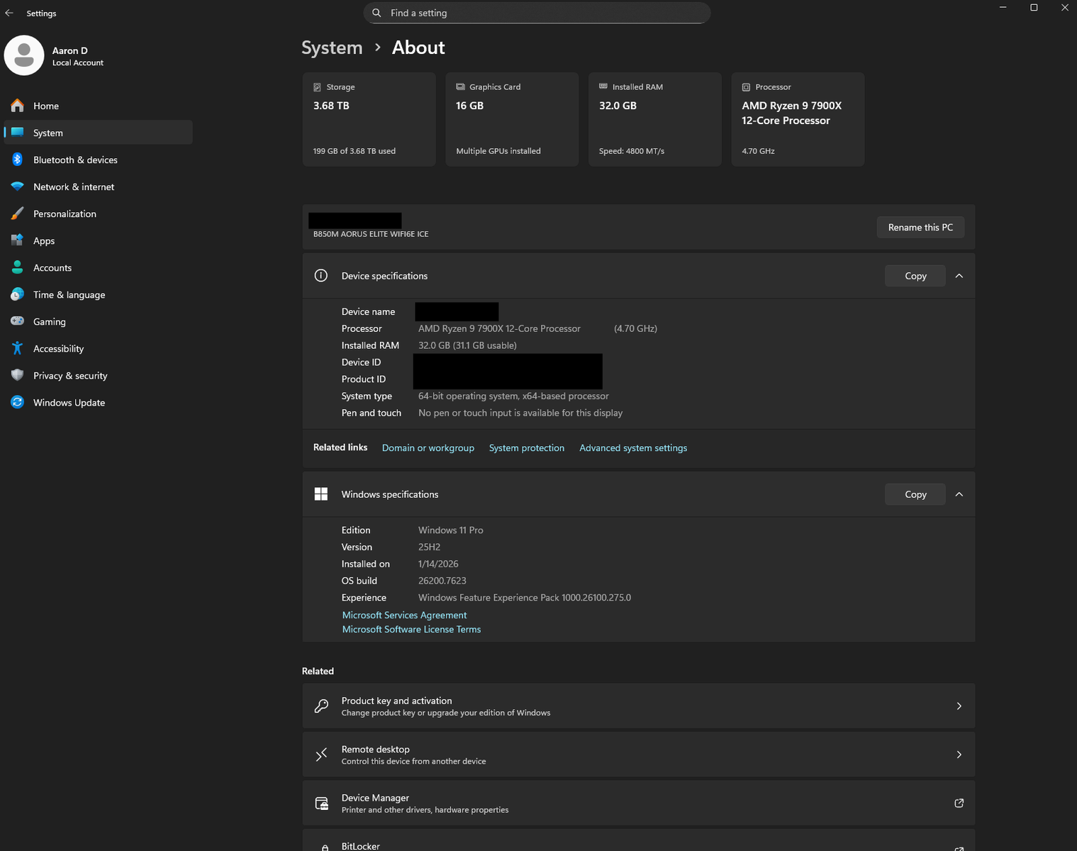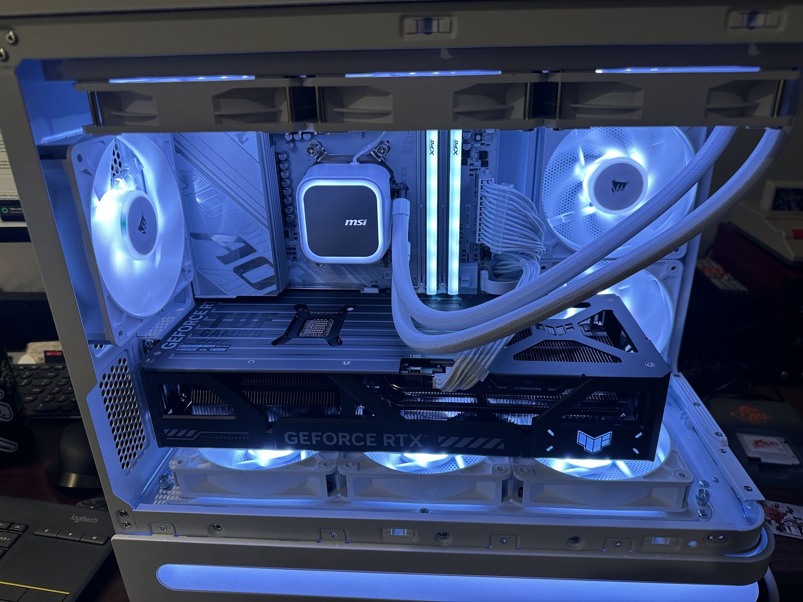 CPU: AMD Ryzen 9 7900X 4.7 GHz 12-Core Processor CPU Cooler: MSI MAG CORELIQUID A13 62.6 CFM Liquid CPU Cooler Motherboard: Gigabyte X870 AORUS ELITE WIFI7 ICE ATX AM5 Motherboard Memory: ADATA XPG LANCER RGB 32 GB (2 x 16 GB) DDR5-6000 CL30 Memory Storage: Samsung 990 Pro 2 TB M.2-2280 PCIe 4.0 X4 NVME Solid State Drive Storage: TEAMGROUP T-FORCE G50 2 TB M.2-2280 PCIe 4.0 X4 NVME Solid State Drive Video Card: Asus TUF GAMING OC GeForce RTX 5080 16 GB Video Card Case: Asus AP202 ARGB White mATX Curved Tempered Glass Case Power Supply: Corsair RM850e (2025) 850 W Fully Modular ATX Power Supply Case Fan: Corsair RS120-R 65.82 CFM 120 mm Fans x 6 OS: Windows 11 Pro (legit license)
