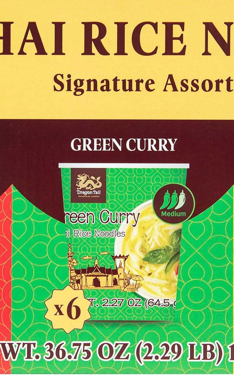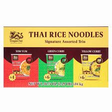 Dragon Tail Assorted Thai Rice Noodles variety noodles come in three Thai flavors: Tom Yum, Green Curry, and Yellow Curry. Individual servings of instant rice noodle bowls, offering a convenient way to enjoy traditional Thai cuisine at home. The rice noodles are made from white rice, tapioca starch, and oxidized starch, providing an authentic texture. Each flavor features a distinct curry seasoning packet with coconut powder, traditional Thai spices including lemongrass, galangal, and fish sauce, along with garnishes of dried chives and other toppings. Simply add boiling water, wait 4 minutes, and stir to serve.