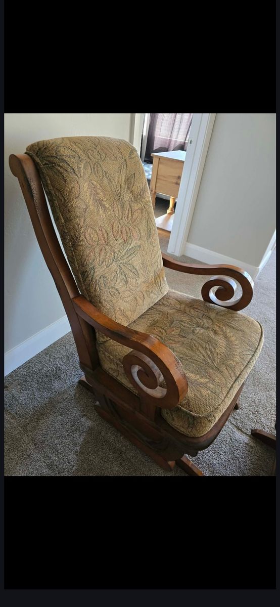 ZelleBeing offered is a "like new" solid wood Glider (Rocking Chair) with matching ottoman. Little to no damage and in great condition. Perfect for new mothers and fathers who have recently added a baby to the family. Nursing, easy rocking, and for soothing a new born, or up to 4 year old child for nap, or bed time. My wife and I enjoyed using this Glider with our own children. Time to share this experience with your family and pass it along. $100.00 and very reasonable