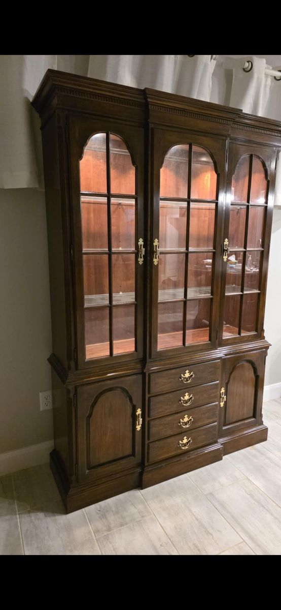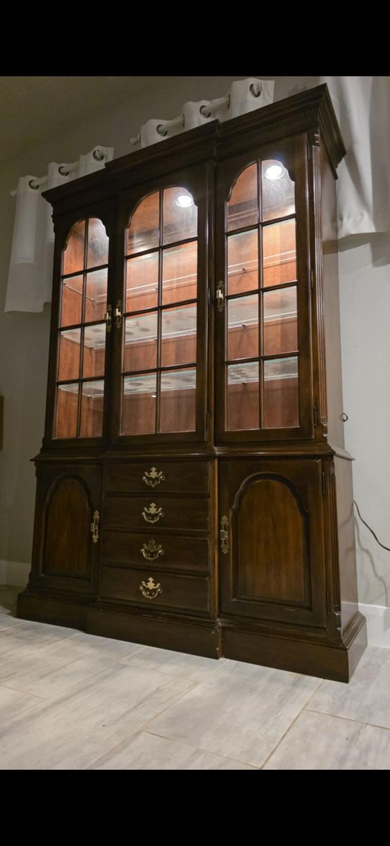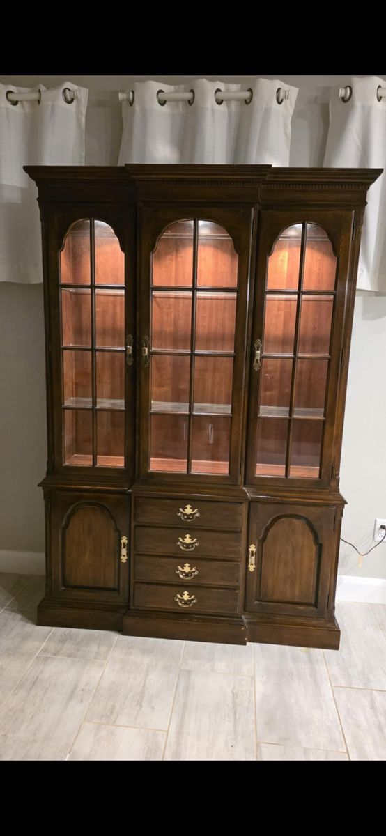ZelleBeing offered is a nearly new glass door and glass shelves china cabinet. 6' feet tall. Lights on the interior to show off what is displayed inside.