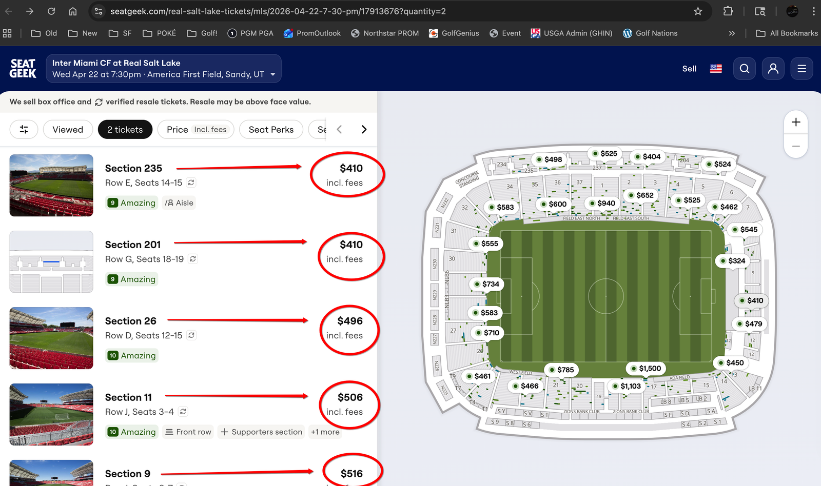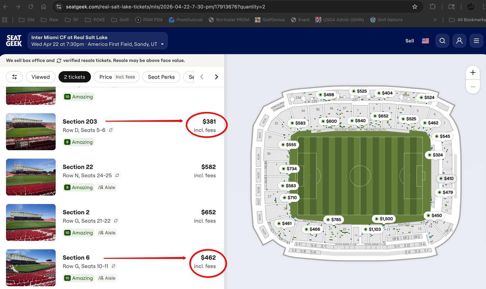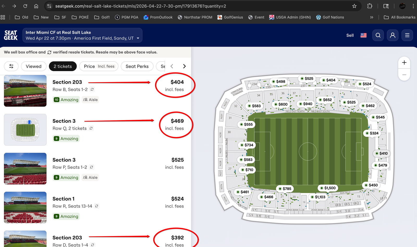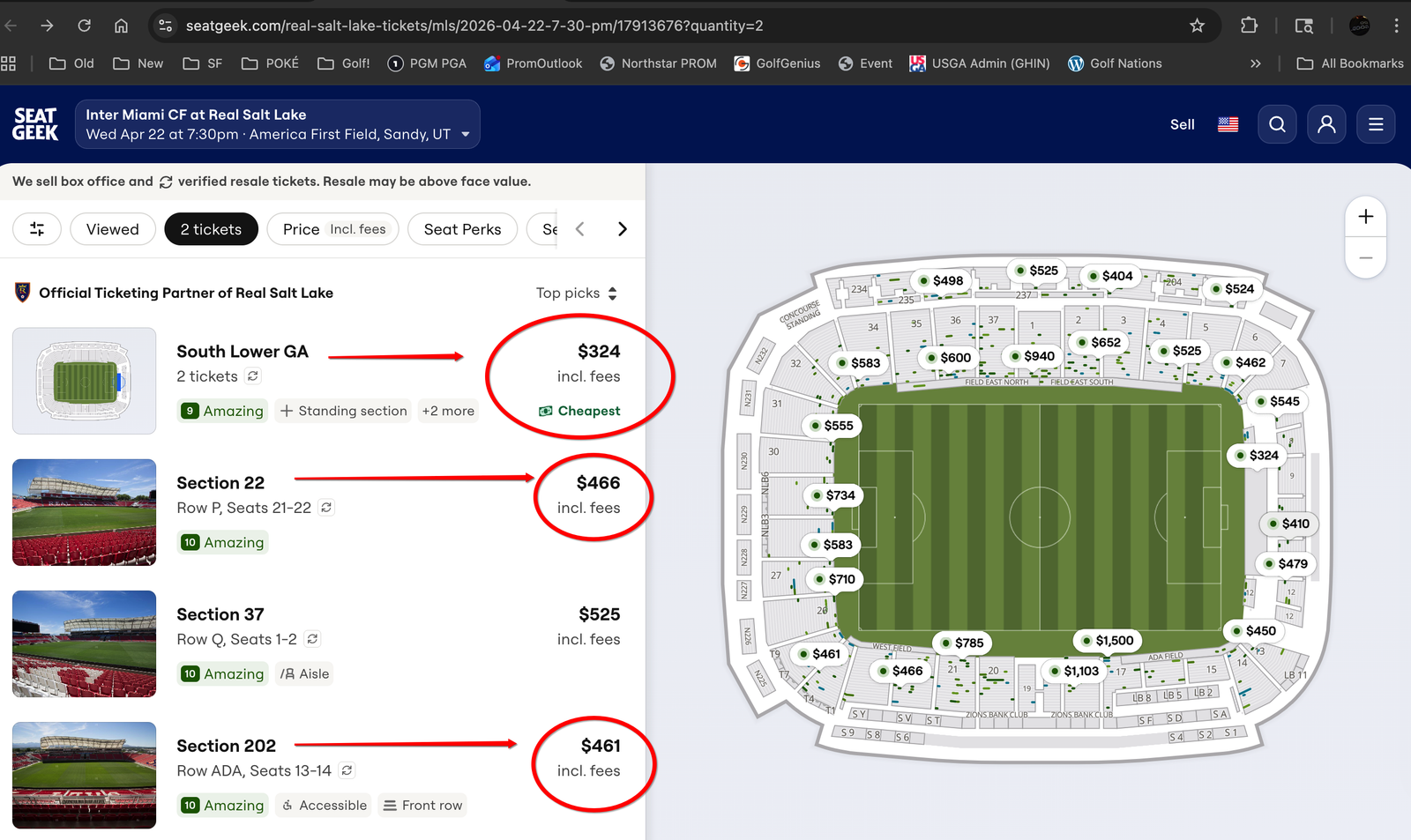 SeatGeek Tickets: AS OF TODAY: the cheapest 2 tickets together are $324 each - in the Standing Room Only Supporter's Section. Comparable tickets together, are $381, $392, $398, $399, $404, $461 (all located in the upper sections, the "nosebleeds"). Others are $410 (in the Supporter's Section behind the standing room only area). Or, other "Lower Bowl" tickets together, are $440 (Row L), $466 (Row P), $462 (Row G), $467 (Row M), $469 (Row D or Q), $491 (Row E), $495 (Row N), and $525 (Row E). Prices are going CRAZY as the game gets closer and as RSL is doing better and better!