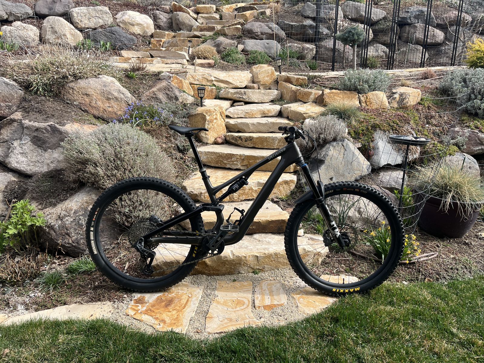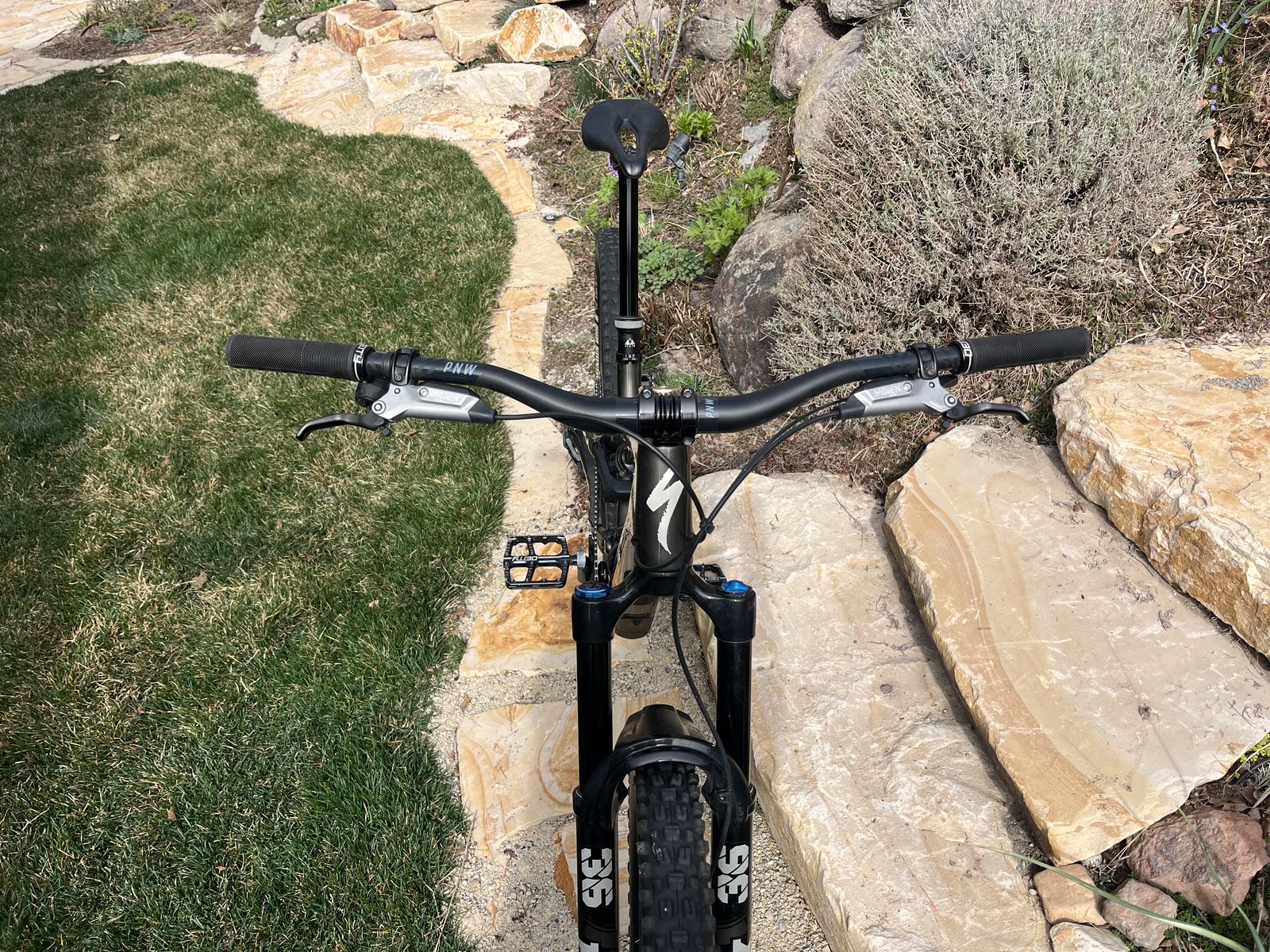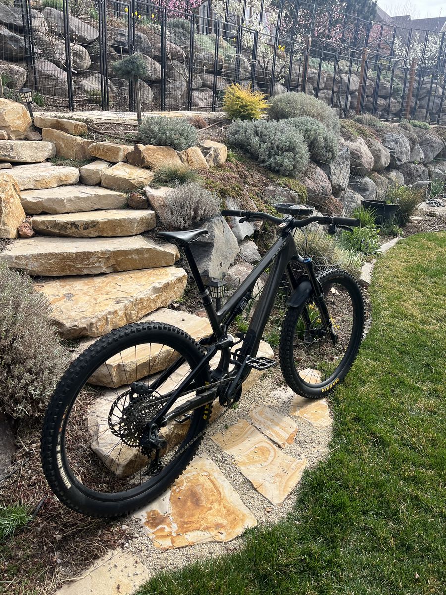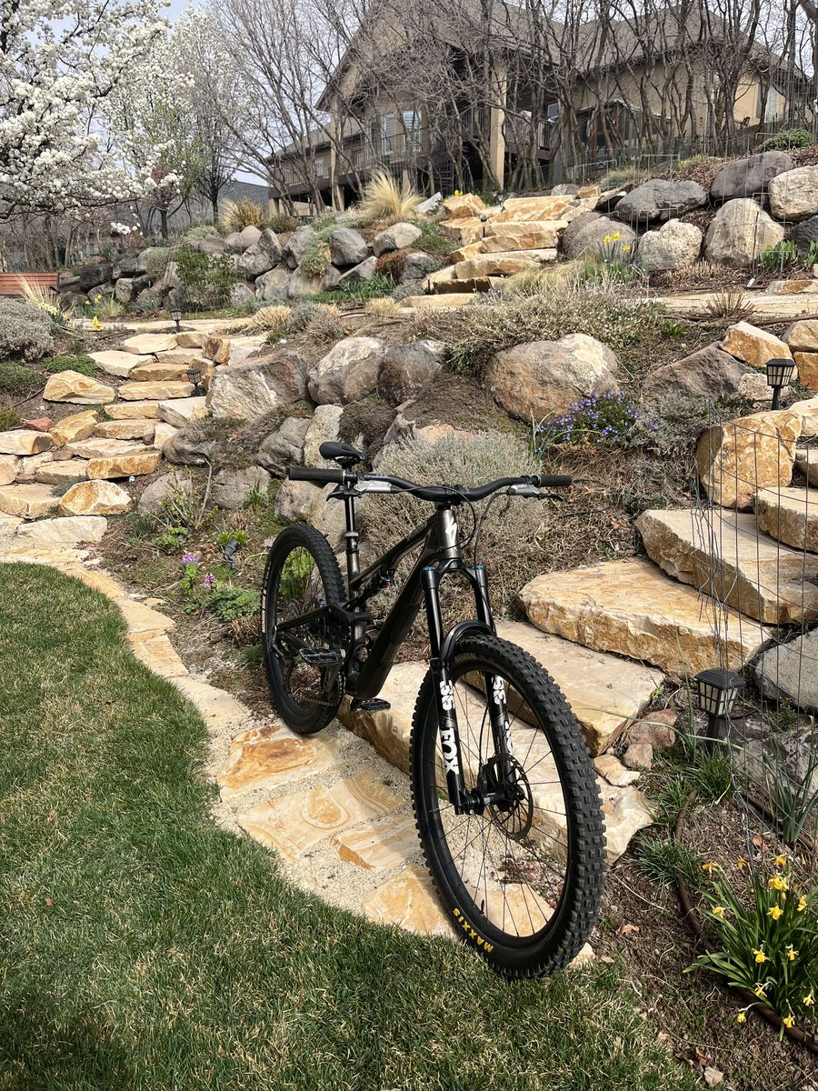 Upgrades: 160 air spring Carbon bar pnw Dt swiss 370 activation upgrade Maxxis tires both 2.6 Exo+ casing 50mm deity stem Tailgate protection Deity Pedals Tubless Black seatstay Stats: Fork travel 160 fox 36 Shock travel 145 fox genie Pnw carbon bar 38mm rise Adjustable head angle Adjustable chain stay length All parts for genie shock and spacers for fork included Pedals included