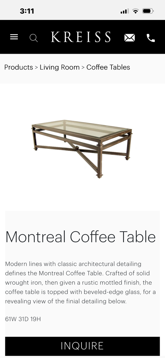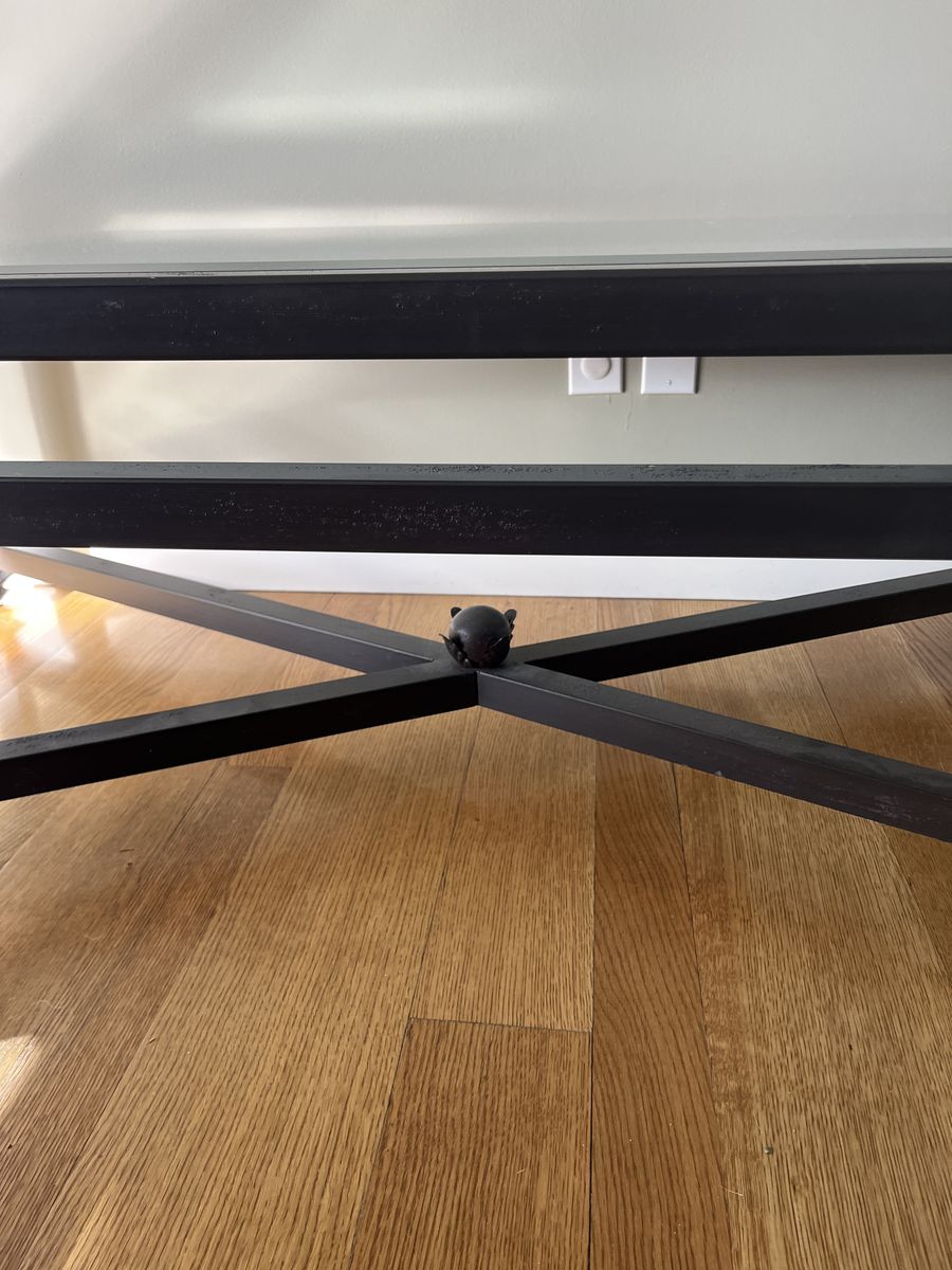 Beautiful, vintage iron and beveled glass coffee table. 60"x30"x 19.25 excellent condition. Kreiss Luxury Home Furnishings, same table is still on Kreiss website.