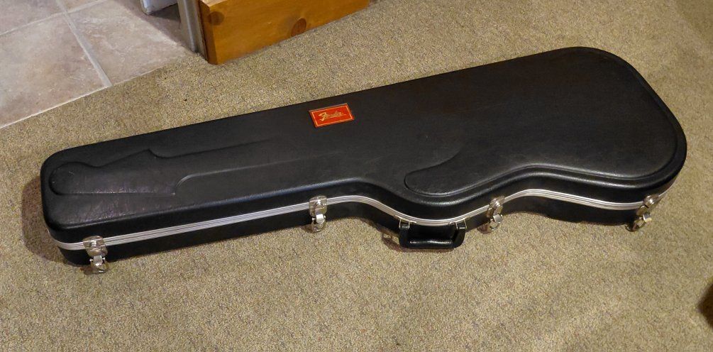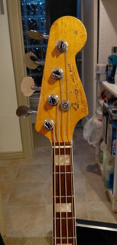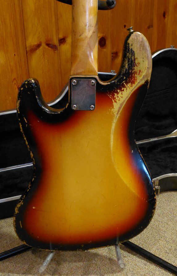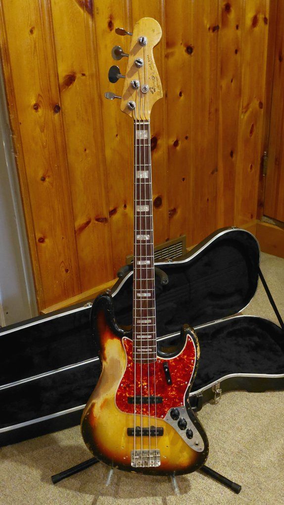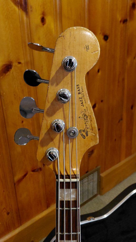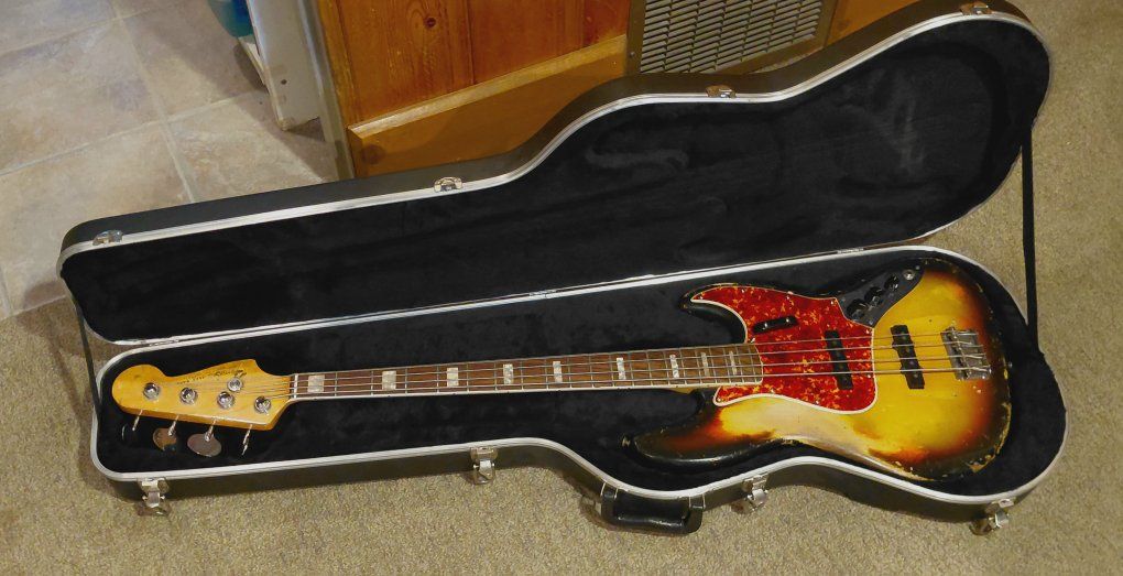 Fender 1966 Jazz Bass in well-used condition as you can see from the photos. This Bass definitely has a lot of mojo, and is one of the nicest playing bases I've ever played. The neck action is incredible, and the pickups sound fantastic. If you're looking for a great bass for gigs I don't think you'll find anything better. Everything is original with the exception of the pickguard which was missing when I got it some twenty five years ago. A $300 Spitfire custom pickguard was put on as a replacement. Has a Fender molded hard-shell case with it.