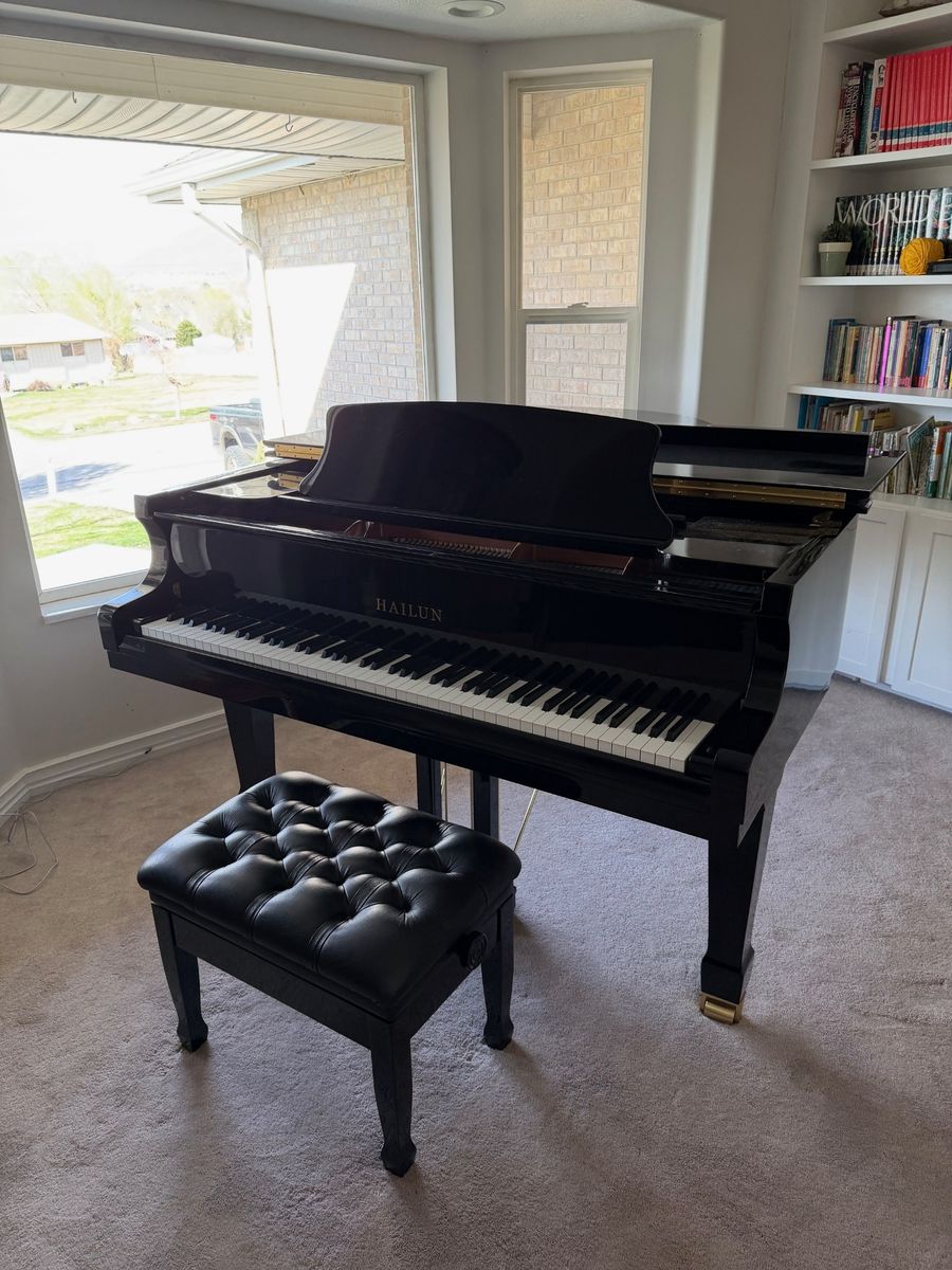 Beautiful Hailun HG-178 baby grand piano in black polished ebony, purchased new in summer 2015 and in excellent condition.
