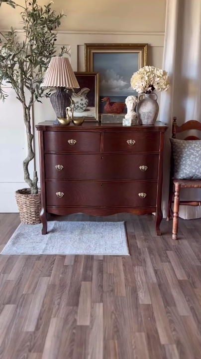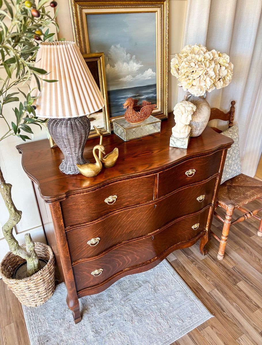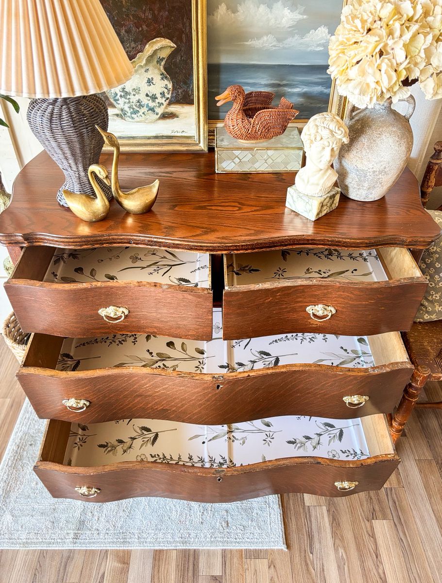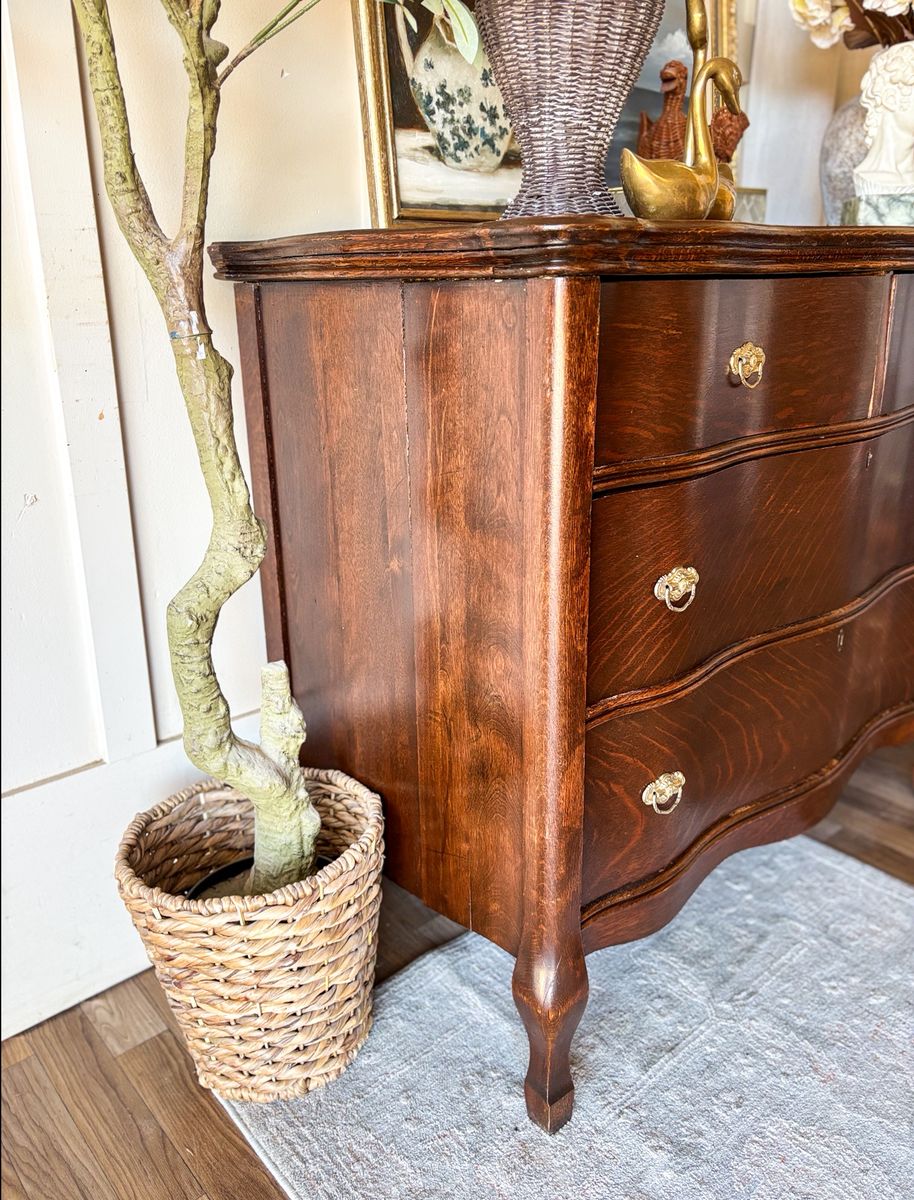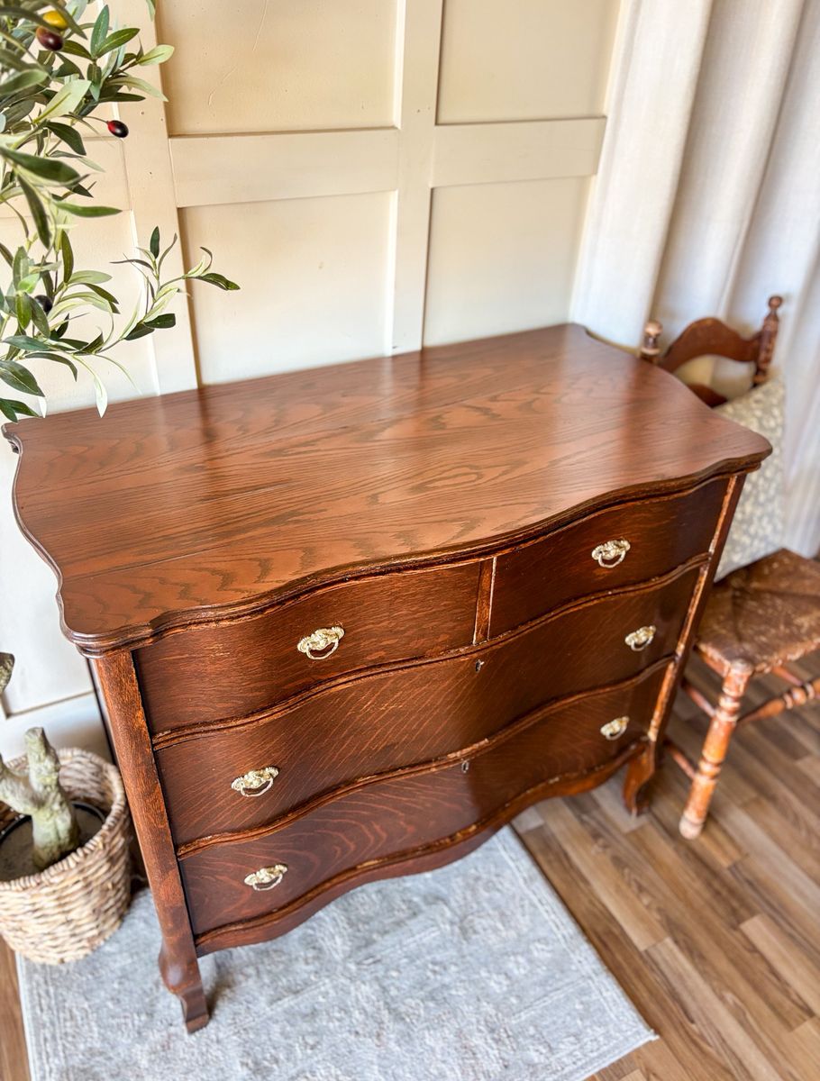 VenmoCharming antique chest of drawers featuring a beautifully refinished top sealed with lacquer, while the body retains its original finish with minor wear that highlights its antique appeal. All drawers open and close with ease, are wallpaper lined, and include original hardware. The right front foot was previously cracked but has been stabilized and is solid and sturdy. This is a well built, solid wood piece with tons of character, perfect for adding warmth and history to any space!