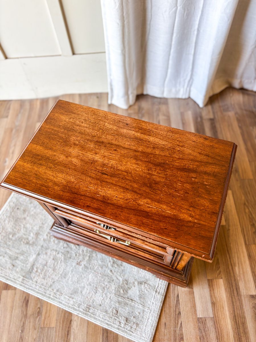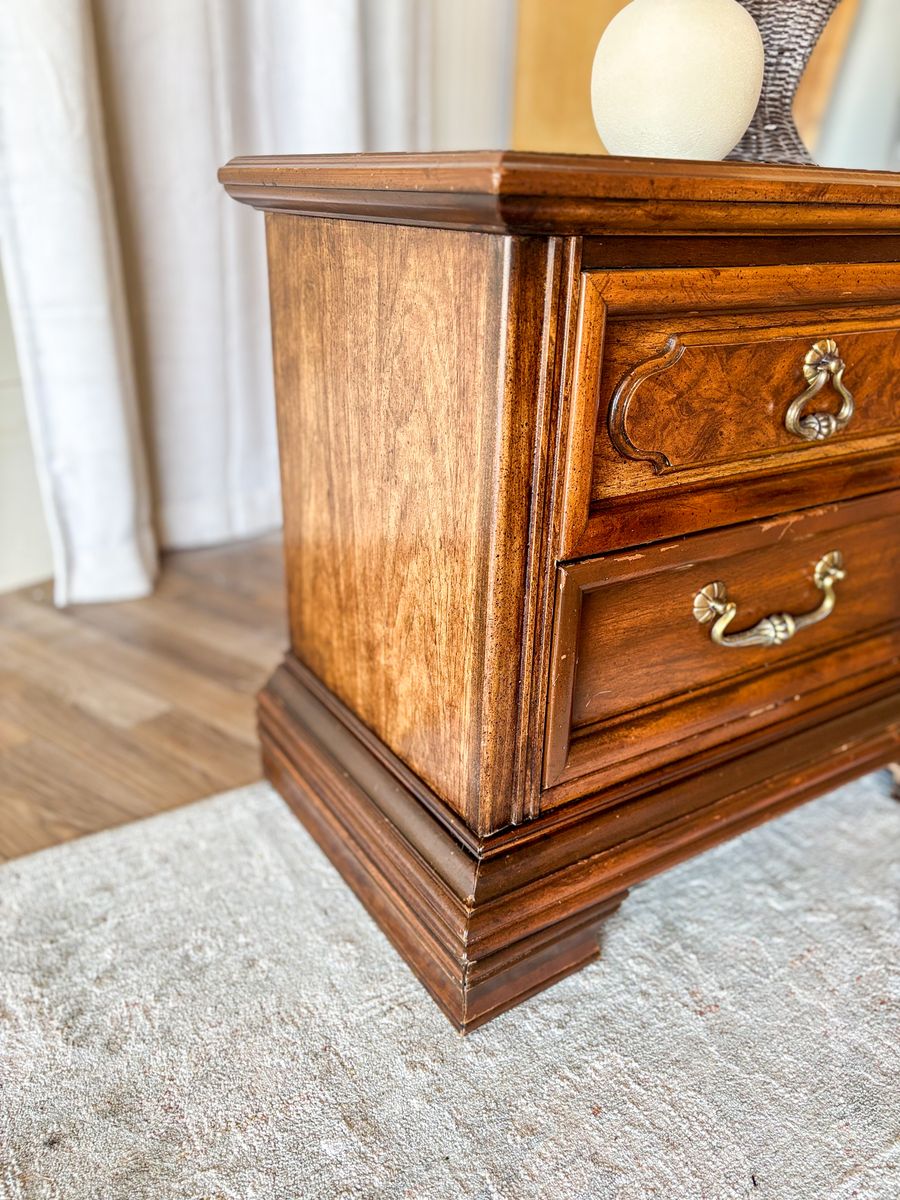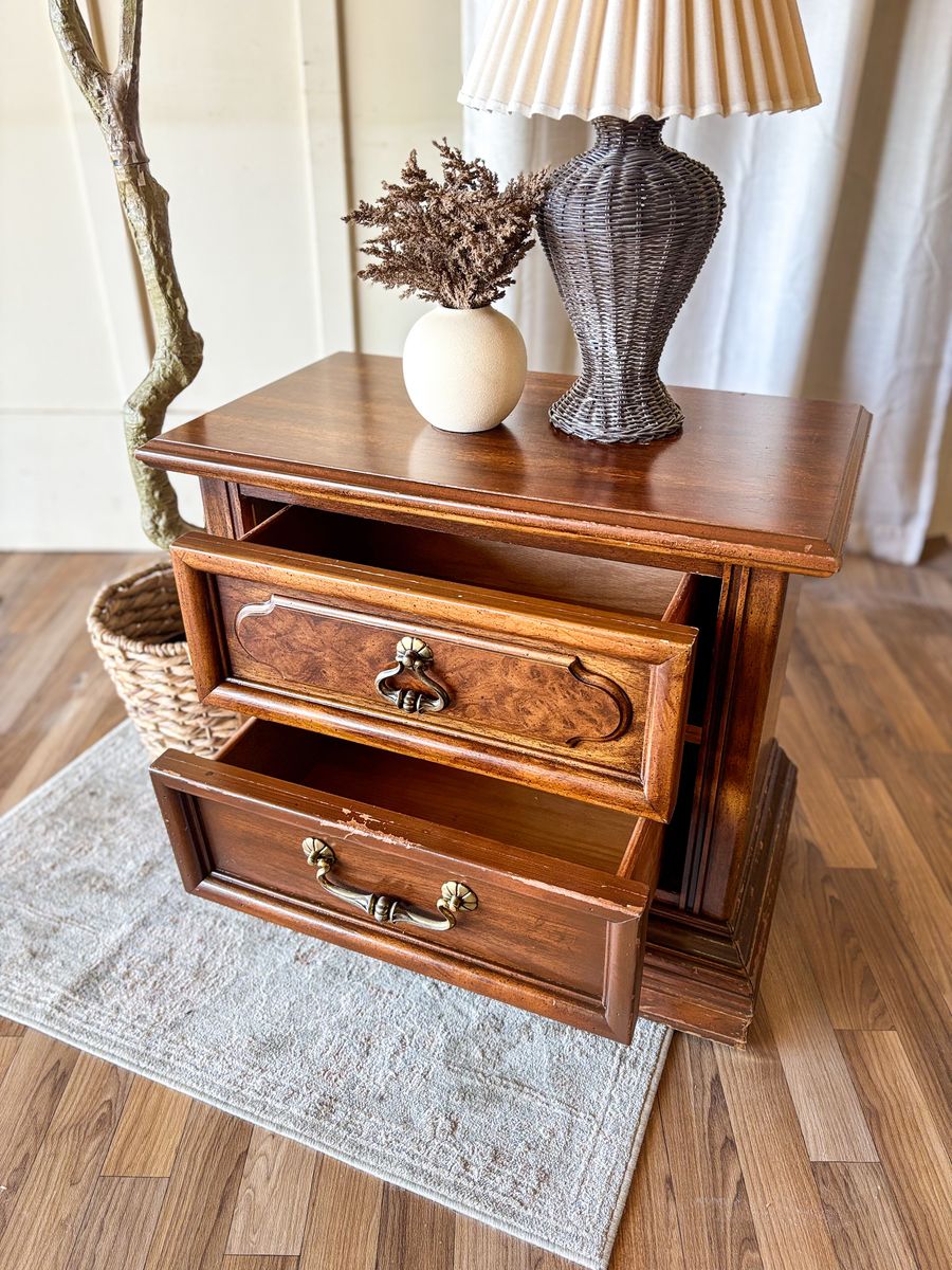 VenmoCharming vintage nightstand featuring original hardware and a classic design full of character. This piece is being discounted due to visible wear throughout and a slightly stiff top drawer, while the bottom drawer opens and closes well. Despite the minor imperfections, it remains a functional and stylish piece that would be perfect for a guest room, project, or anyone who appreciates vintage charm at a great price.
