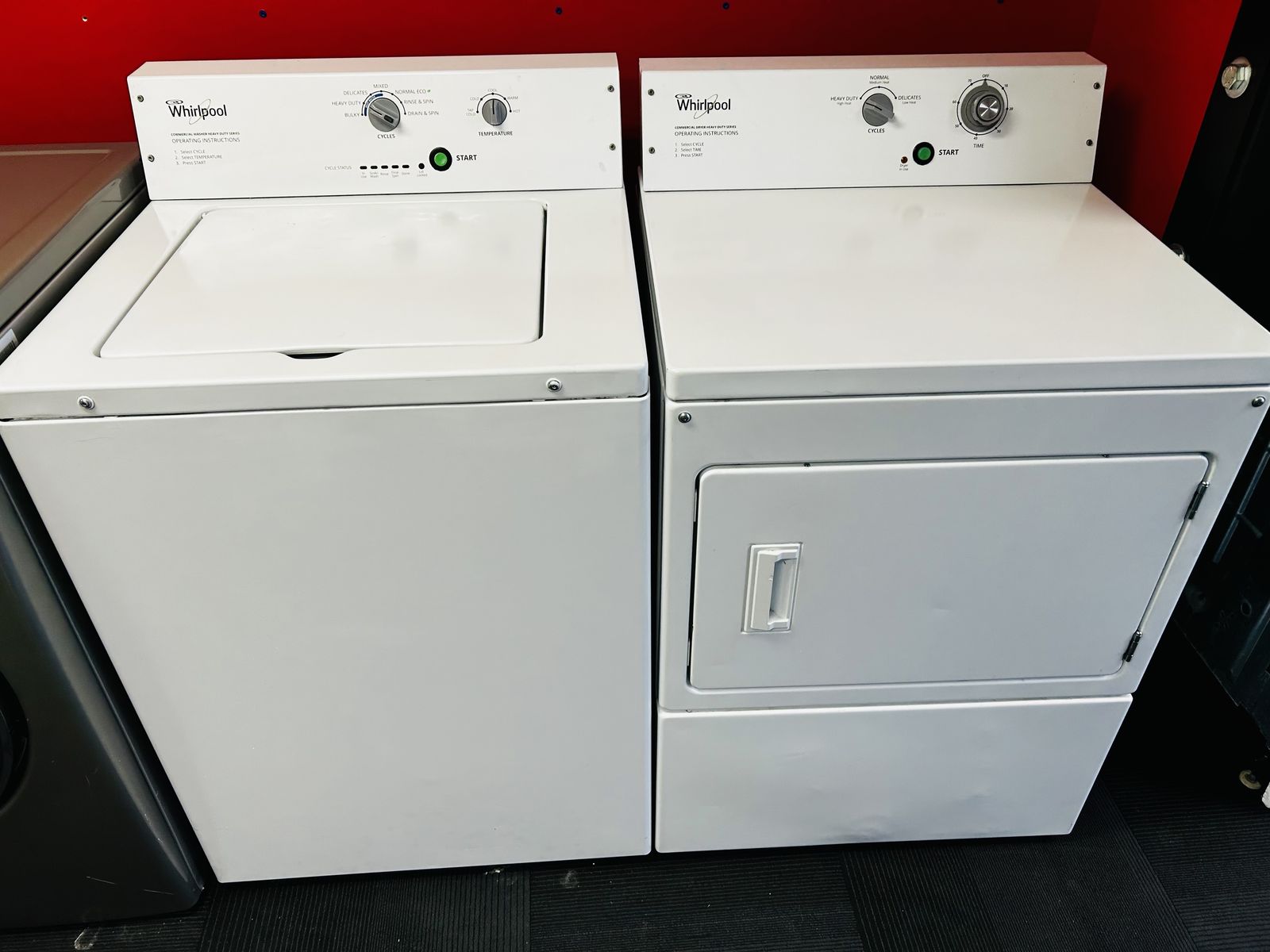 Whirlpool commercial heavy duty series washer bulky delicates mixed normal eco rinse and spin drain and spin etc..Whirlpool commercial heavy duty series electric dryer height heat normal medium heat delicate low heat time dry etc..They work great, clean, 45 day warranty, delivery/install available.