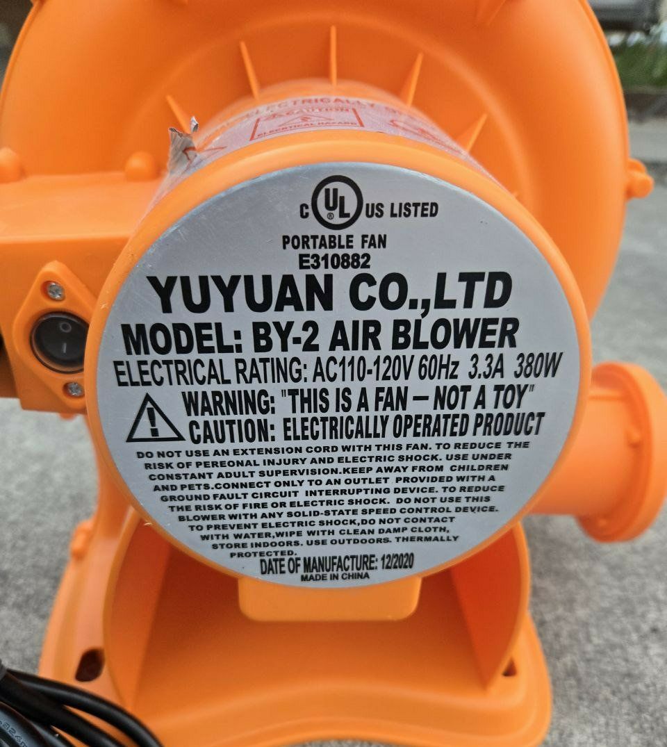 VenmoYuyuan Co., LTD Model: BY-2 Air Blower. Model: BY-2 Air Blower. Manufacturer: Yuyuan Co., LTD. Electrical Rating: AC110-120V 60Hz 3.3A 380W. Intended Use: This type of blower is often used for inflating bounce houses and other inflatables. It can also be used to dry out a room that got flooded. Works and blows great. Great portable fan/blower. Text please!