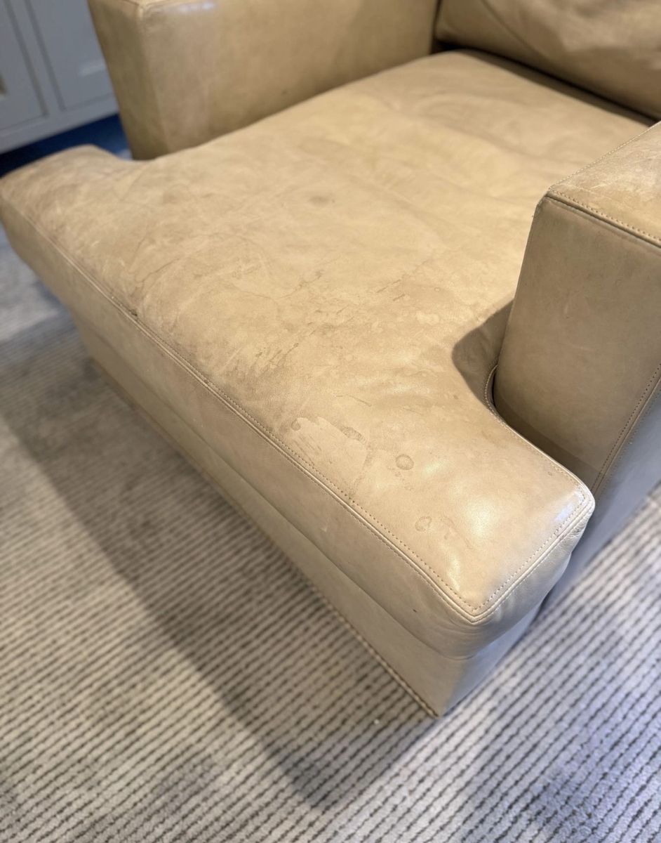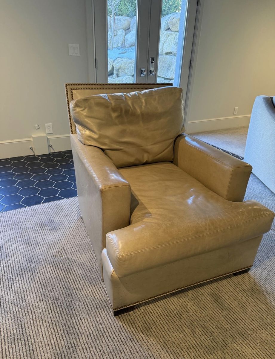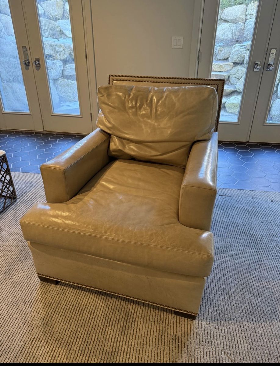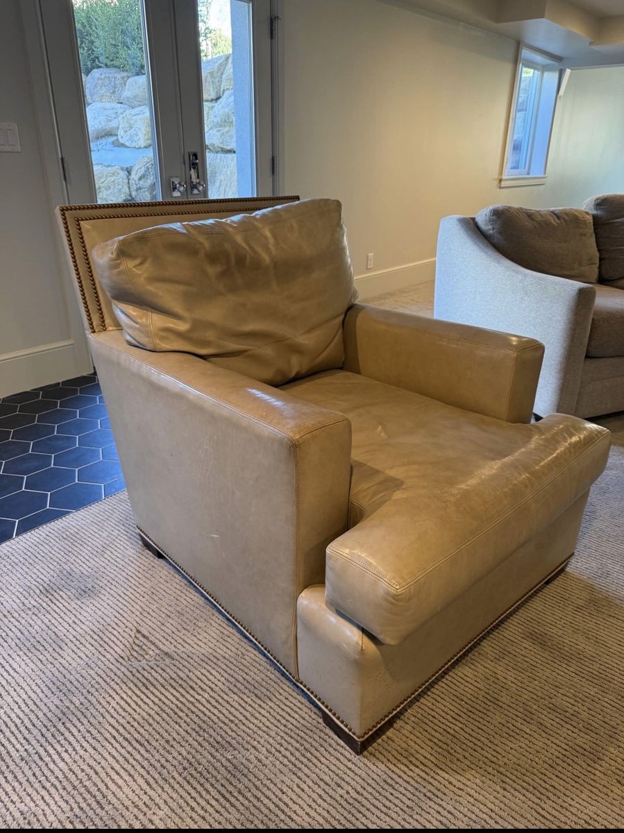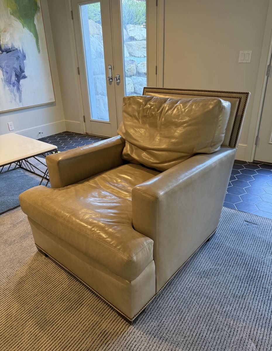 VenmoComfy tan leather armchair. Has cool nailhead trim. Super soft, worn-in leather. Great for a reading nook or just chilling. Fcfs. I will deliver for a fee