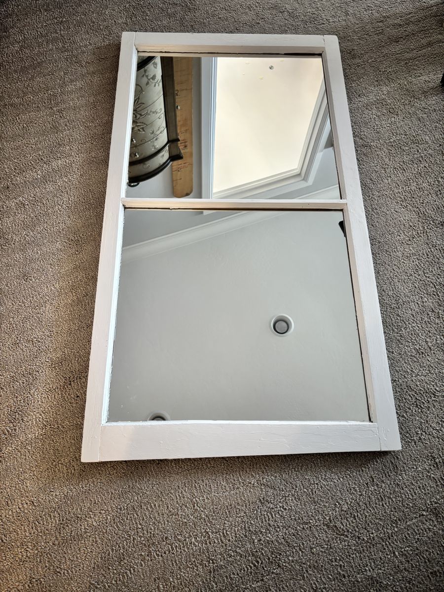 Charming farmhouse-style mirror with a windowpane design and solid wood frame. Perfect for adding character to an entryway, bedroom, bathroom, or above a dresser.\