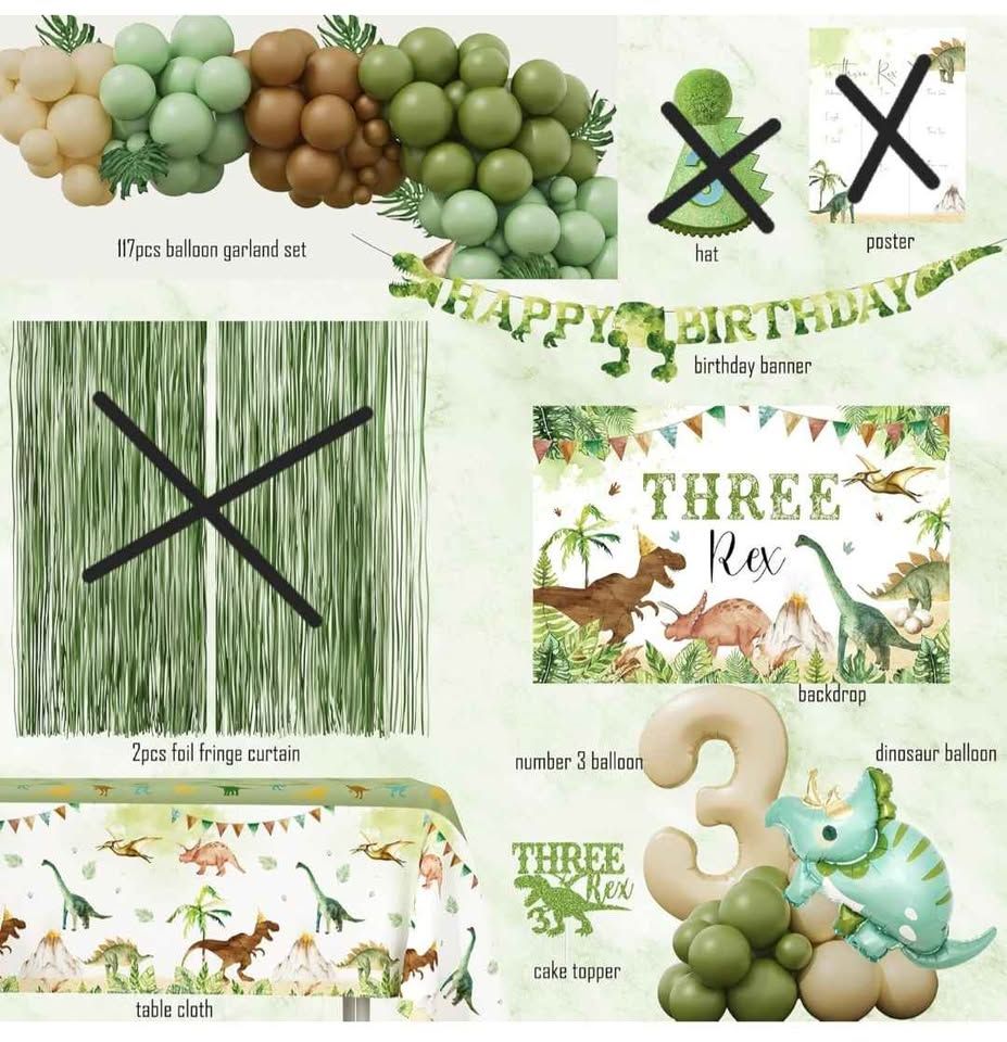 VenmoBirthday party decor for three-rex toddler dinosaur party. Comes with latex balloons for arch, banner, backdrop, number 3 balloon, dinoaour cups, plates, signs, milar dinosaur balloons, and dinoaour feet. Pickup only please. Cash or venmo accepted. Smoke-free pet friendly home.