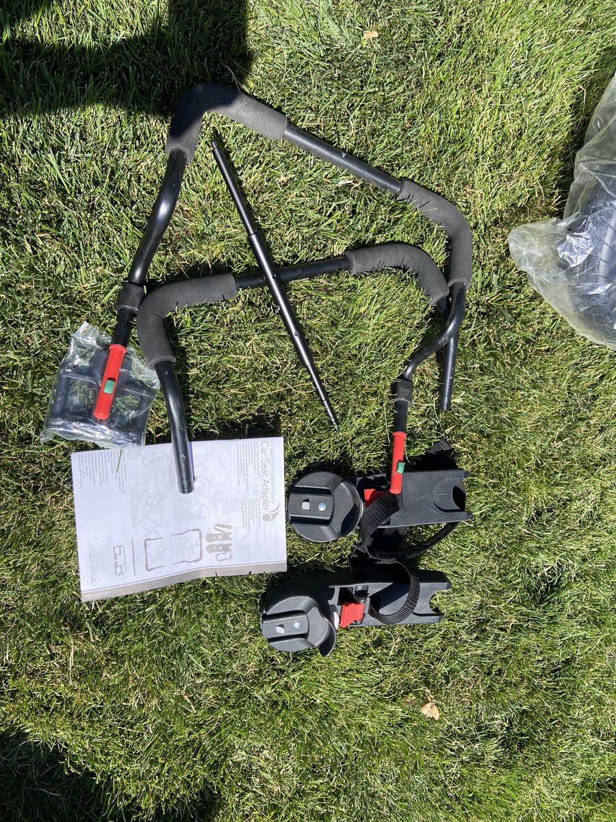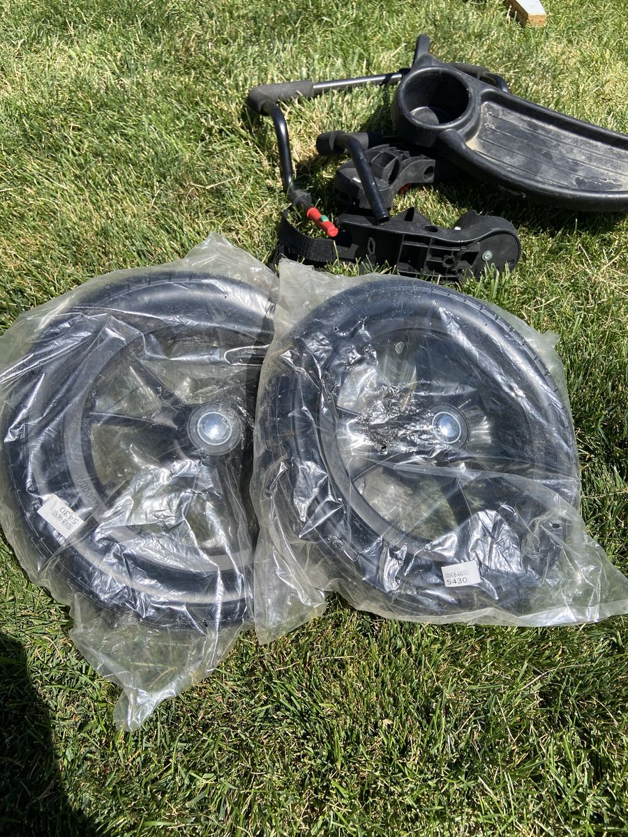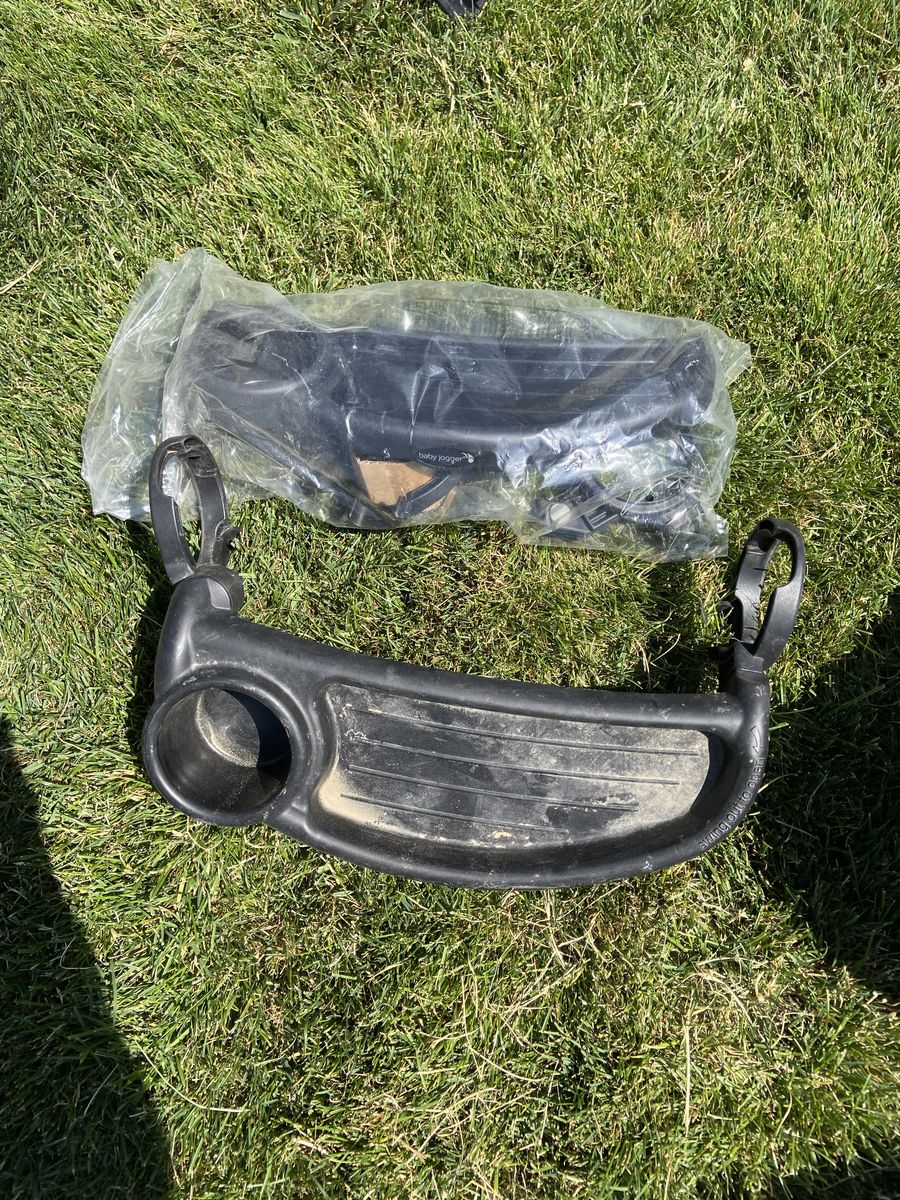 Comes with: Seats for Single or double stroller Extendable handle Parent console (faded from sun exposure) Two snack trays (one unopened) Car seat adapter Glider Board- for a third child to ride on Extra set of rear tires.