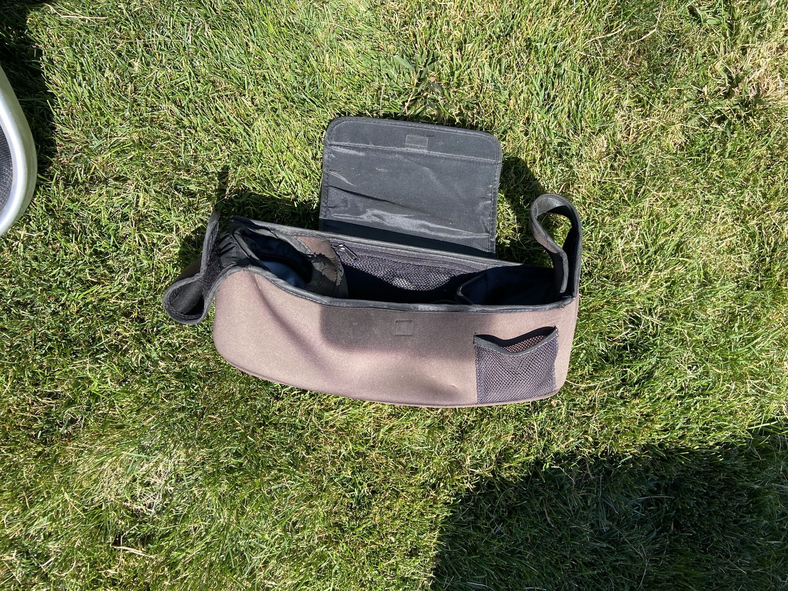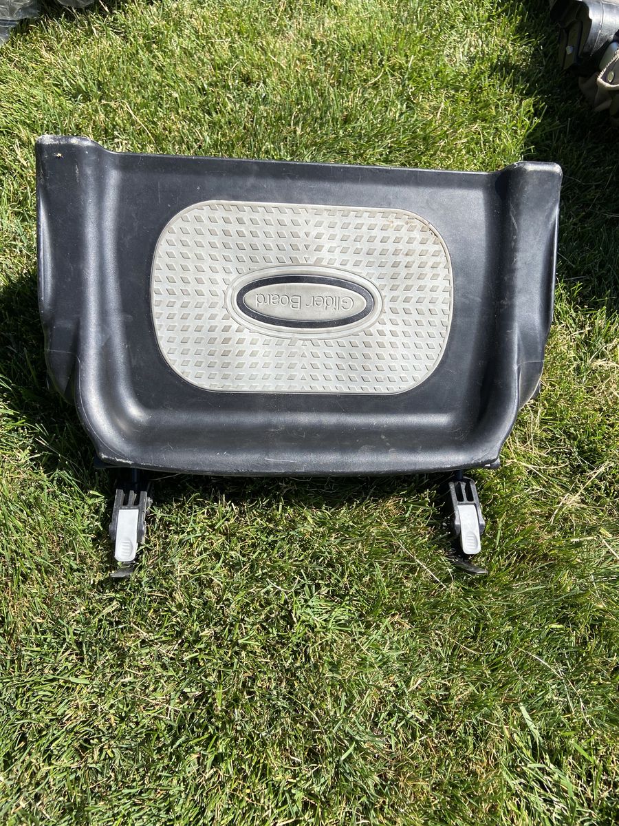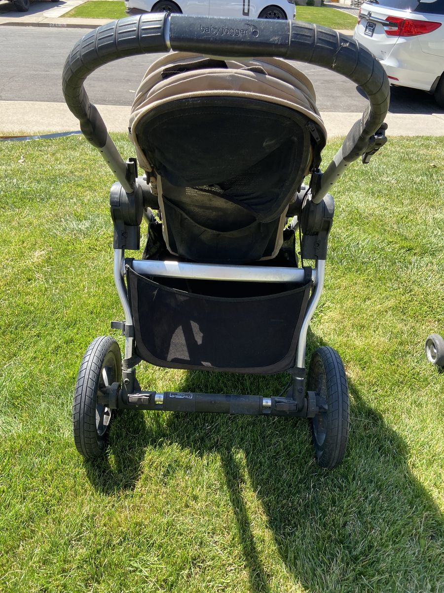 Comes with: Seats for Single or double stroller Extendable handle Parent console (faded from sun exposure) Two snack trays (one unopened) Car seat adapter Glider Board- for a third child to ride on Extra set of rear tires.