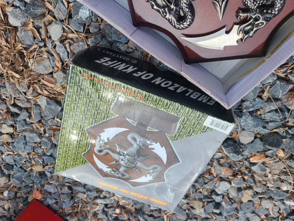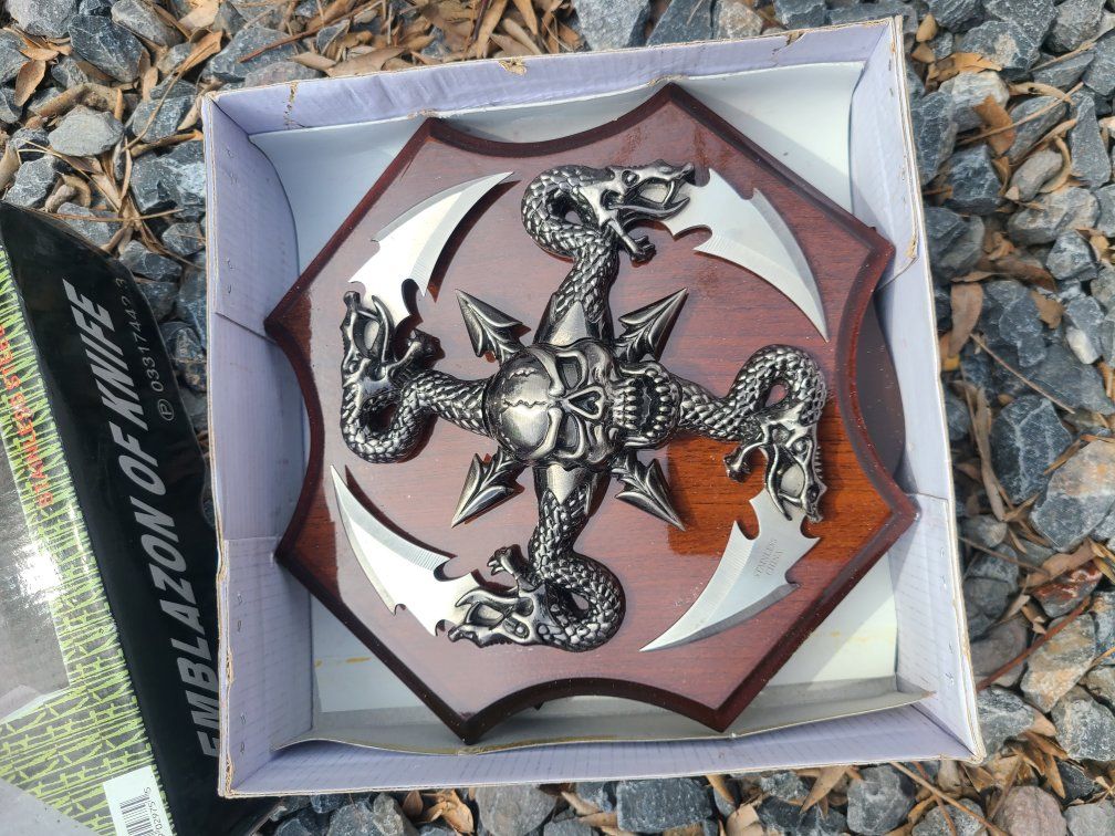 decorative wall plaque with a gothic/medieval theme, featuring a central skull and four daggers. New with box