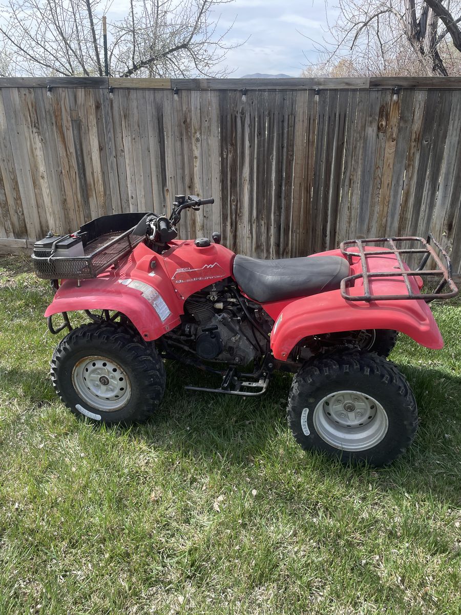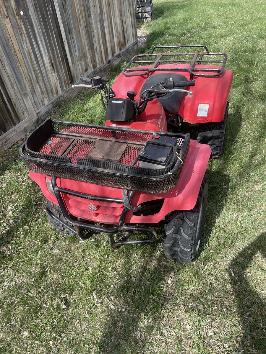 2004? 5 or 6. ?? Farm wheeler for sale. 400cc 4x4 works great. New carb. Decent tires. Missing some parts. No title. Starts and runs good. Needs battery,brake cable, speedo cable, headlight and some running board plastics. Buy it for parts or use on private land. Has a snow plow also but it needs some repair. $600 as is