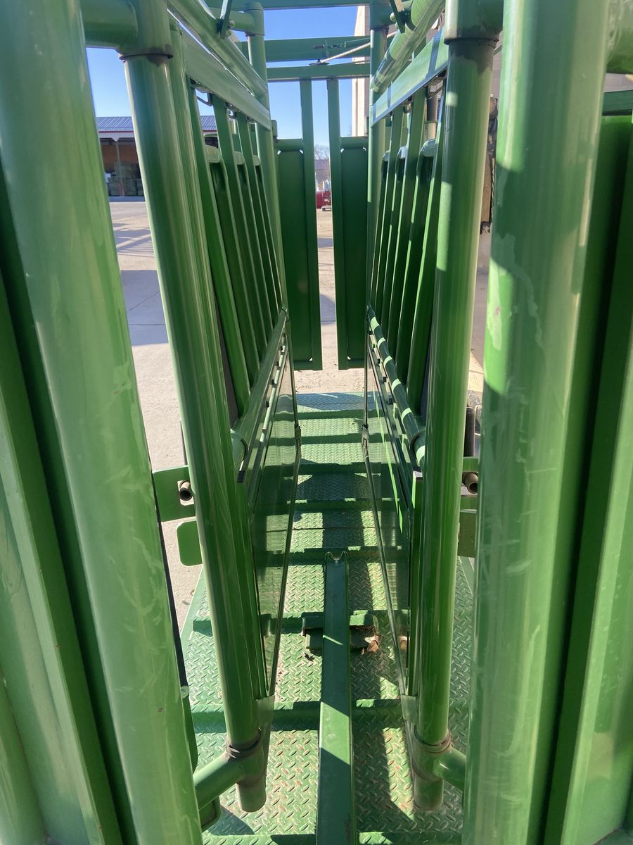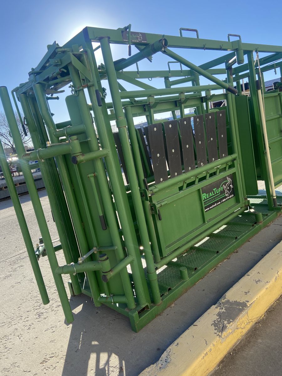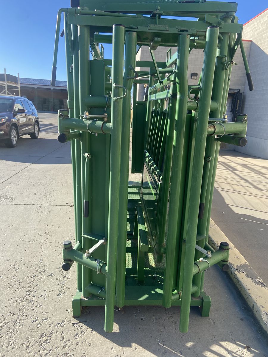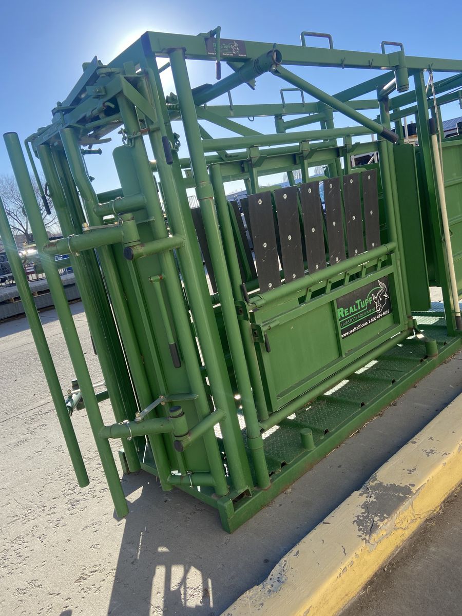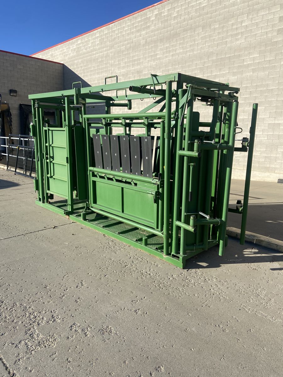 A squeeze chute is a specialized, narrow stall with moveable sides used by cattle ranchers to safely restrain individual cattle, calves, or bison for treatments like vaccination, ear tagging, branding, or pregnancy checks.