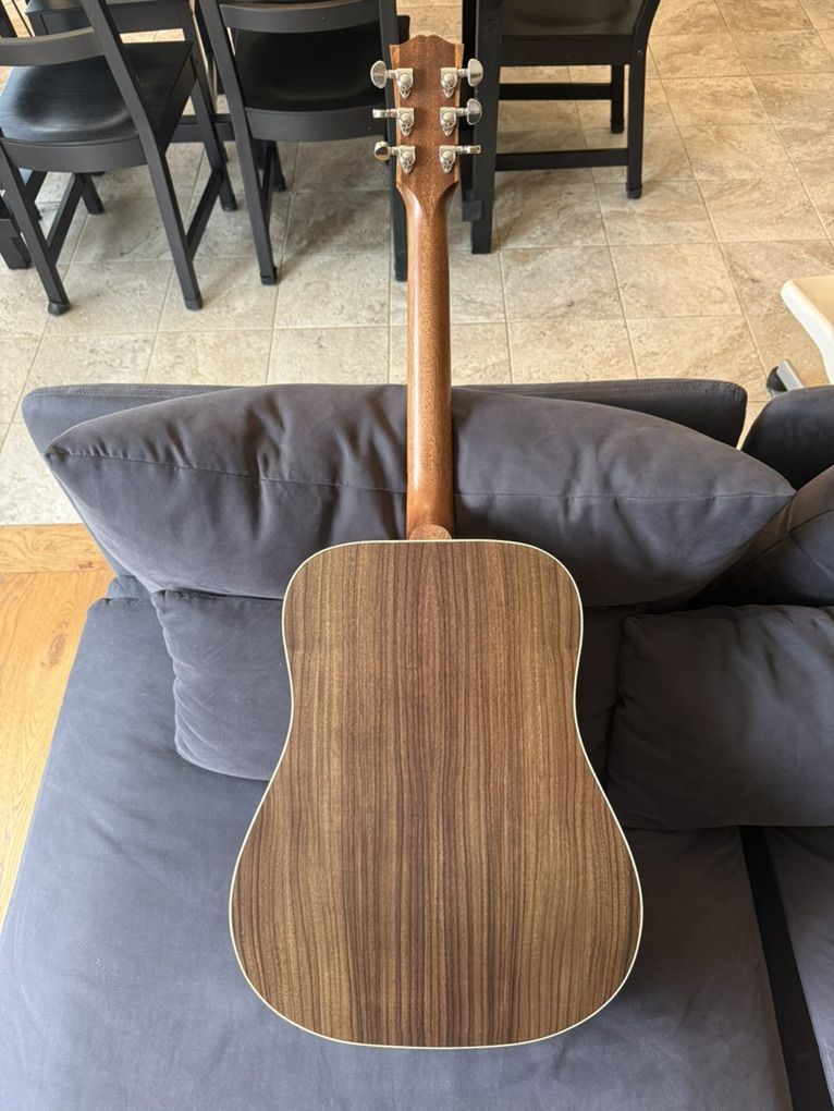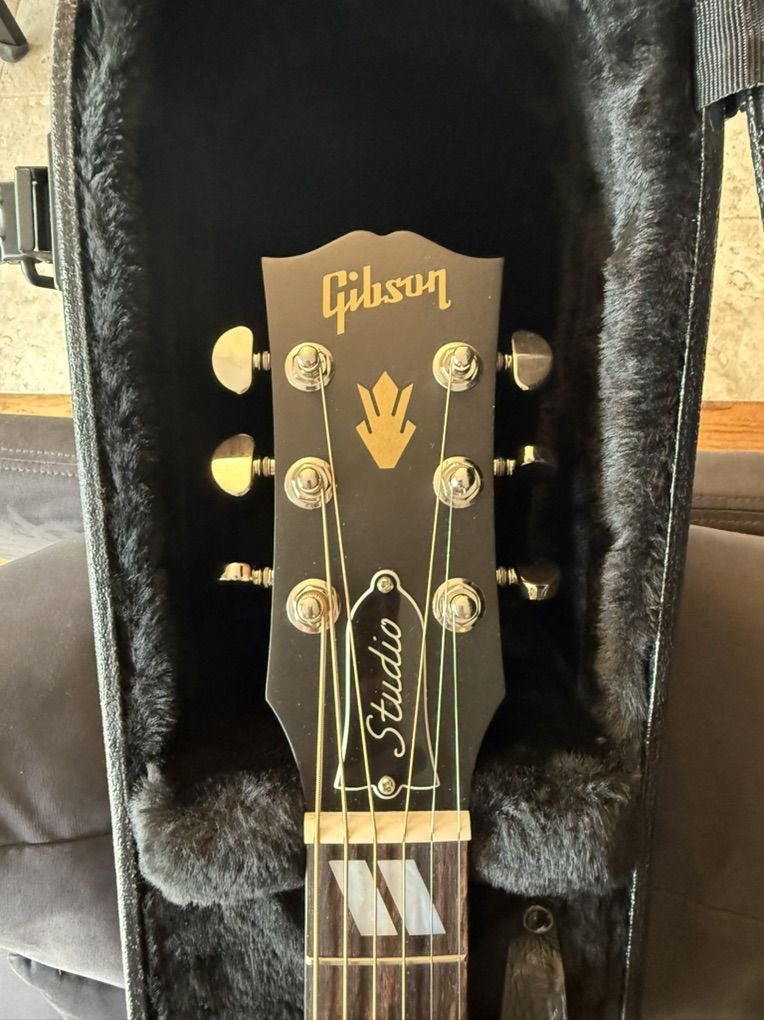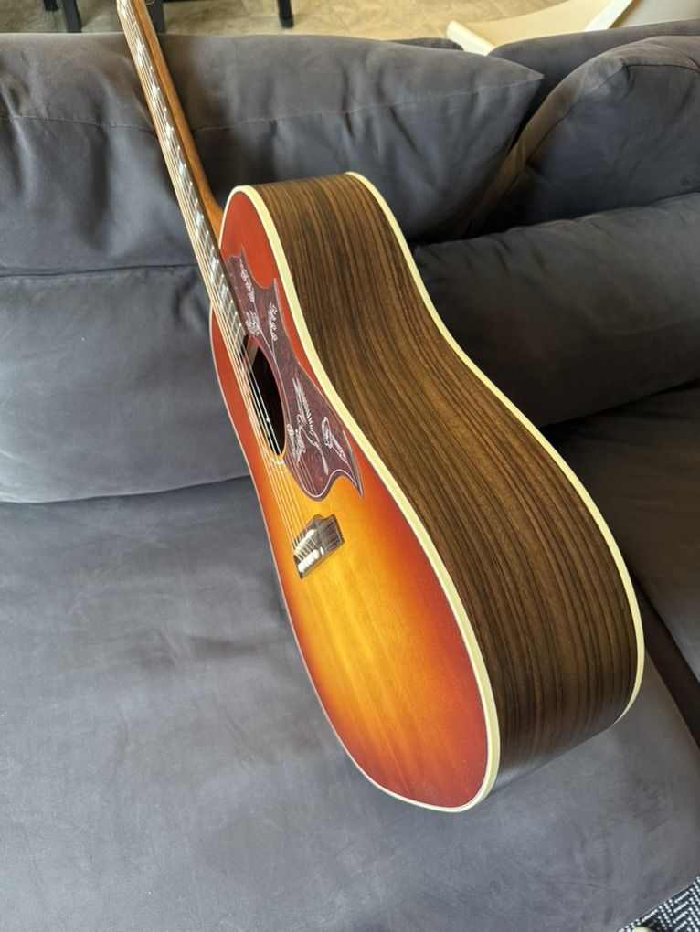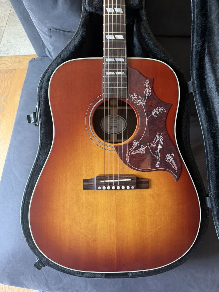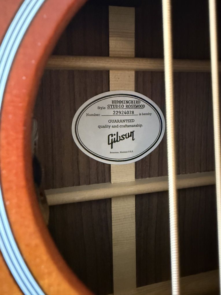 This is the Hummingbird Studio Rosewood edition with rosewood back and sides, unlike the Hummingbird Standard which has mahogany back and sides. It has a matte finish, an LR Baggs Element Pickup (only volume, no tone knob), and a really cool looking Gibson hardshell case.