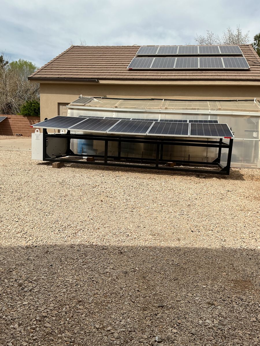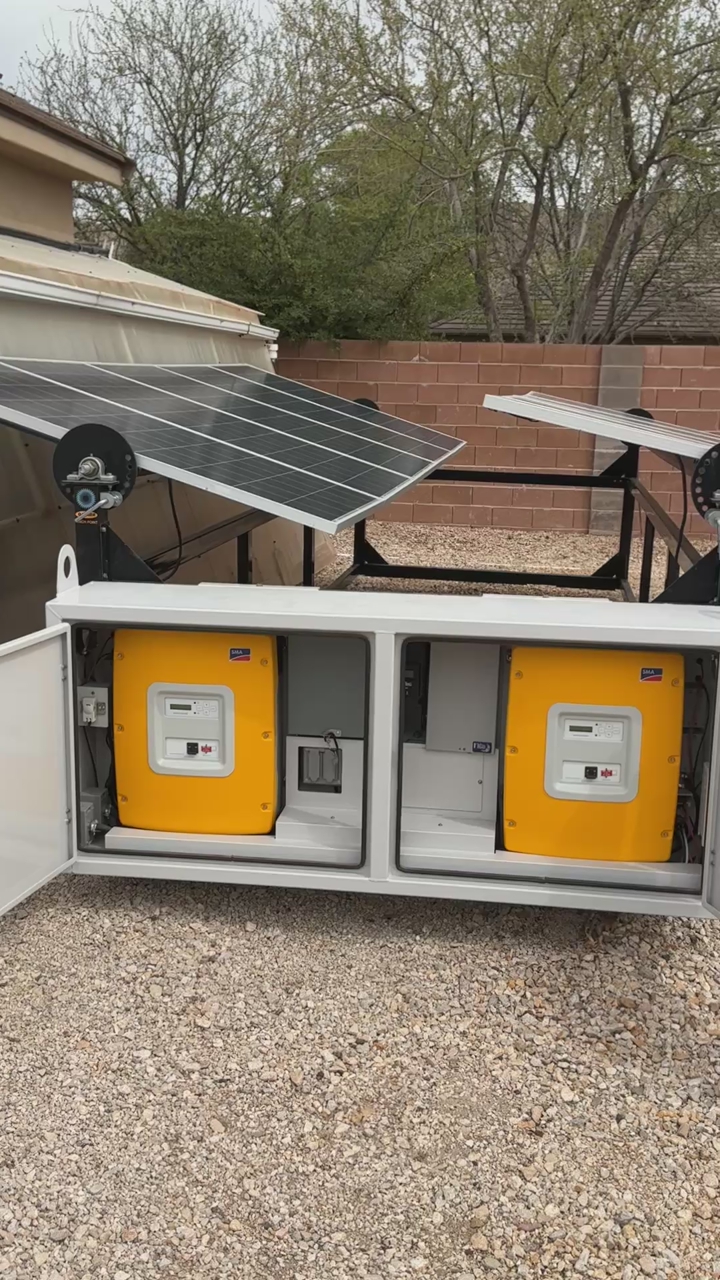 10 - 265 watt solar panels 2- SMA Sunny Island 6048 inverters (12 KW continuous) 1- Midnite Solar 250 charge controller 2- 120/240 volt 50 amp Hubbell twist lock outlets 6- 120 v 20 amp receptacles Rotatable solar arrays Add your own batteries
