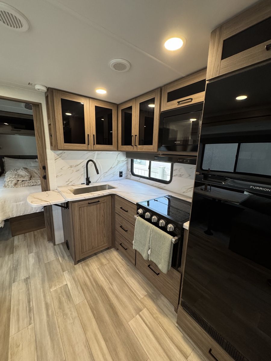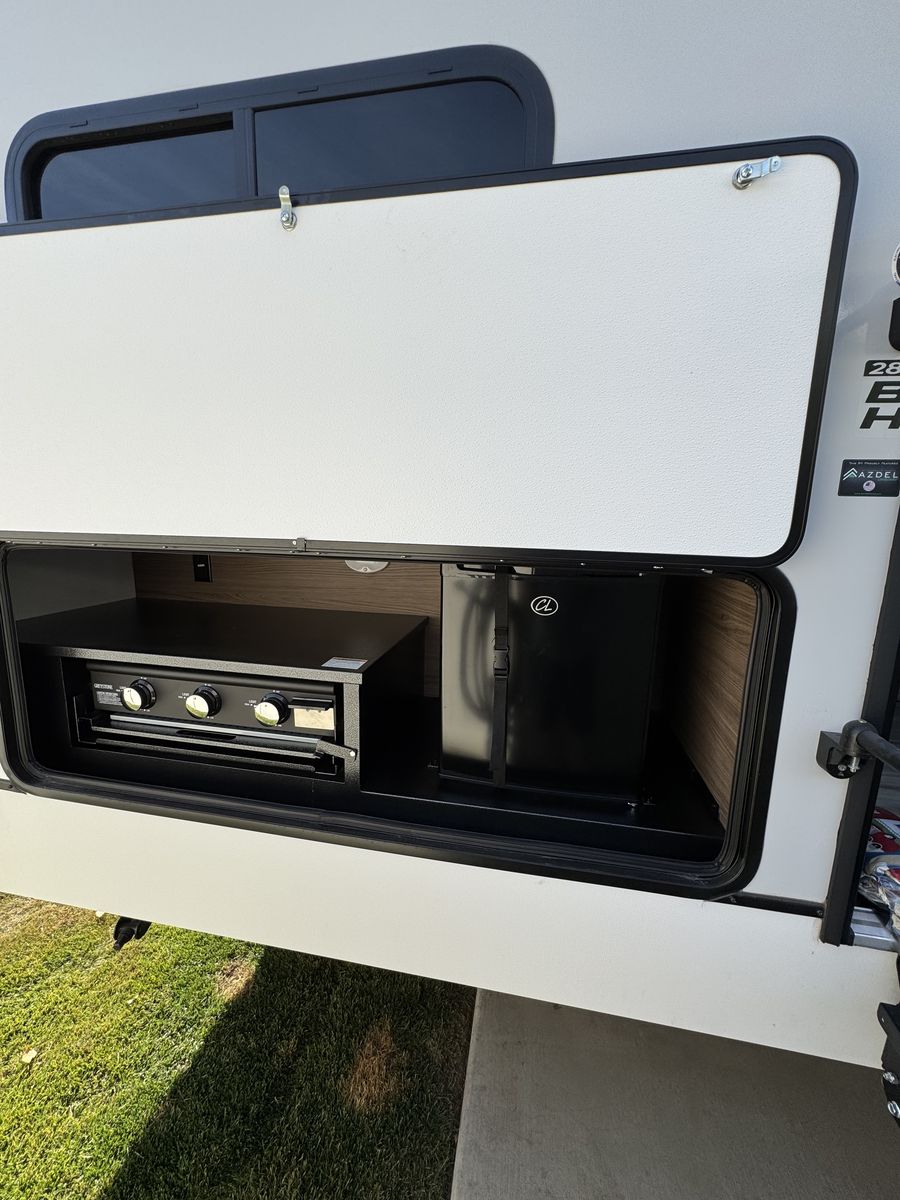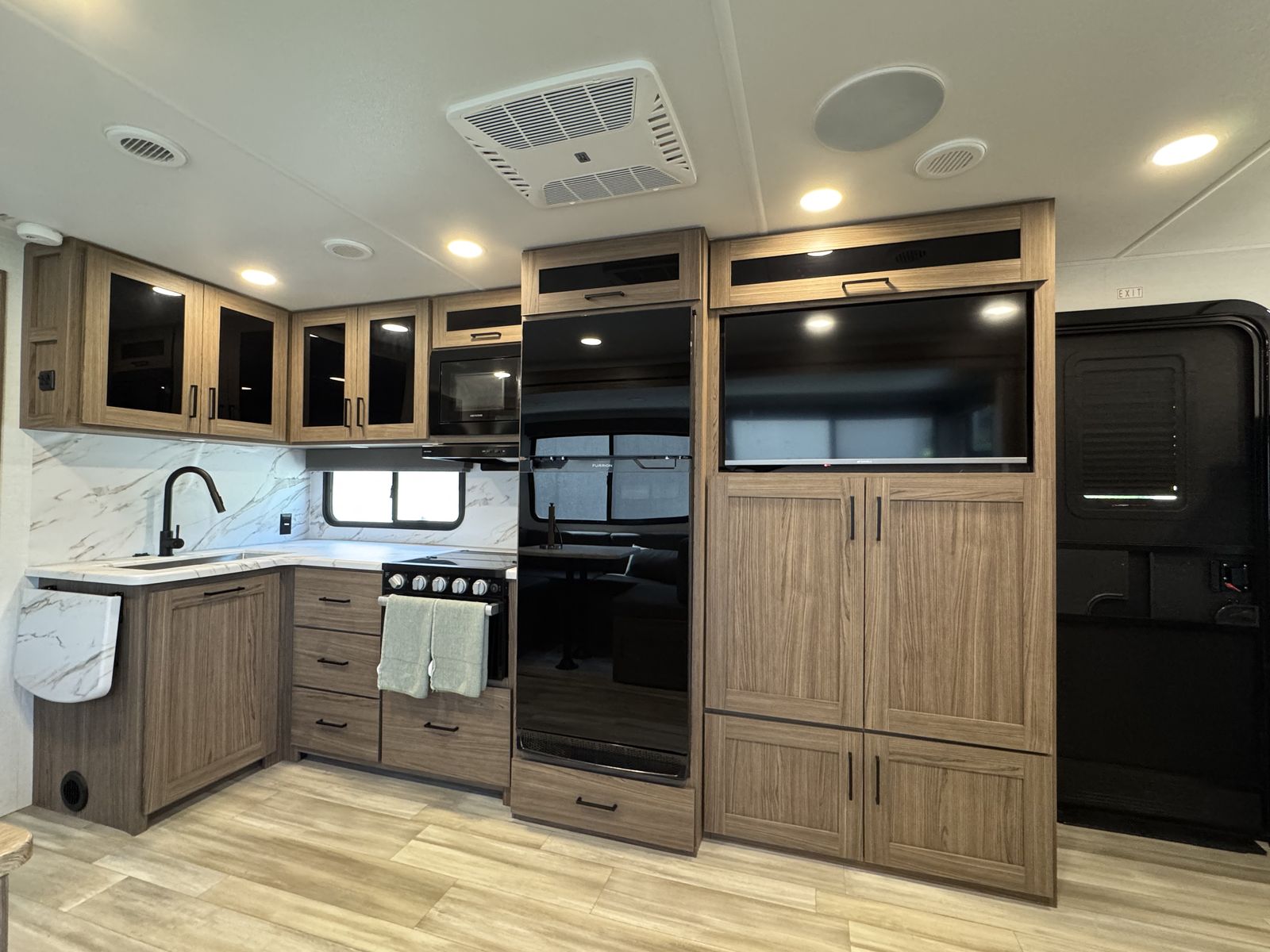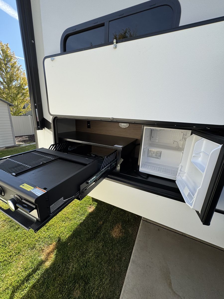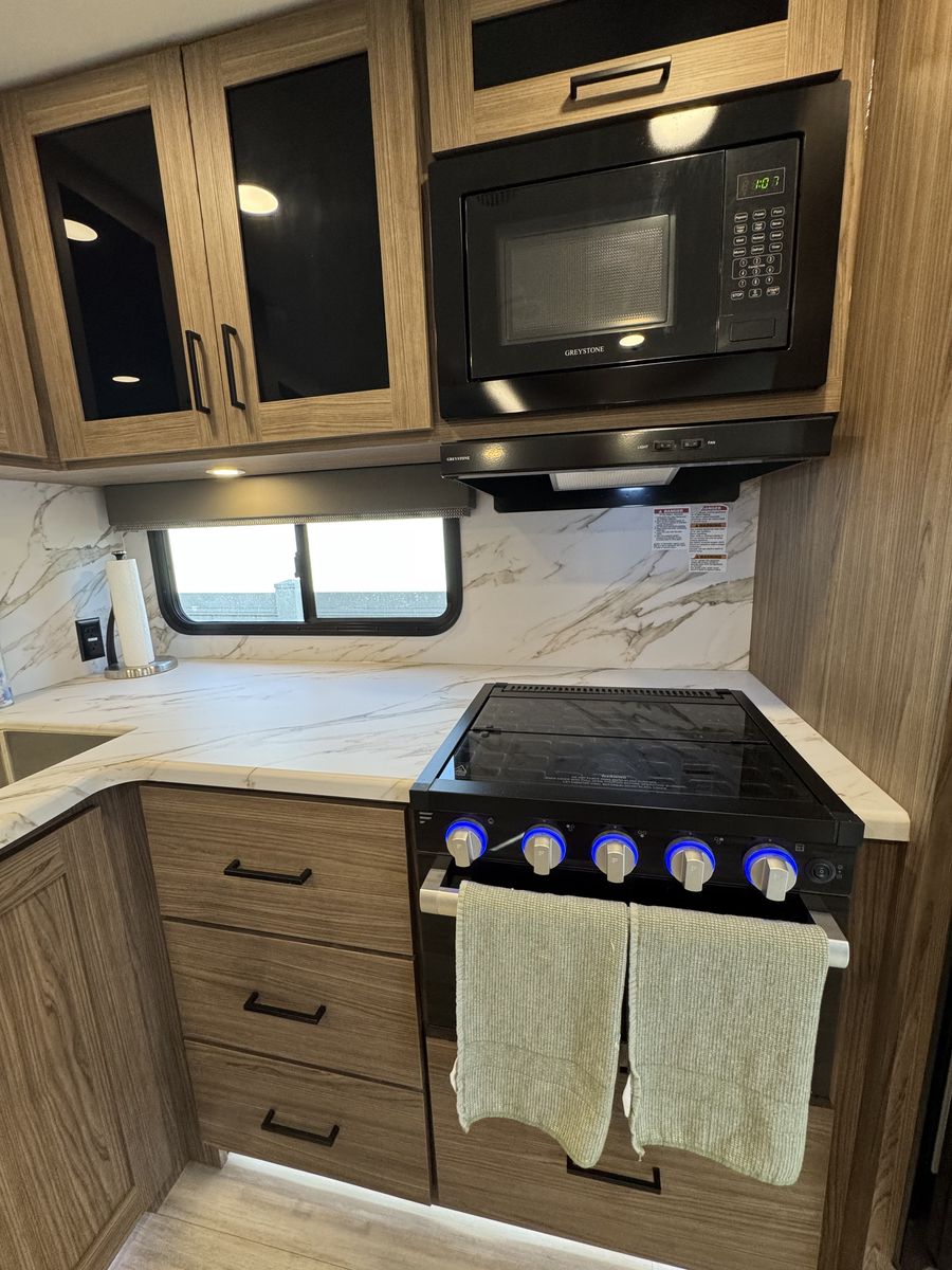 Two entry doors add convenience, allowing quick access to the private bedroom or main living area—ideal for early mornings or late-night entries without disturbing others. Inside, the kitchen is fully equipped with everything you need, including a three-burner range, spacious sink, 10 cu. ft. 12V refrigerator, and a flip-up counter extension for added prep space. Prefer cooking outdoors? Take advantage of the exterior griddle for meals in the fresh air.