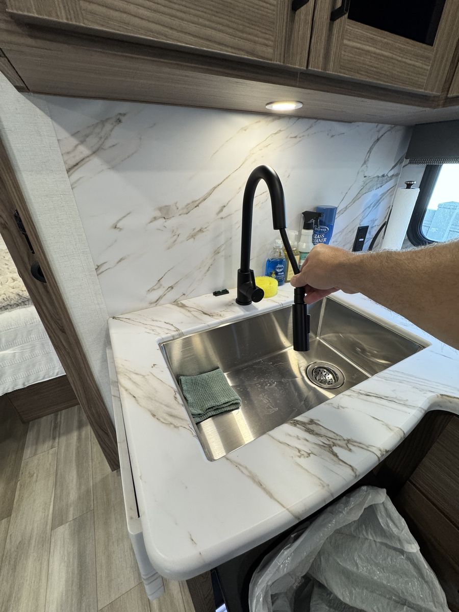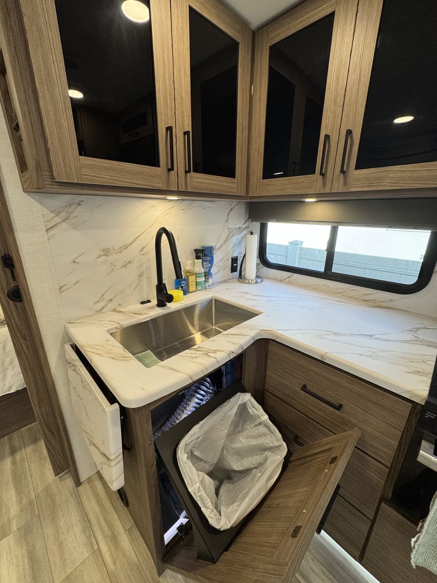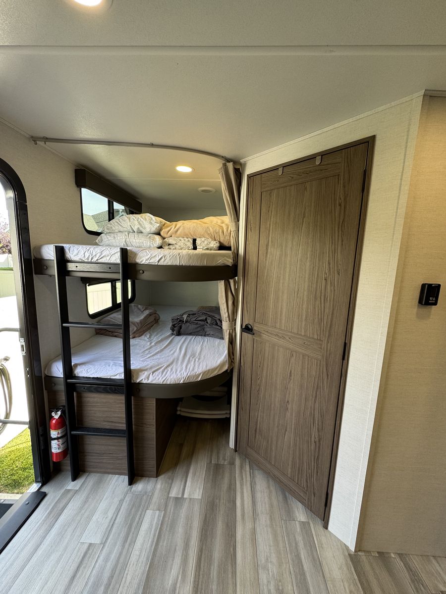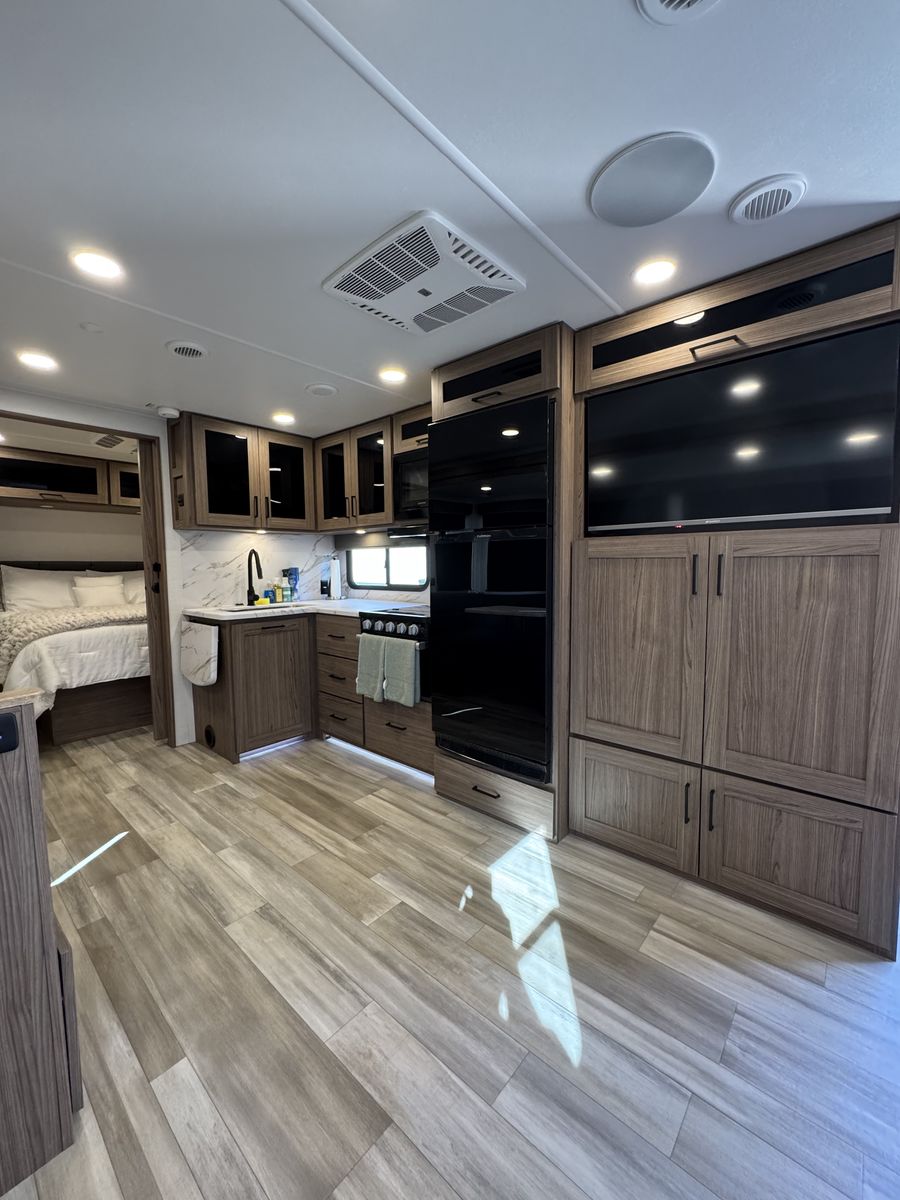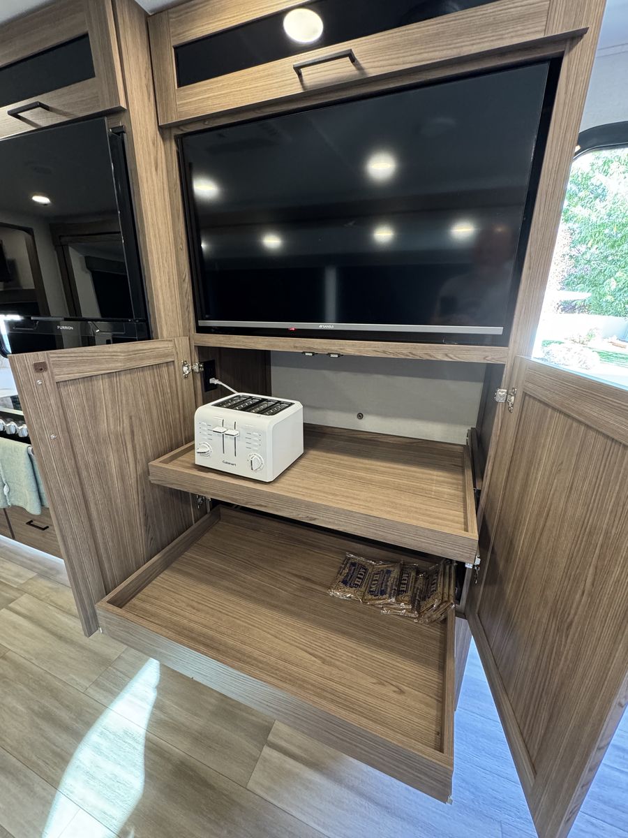 Two entry doors add convenience, allowing quick access to the private bedroom or main living area—ideal for early mornings or late-night entries without disturbing others. Inside, the kitchen is fully equipped with everything you need, including a three-burner range, spacious sink, 10 cu. ft. 12V refrigerator, and a flip-up counter extension for added prep space. Prefer cooking outdoors? Take advantage of the exterior griddle for meals in the fresh air.