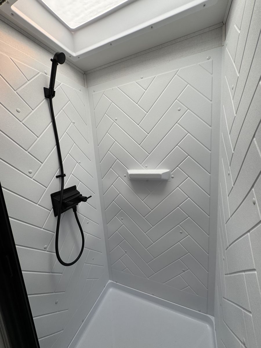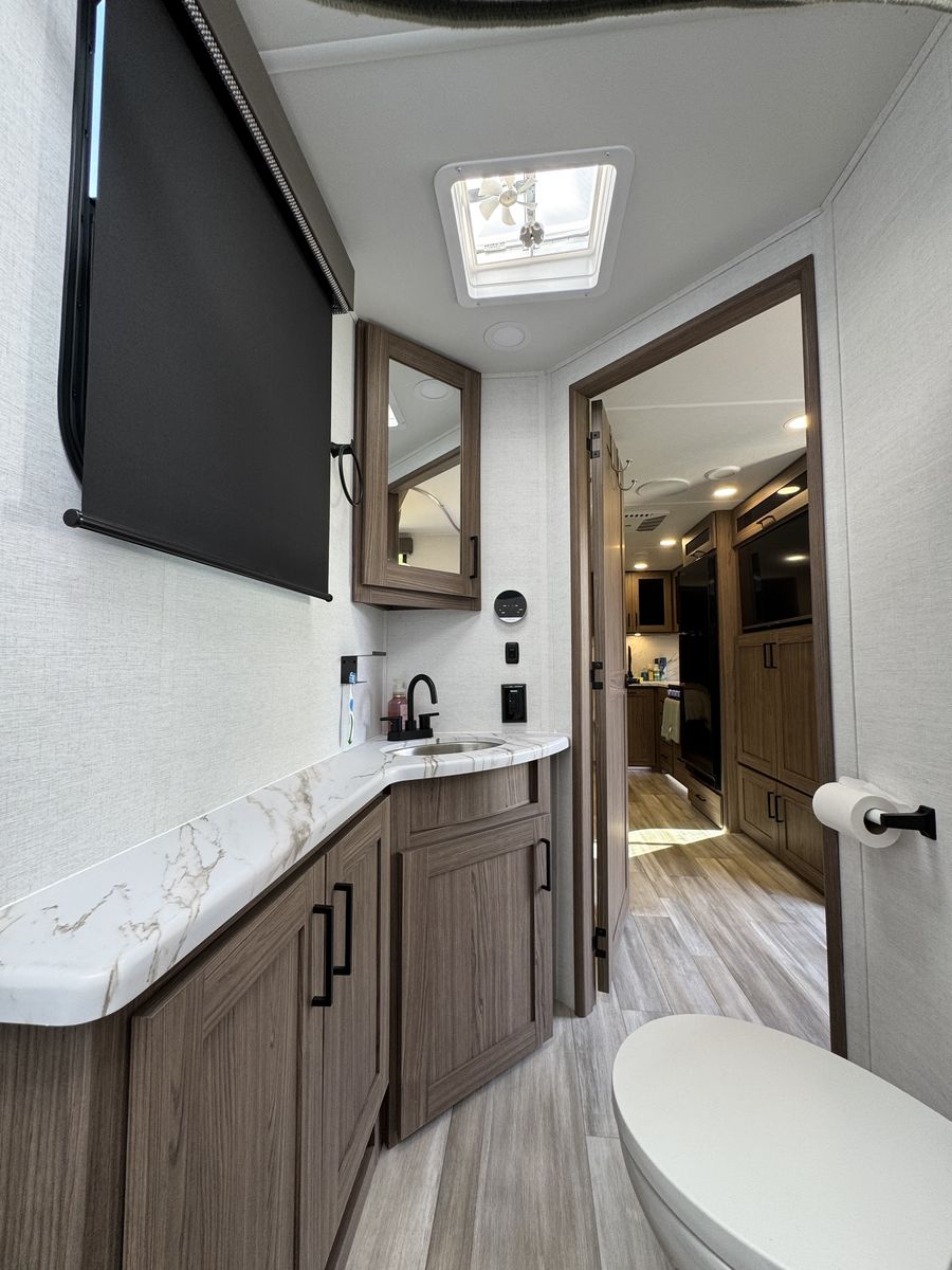 The rear corner bathroom is thoughtfully designed with a 30" x 36" shower, vanity with sink, soft-close porcelain toilet with foot flush, and a linen cabinet to keep essentials organized.
