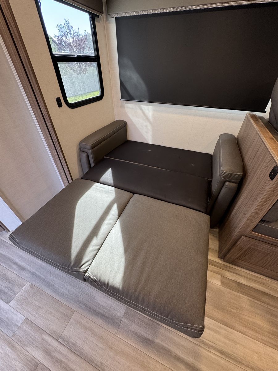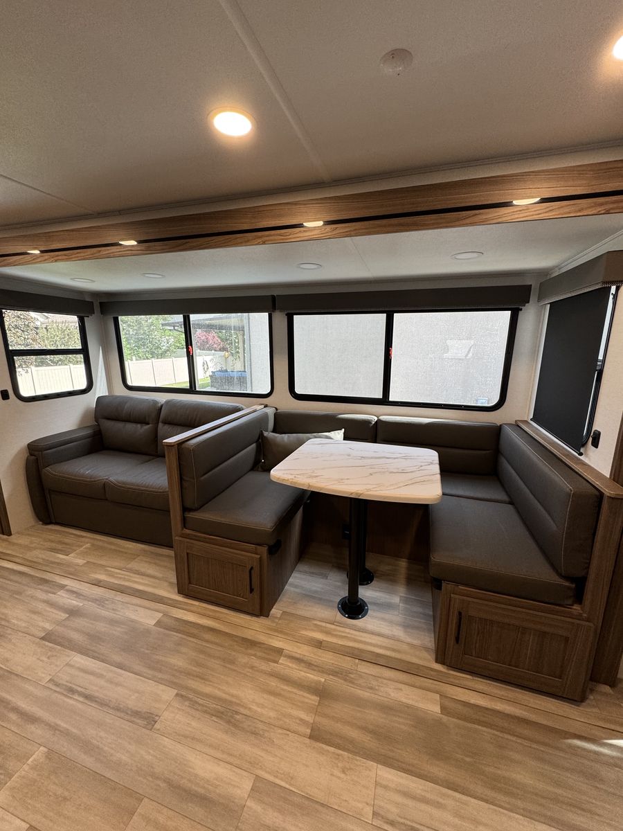 This travel trailer is an excellent choice for families and those who enjoys bringing friends along for the adventure. A large slide-out expands the main living area, creating an open and comfortable space complete with fold out bed seating and a U-shaped dinette—perfect for relaxing, dining, or game nights. The dinette also converts into extra sleeping space when needed, while a 40" HDTV across from the seating makes movie nights easy and enjoyable.