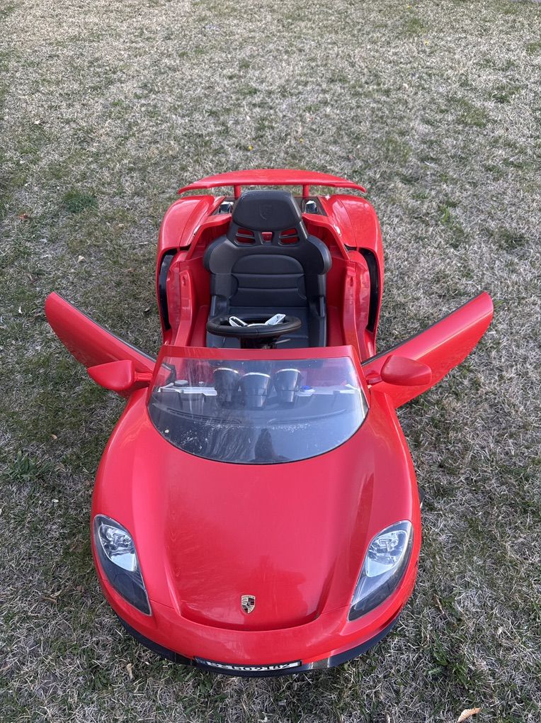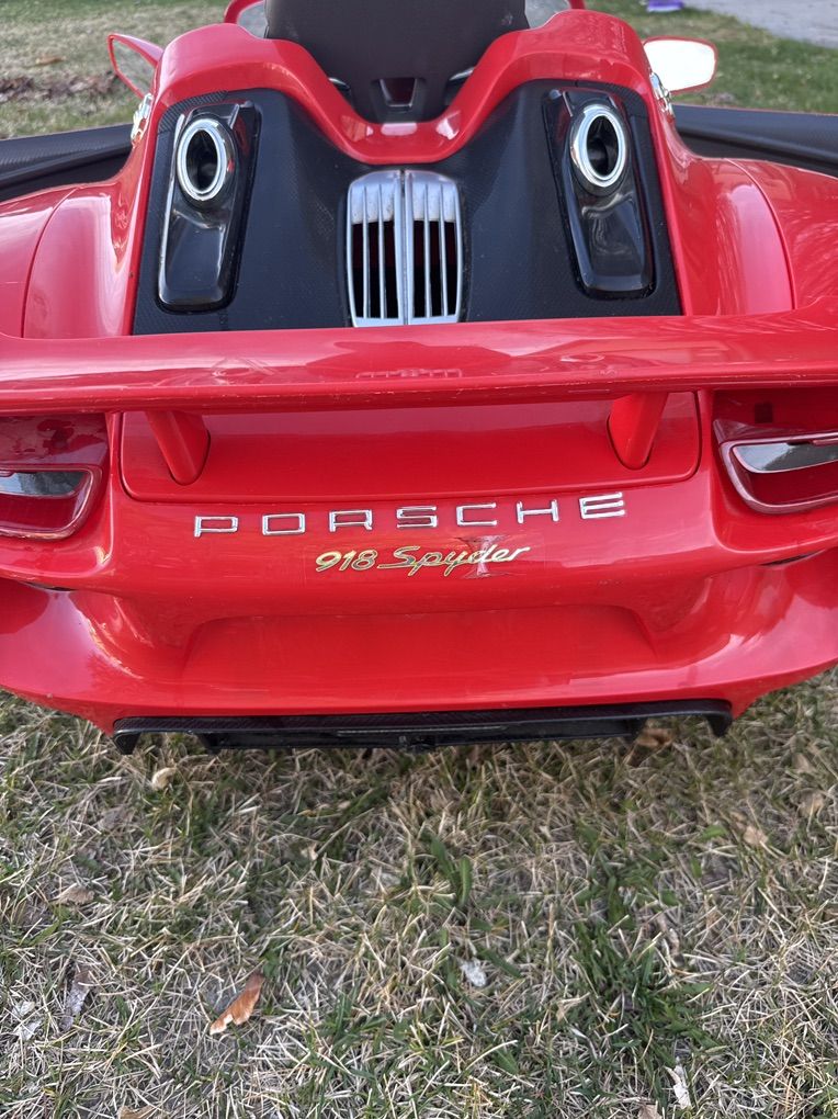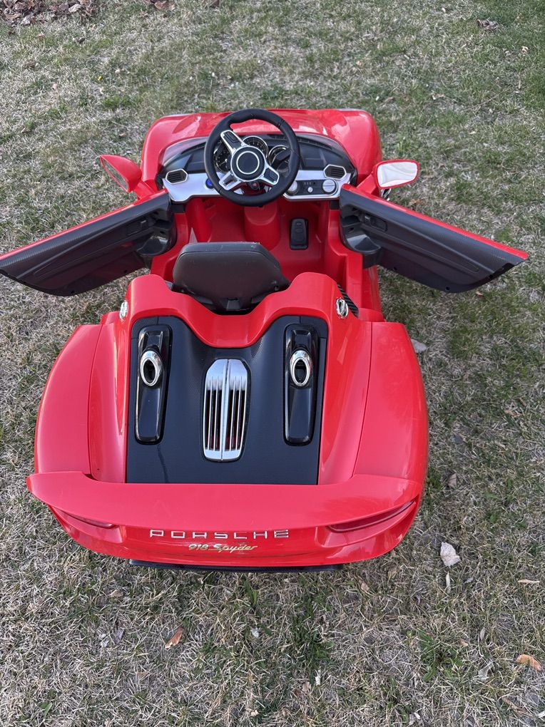 FUN TODDLER CAR: Quality kids car reaches forward and reverse speeds of 2.5 MPH for a safe ride FUNCTIONAL FEATURES: Integrated battery life indicator, cup holders, clear windshield, detailed dashboard, 2 opening doors, rubber traction strips, and chrome rims make this ride on car realistic and functional AUX PORT: Lets you listen to music from your phone or MP3 Player LUXURY DETAILS: Details mimic the luxury and prestige of the Porsche 918 - including rear exhaust pipes, realistic engine noises and horn, plus working LED headlights POWERFUL BATTERY: Includes 6 Volt rechargeable battery that provides up to 2 hours of run time COMPACT KIDS SIZE: Overall Dimensions: 50.36L x 24.8W x 20.08H; Weight Capacity: 77 lbs.; Recommended for ages 3 and up