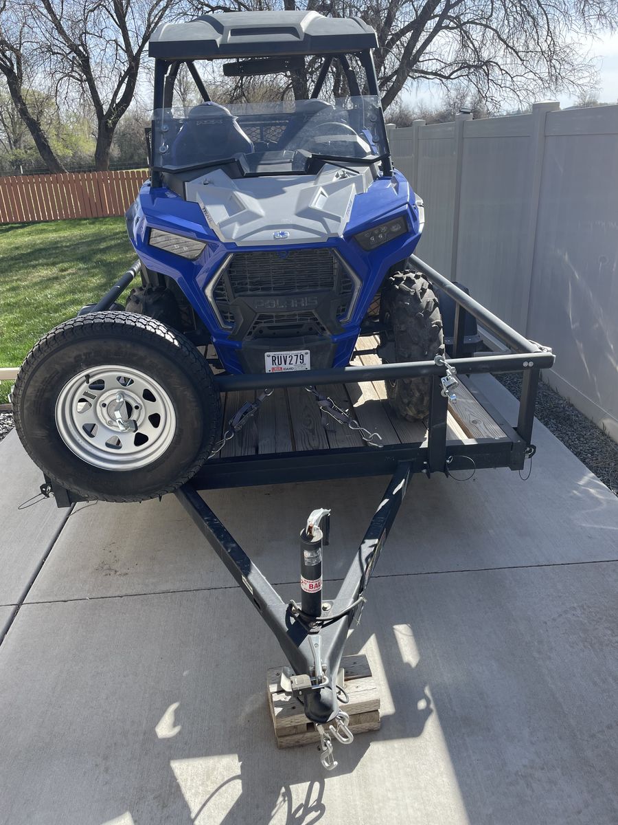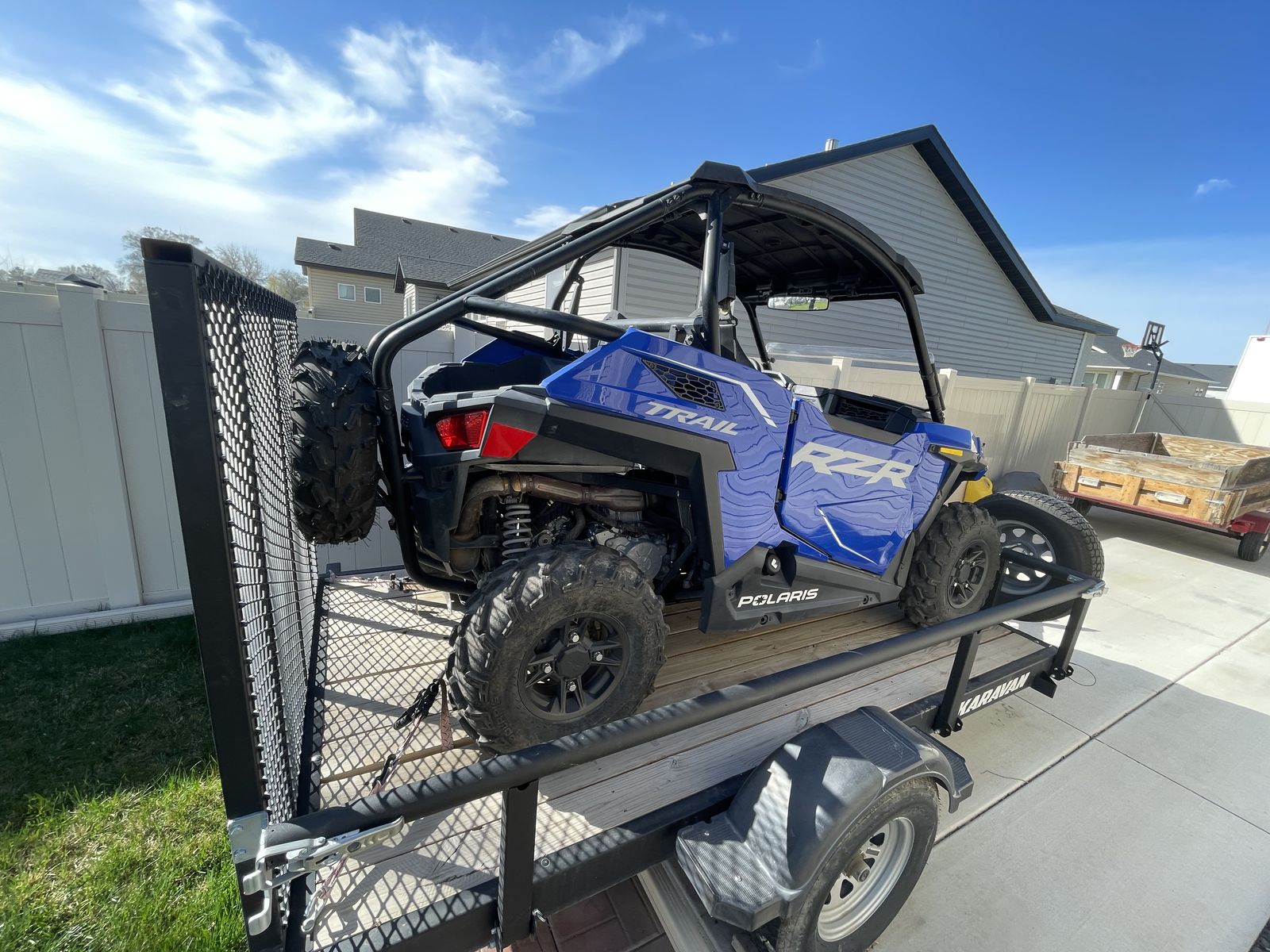 Trailer is a 10 ft. Karavan w/fold down sides, rear ramp, and spare tire