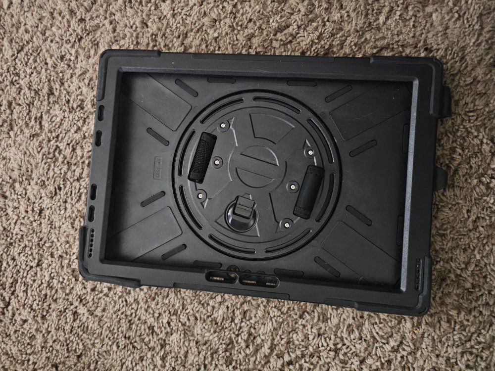 Heavy-duty protective cover fits Surface Pro models 4, 5, 6, 7, and 7+ (12.3" screen). Features a built-in kickstand and a rotating hand strap on the back for a secure grip. Solid, durable construction to keep the tablet safe. Cash only. Pick up in Sandy.