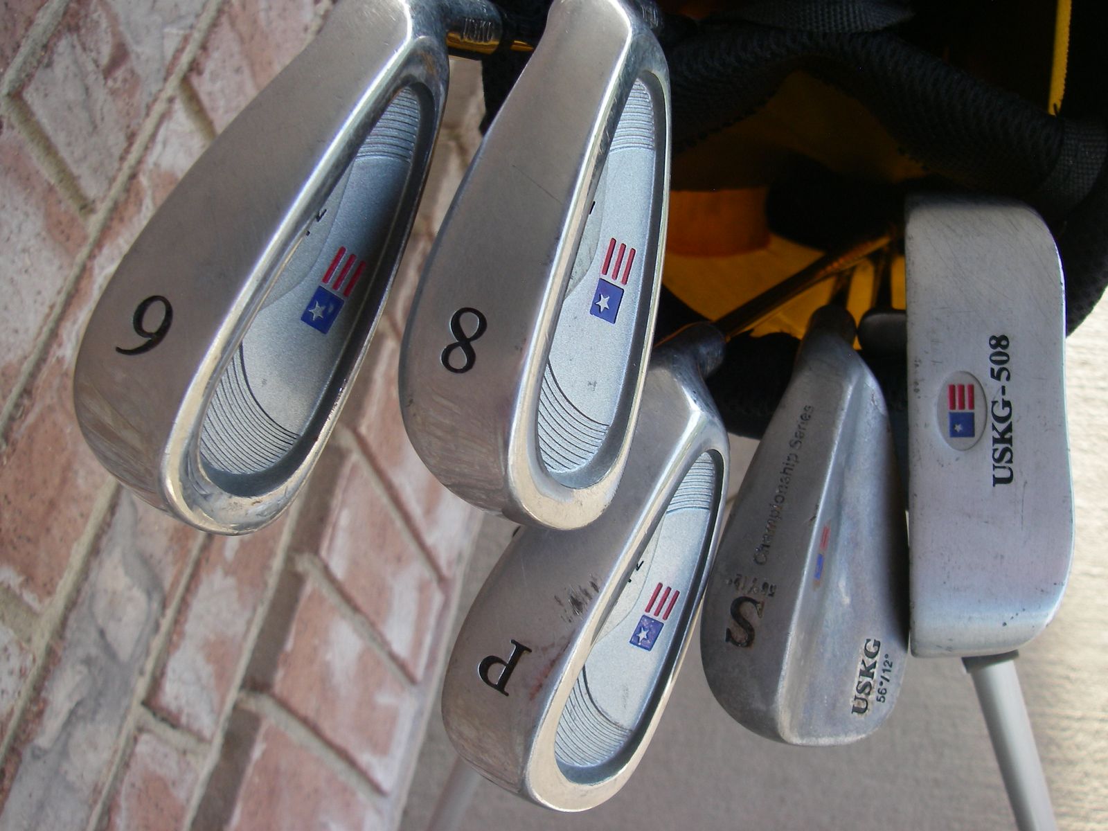 #6, 8, PW, SW* IRONS, w/ Steel Shafts (*Note, the SW is a very expensive, USKG CHAMPIONSHIP SERIES 8620 Soft Stainless Steel OIL CAN, meant to look rusty)