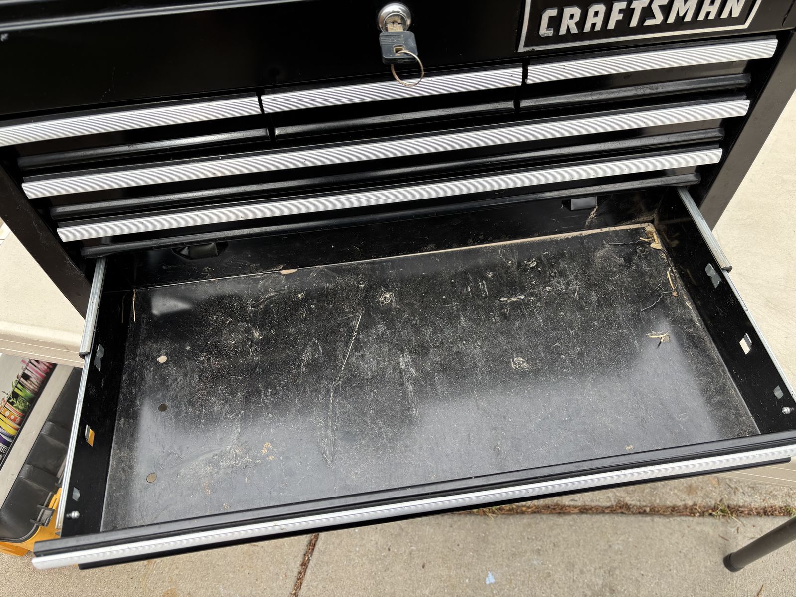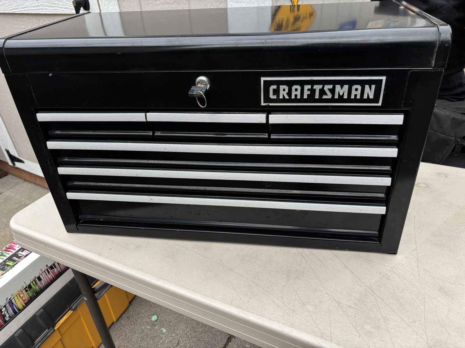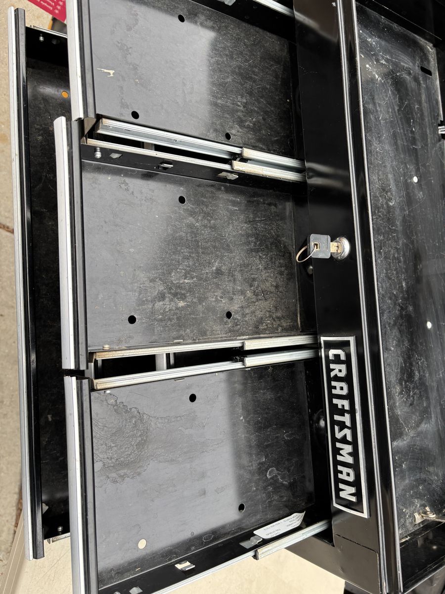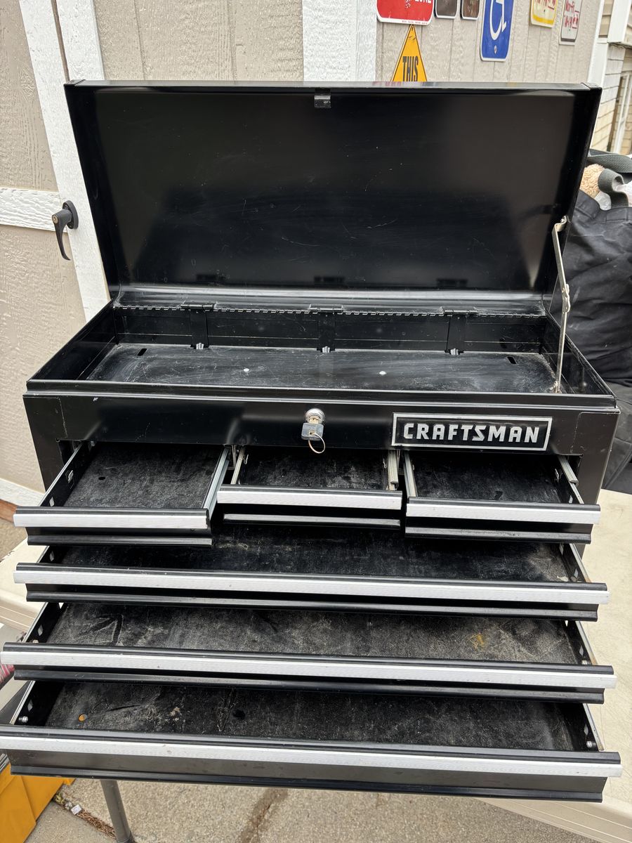 VenmoHeavy duty CRAFTSMAN 6 Drawer Ball-bearing large Steel Tool Chest Black Storage Stack with key In good condition with some scratches and scuff marks here and there. 26” x 15.5” x 12”