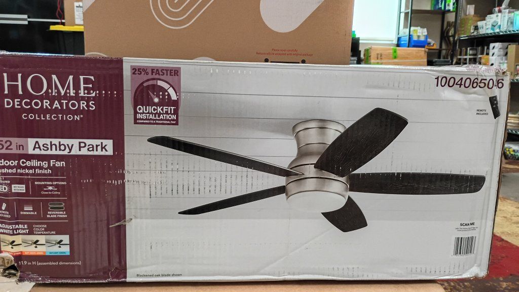 New in box Home Decorators Collection Ashby Park 52 in. White Color Changing Integrated LED Brushed Nickel Ceiling Fan with Light Kit and Remote Control