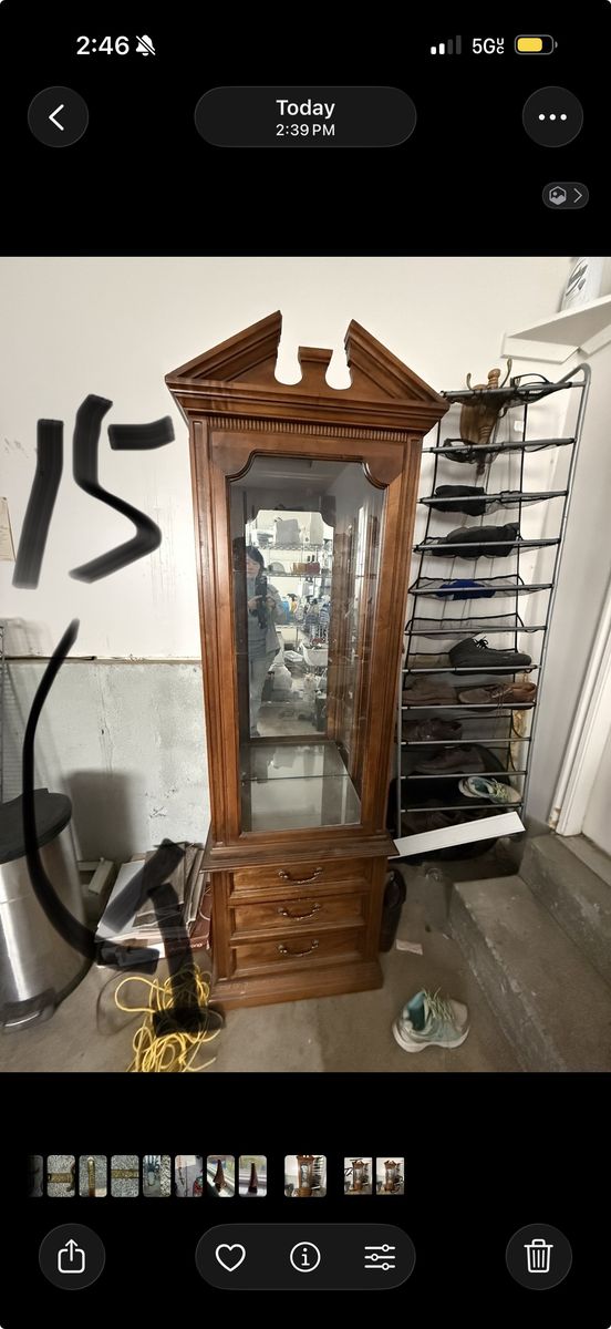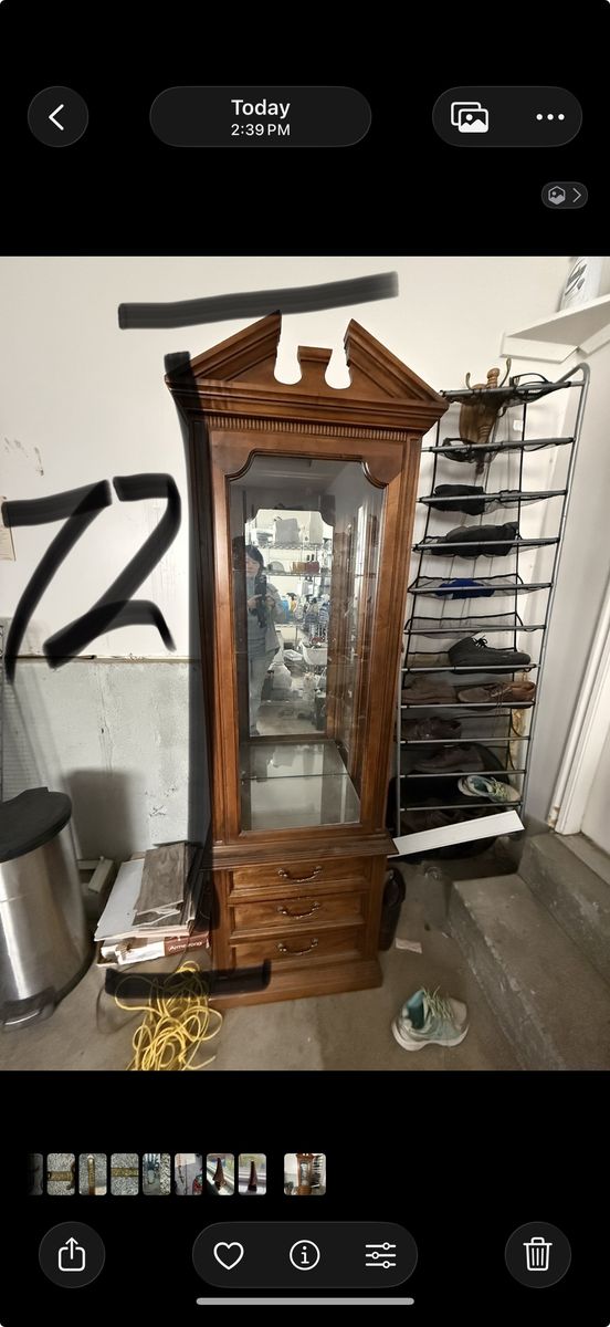 Beautiful solid wood curio/display cabinet with classic decorative top. Great piece for showcasing collectibles, china, or decor.\