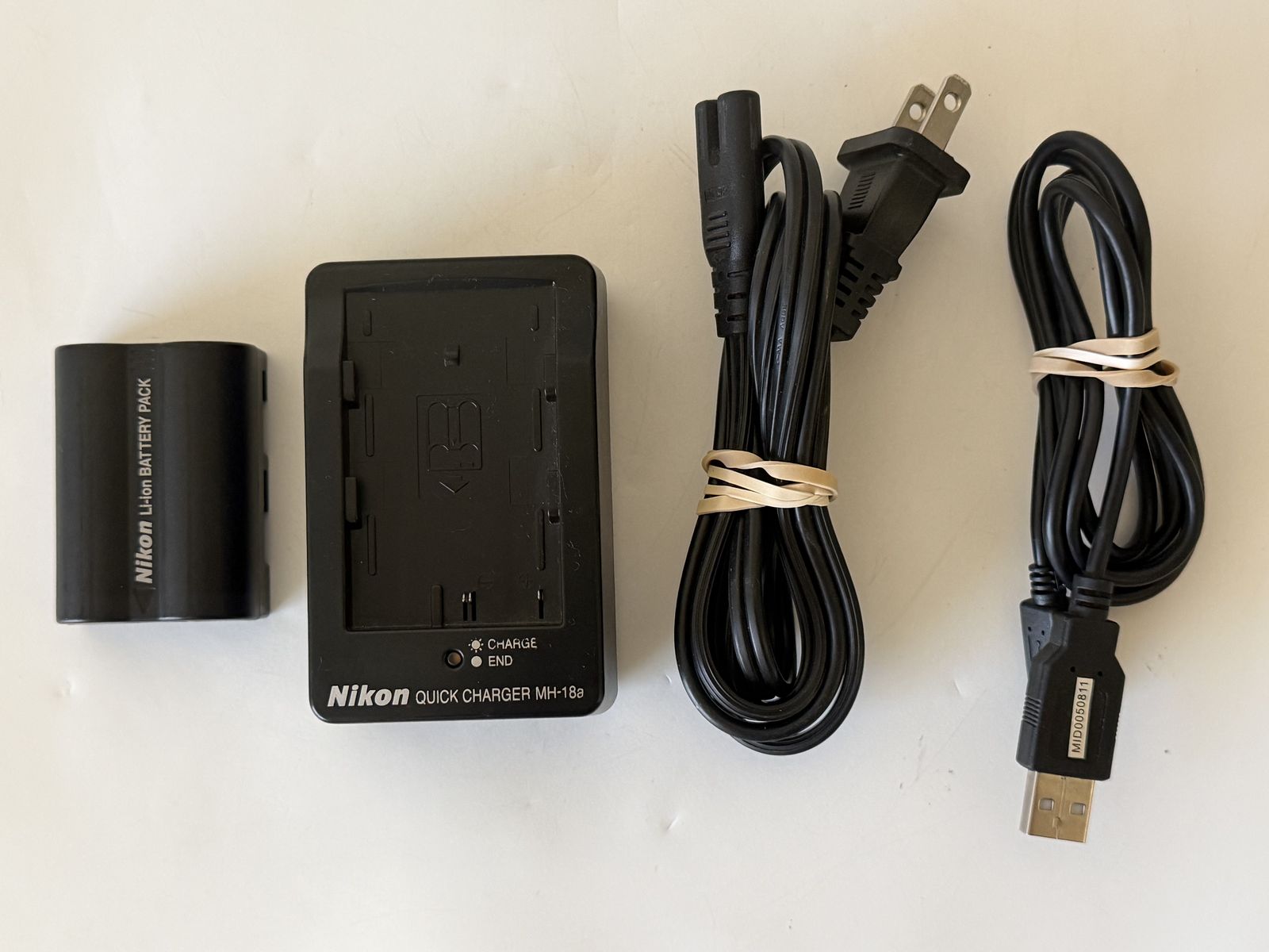 Comes with case, nikkor lens, battery, usb cable and battery.