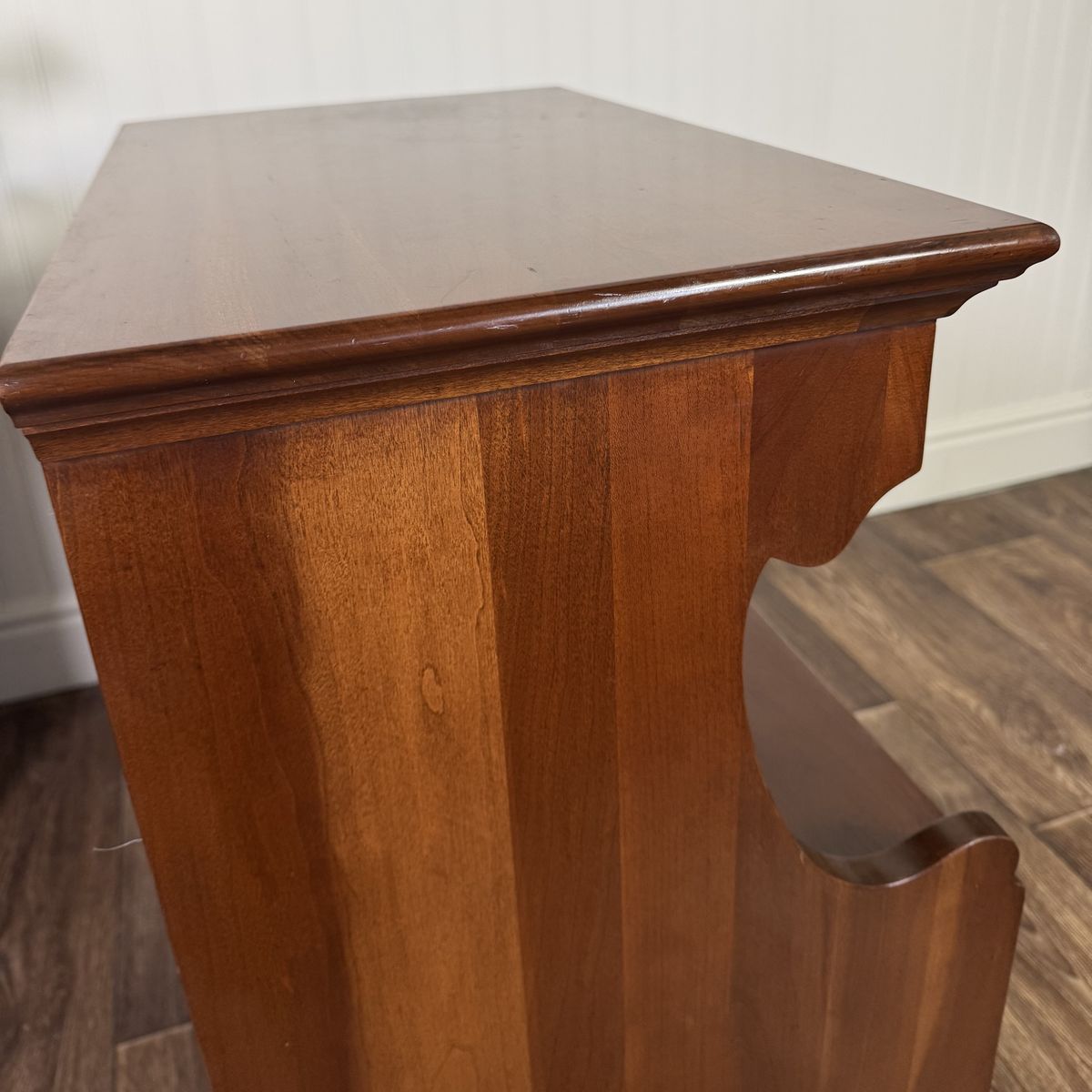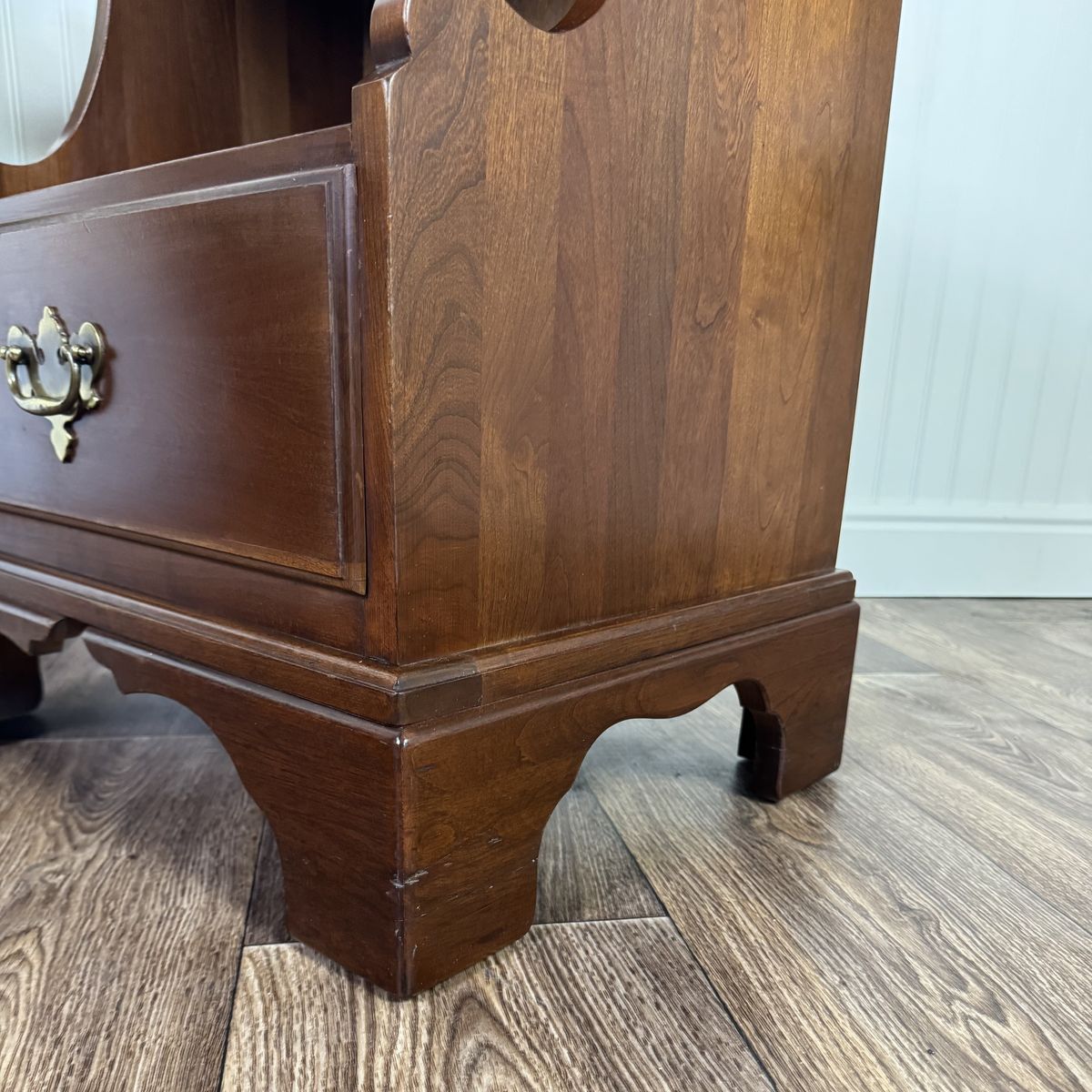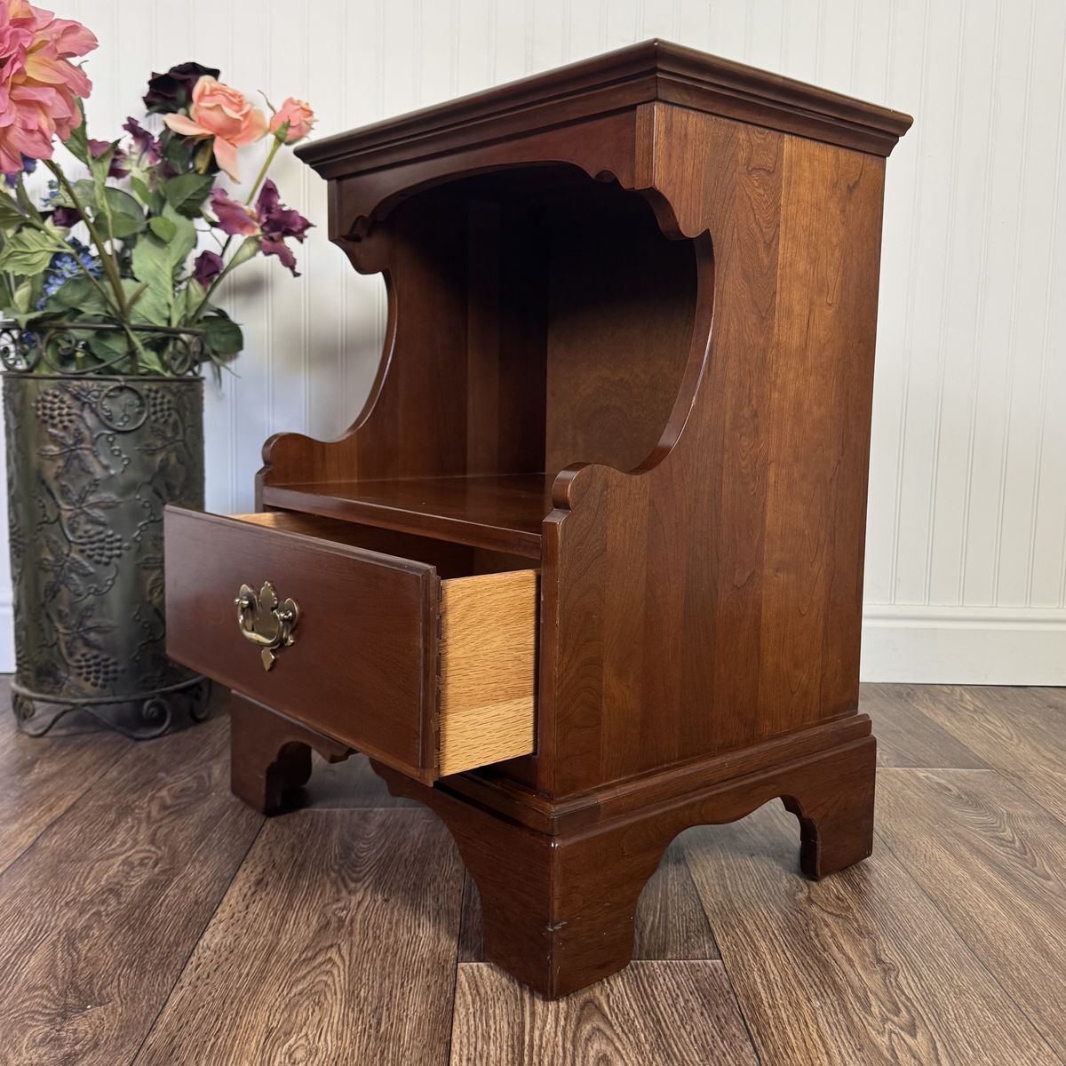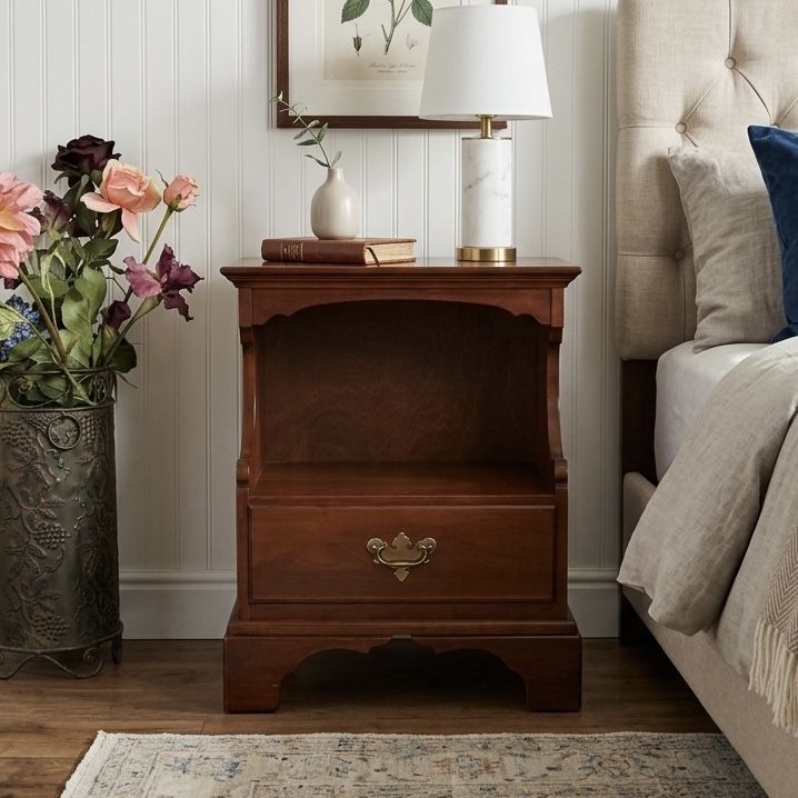 VenmoLovely nightstand from the coveted John Vogler Group by Unique Furniture Makers (Winston-Salem, NC). This piece features a rich, warm cherry finish, a smooth-gliding dovetailed drawer, elegant bracket feet, and a scalloped open cubby for storage.