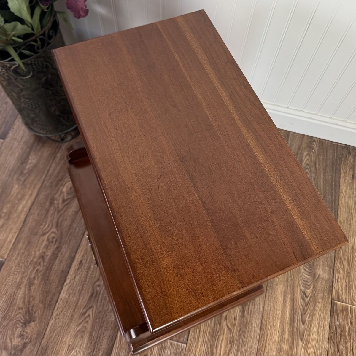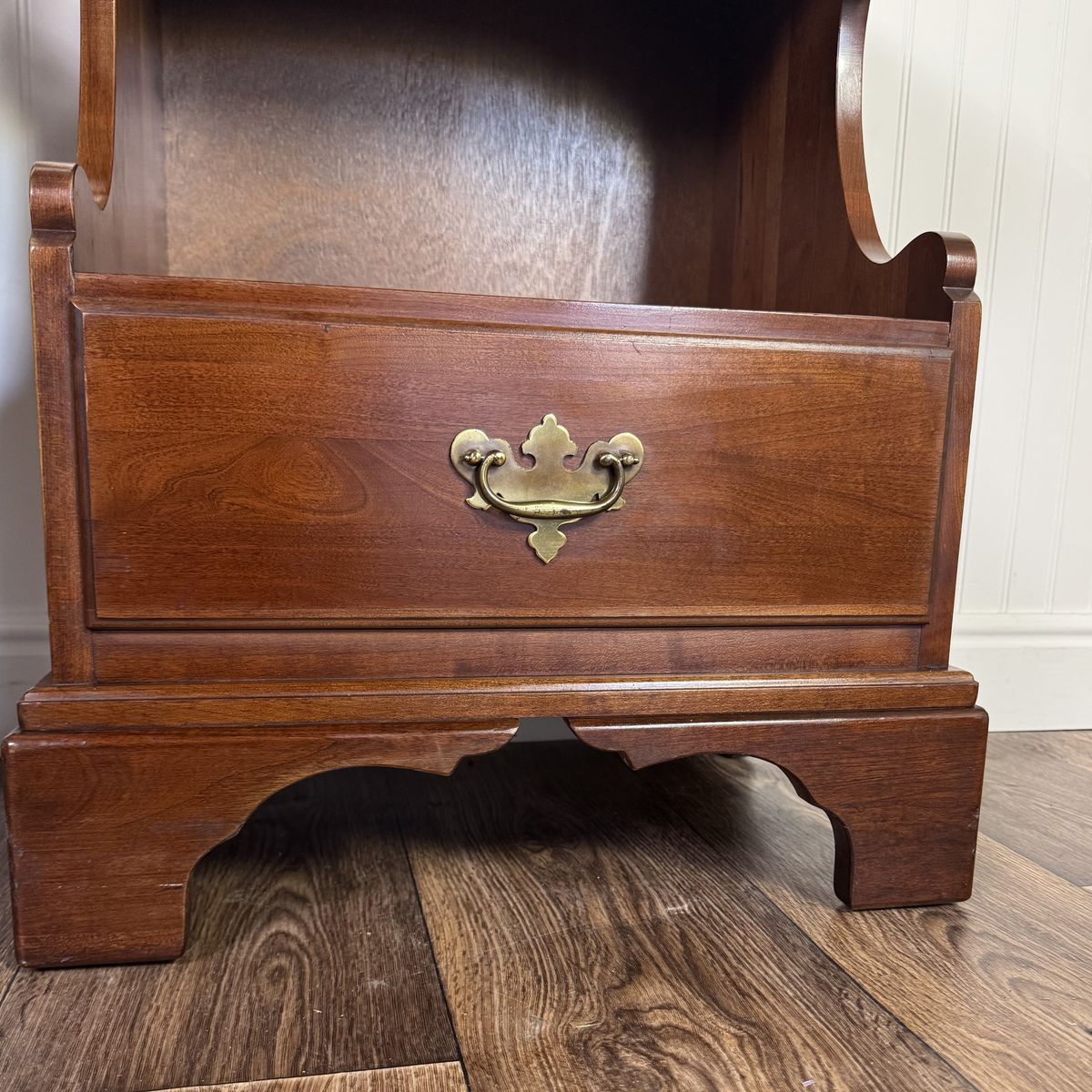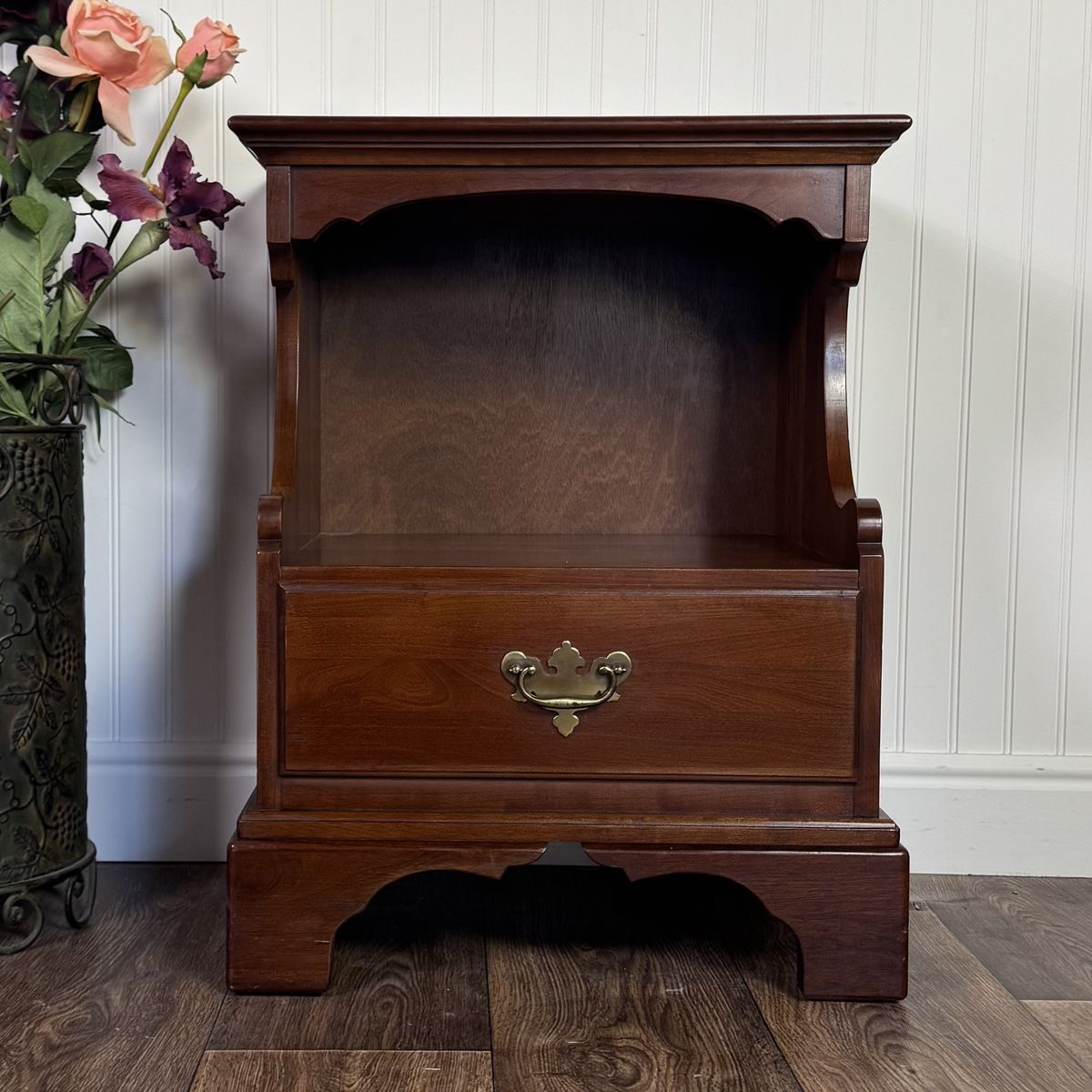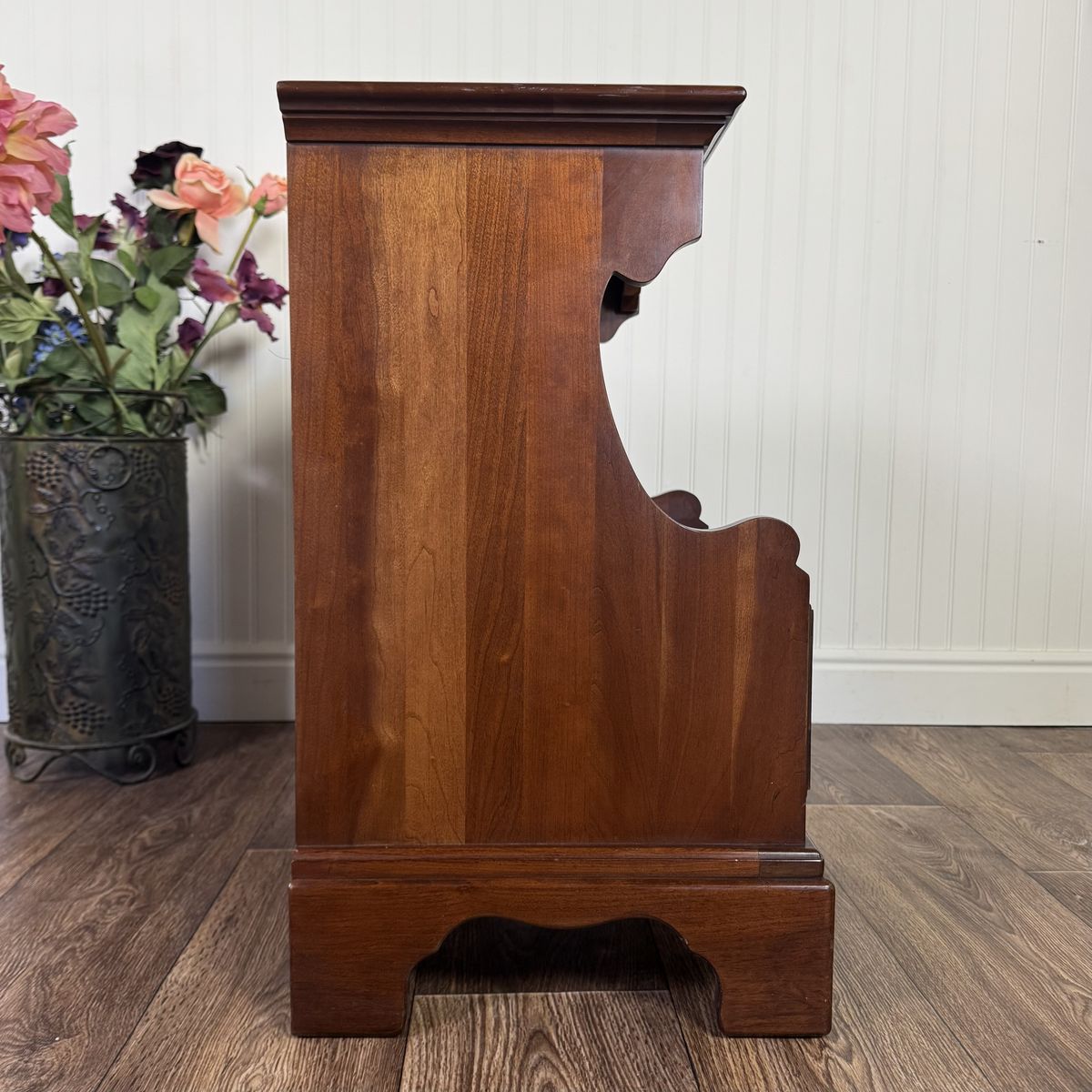 VenmoLovely nightstand from the coveted John Vogler Group by Unique Furniture Makers (Winston-Salem, NC). This piece features a rich, warm cherry finish, a smooth-gliding dovetailed drawer, elegant bracket feet, and a scalloped open cubby for storage.