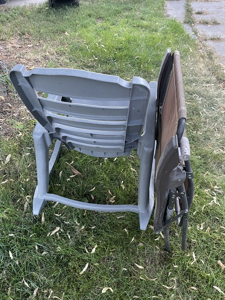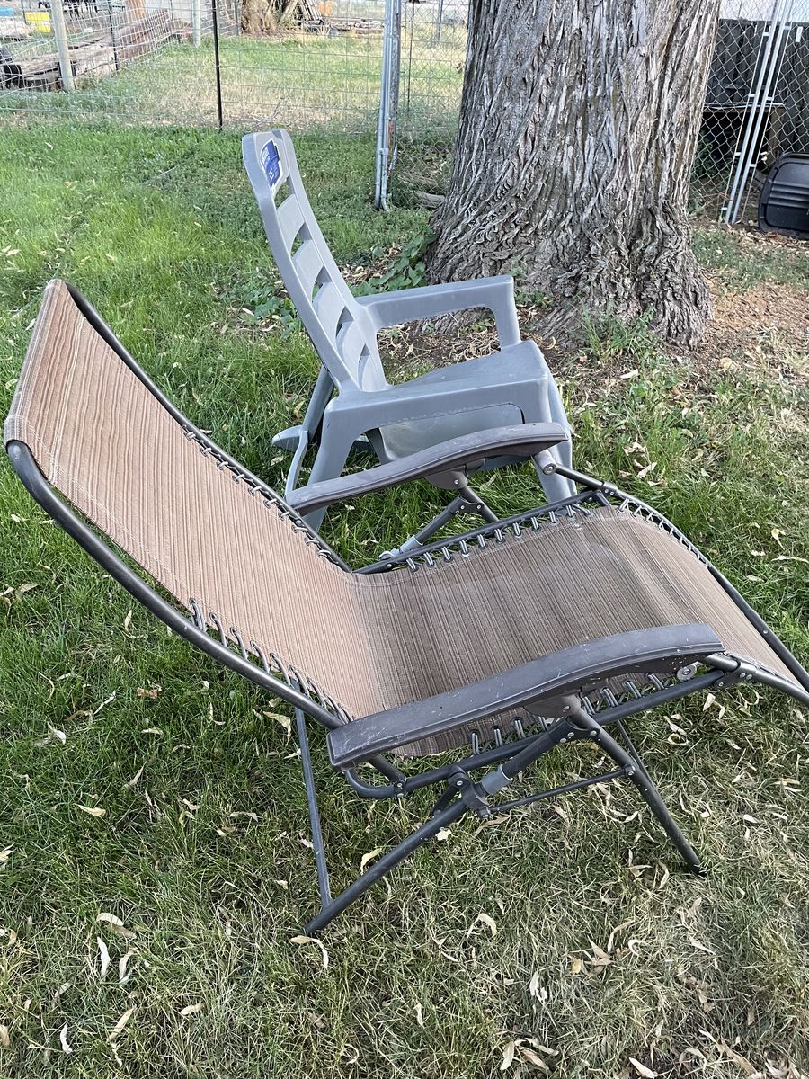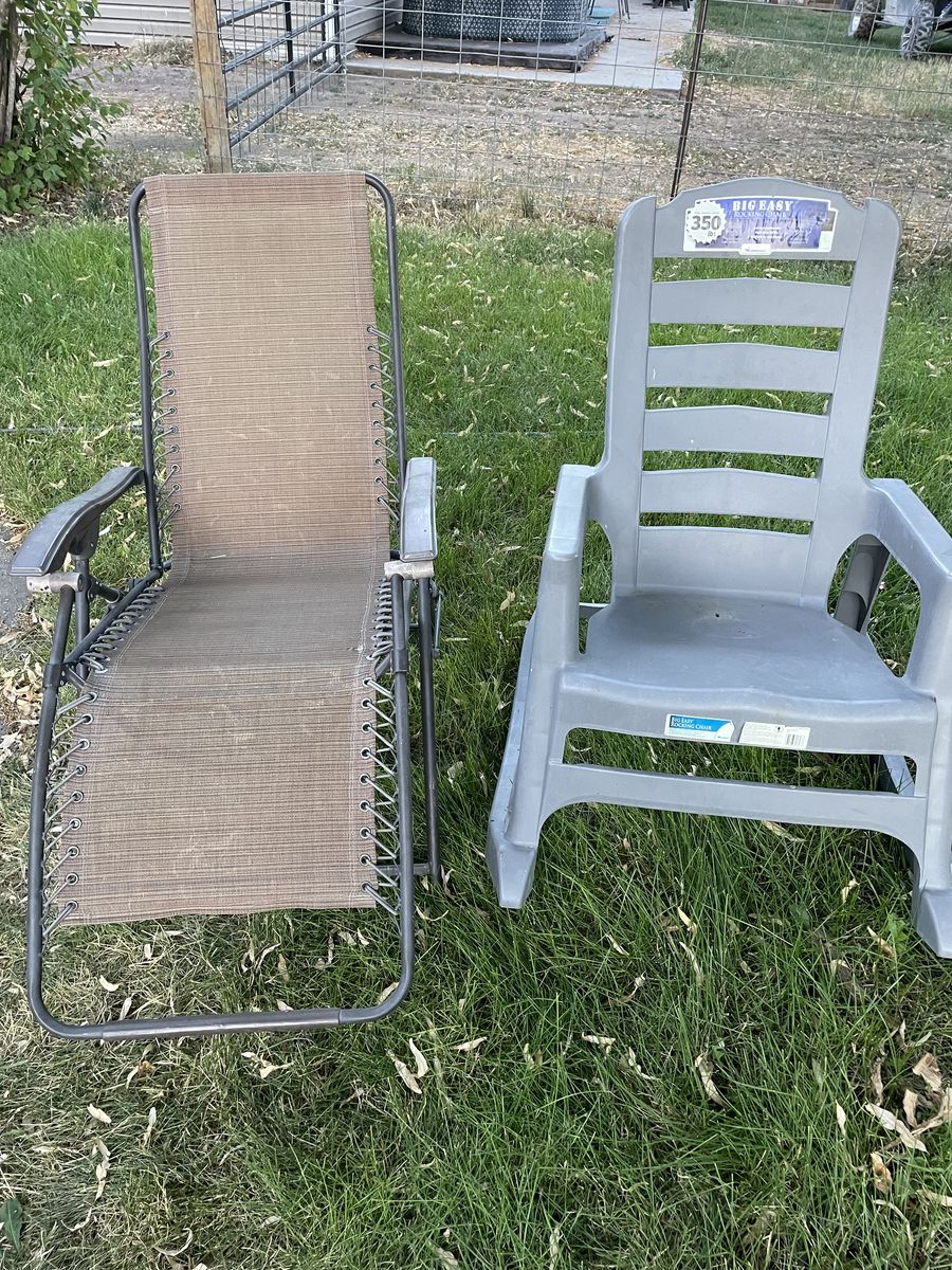 Zelle$15/$20 each or $30 for both. One -piece solid plastic rocking chair supports up to 350 lbs, $15. The other one is a foldable, zero gravity-type chair, $20