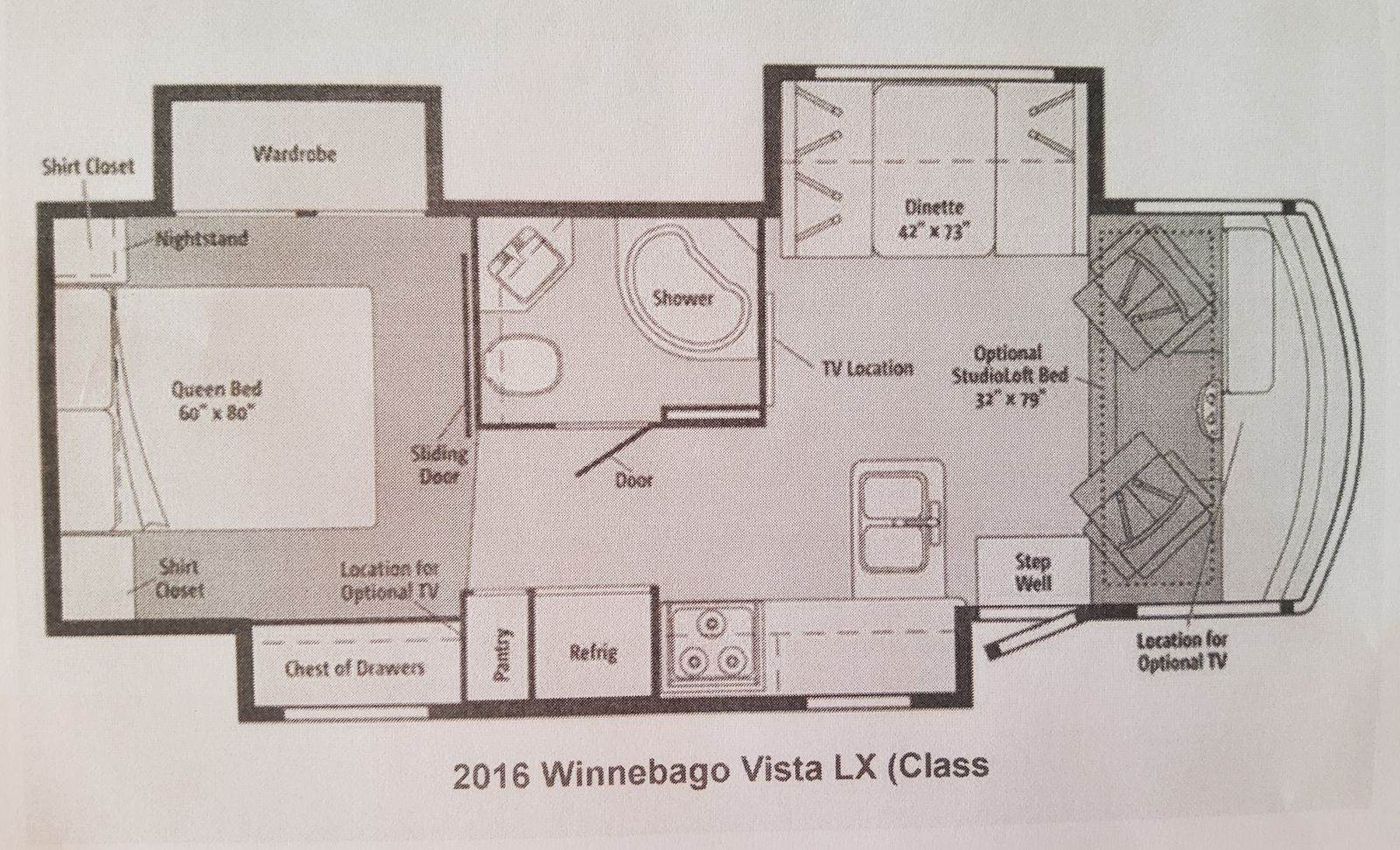 The LX is the premium version of the standard Vista, and includes many exterior and interior upgrades, with just a few listed below. -Full Body Paint, All Original -Nice Norcold Refrigerator, 3-burner Atwood Stove, Whirlpool -Microwave/Convection Oven -3 TVs, one big screen Smart Fire in main area inside, one outside and one in bedroom -Deluxe upgraded cushions and mattress -Auto Leveling Jacks, which are capable of raining the tires off the ground, should the need arise -The Drivetrain, Suspension and Electrical have been completely upgraded. See Below -And of Course, there have been many improvements to, “Make it Our Own”