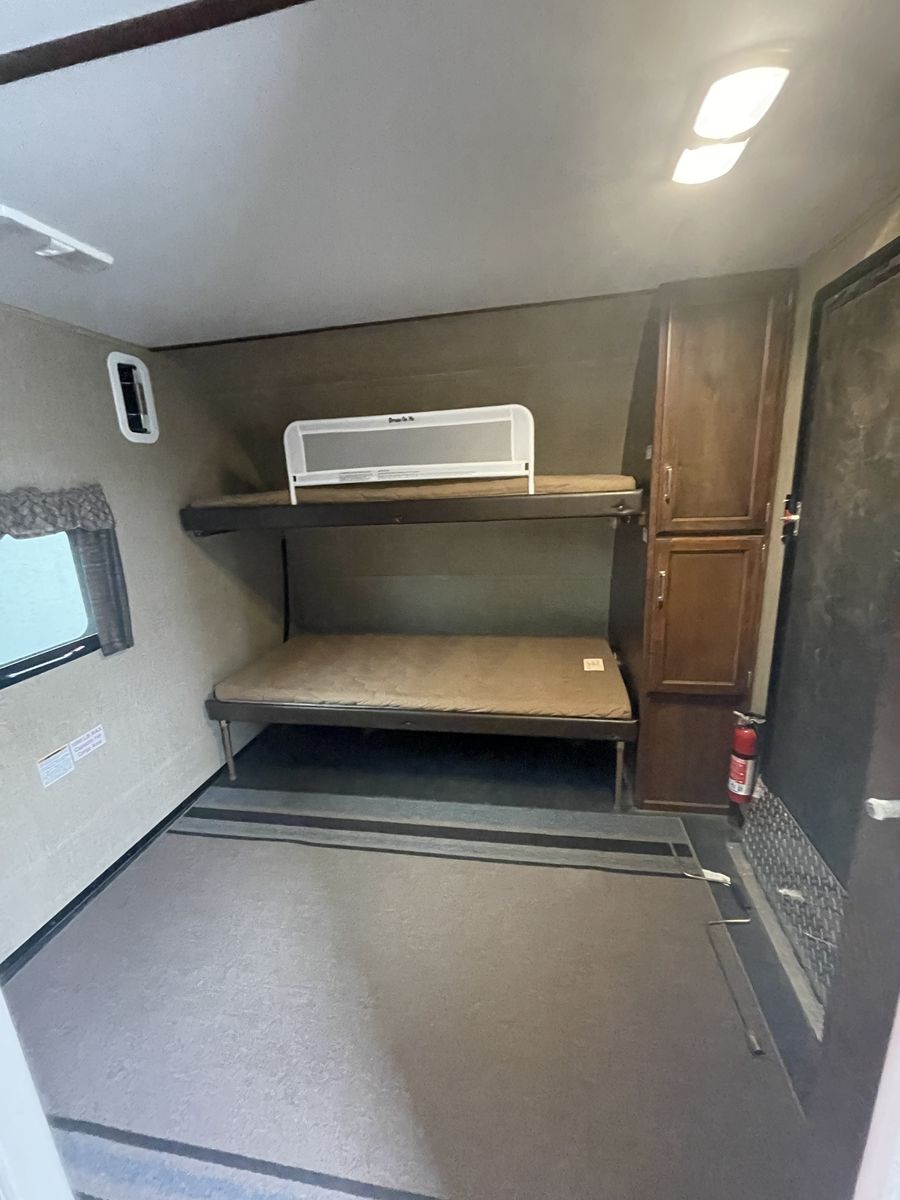 Features: • Rear king bed slide • Front toy garage with side ramp door • Flip-down bunk beds • Sofa sleeper and convertible dinette • Full bathroom with shower • Kitchen with 3-burner stove, large sink, refrigerator, and pantry • TV and overhead storage • Outside camp kitchen with 2-burner cooktop and sink with quick connect to Propane • Exterior storage