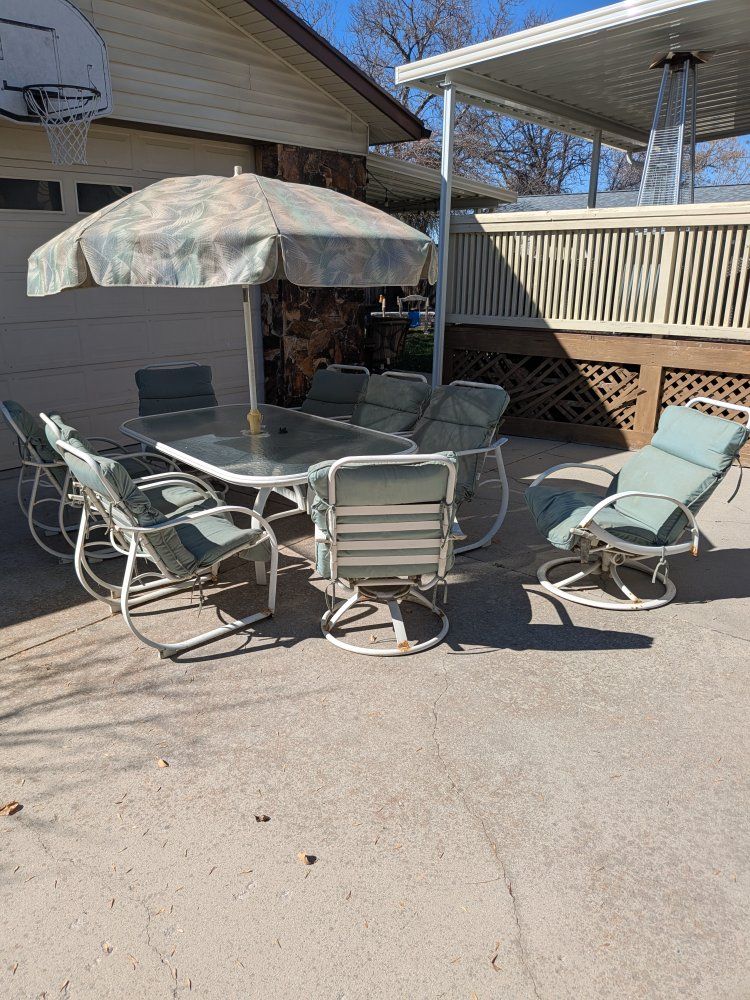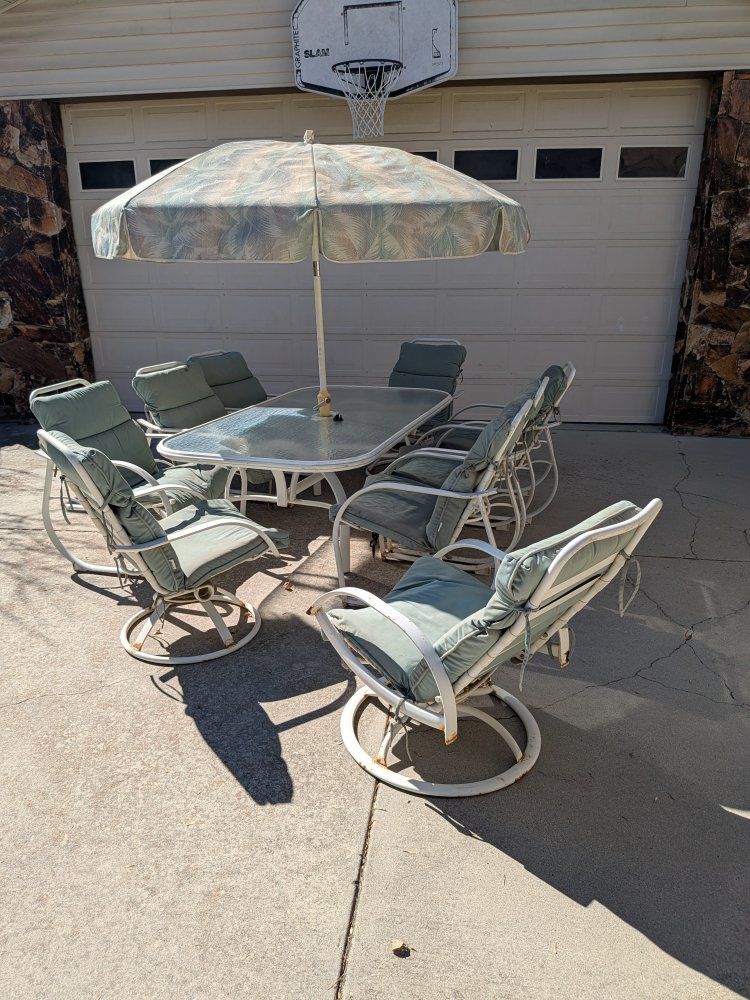 Venmo11-piece patio set: Table, umbrella, 6 side chairs, 2 swivel rocker chairs and one additional large swivel rocker. Good condition, well built!